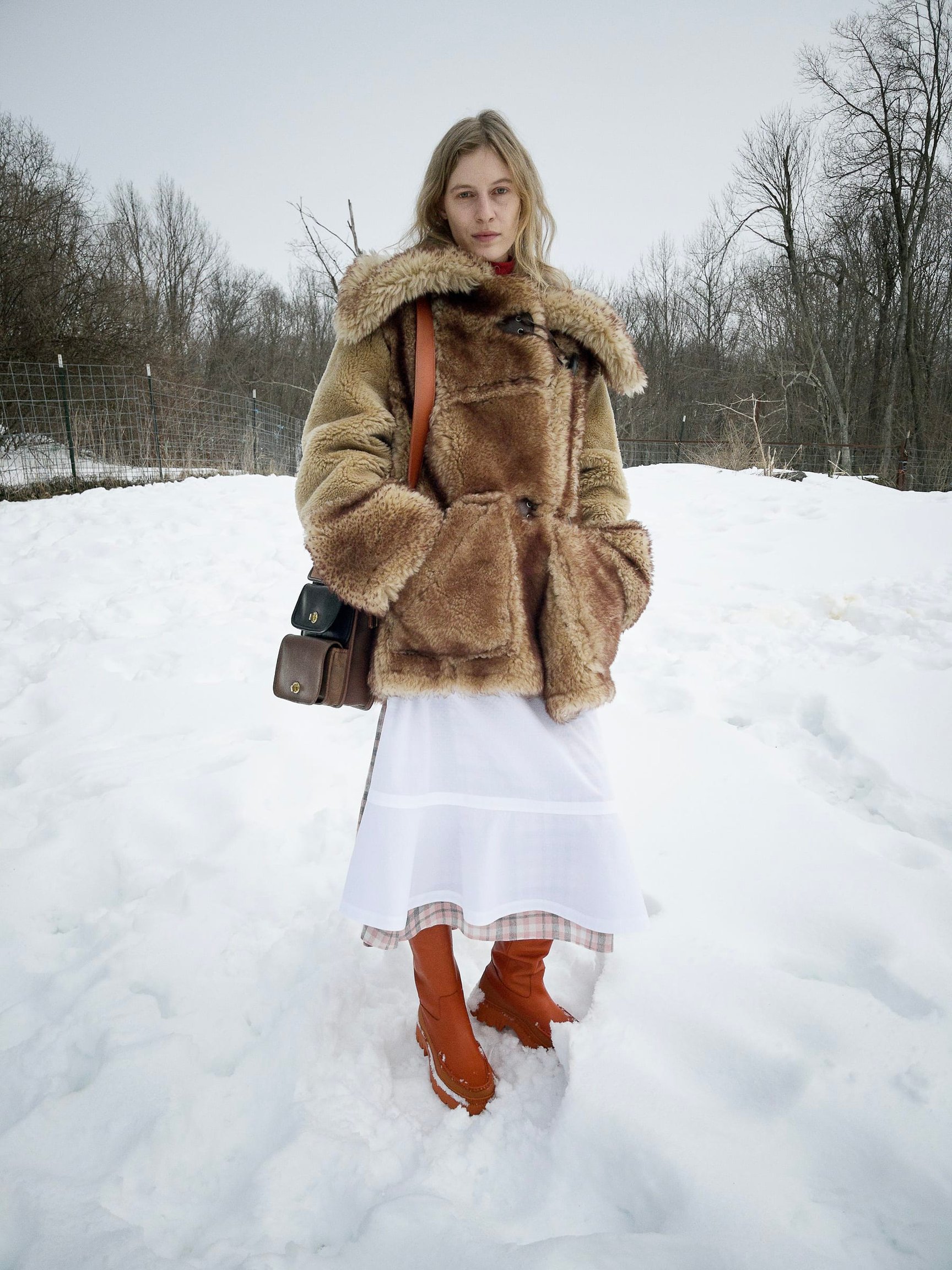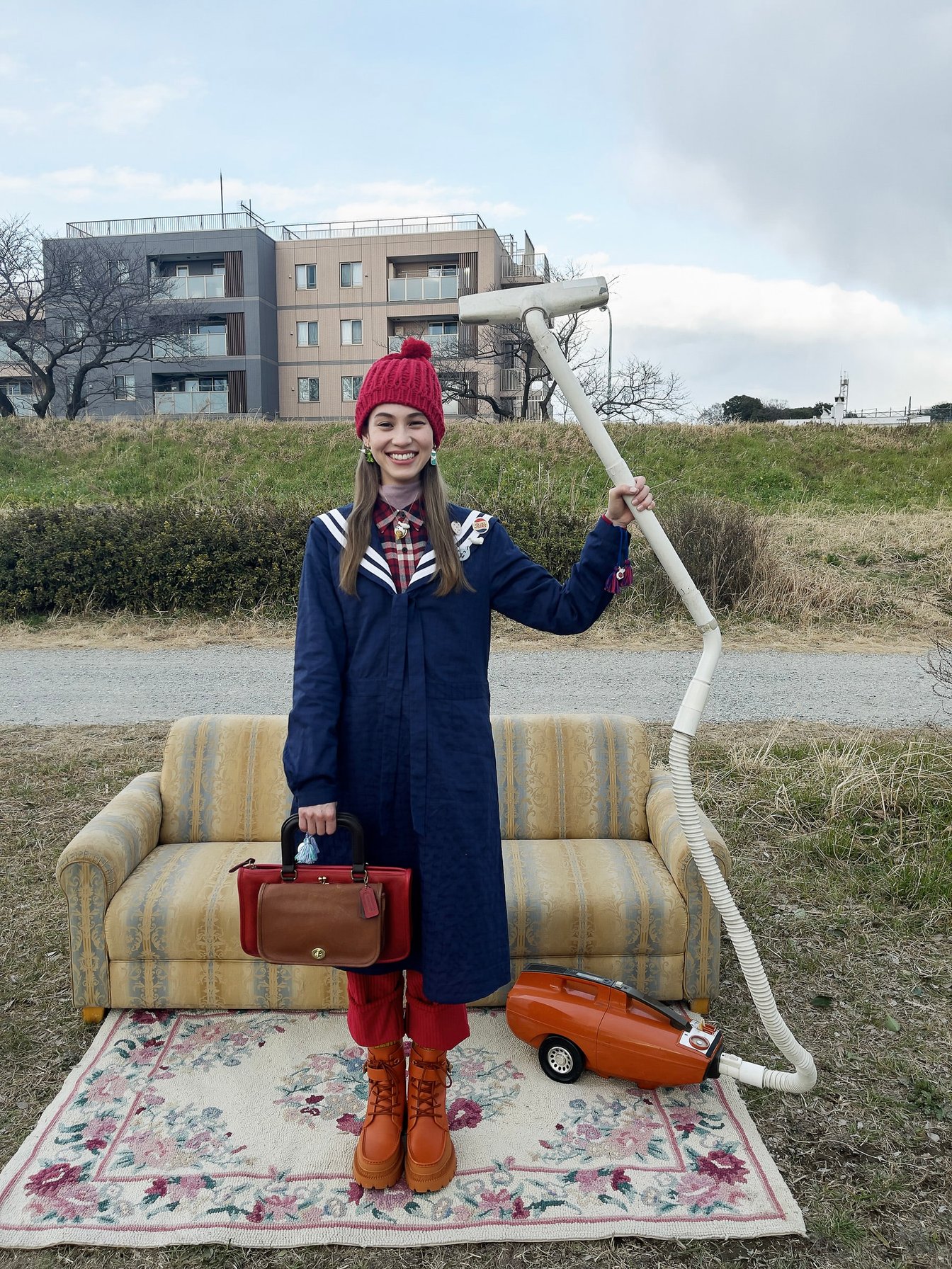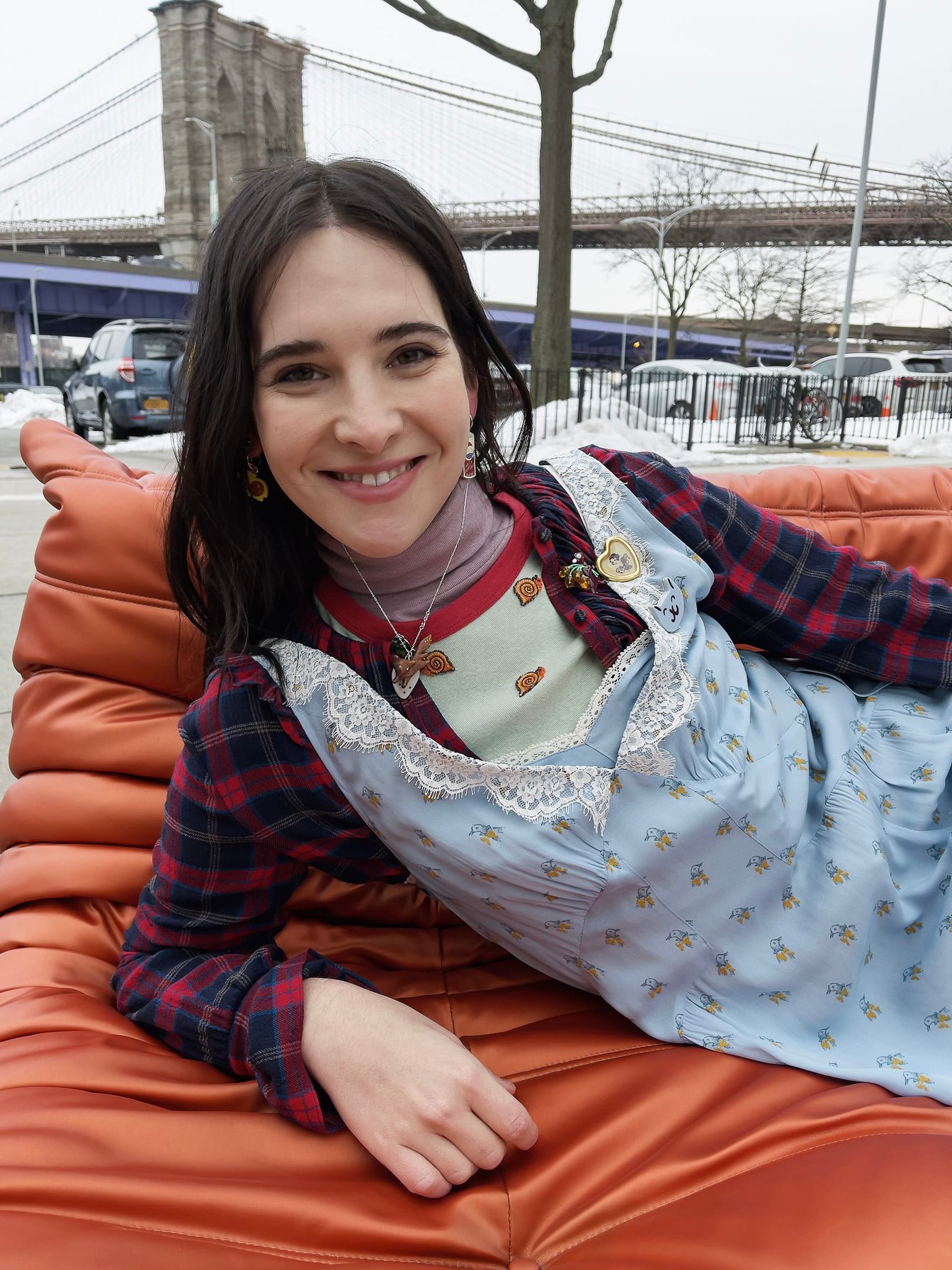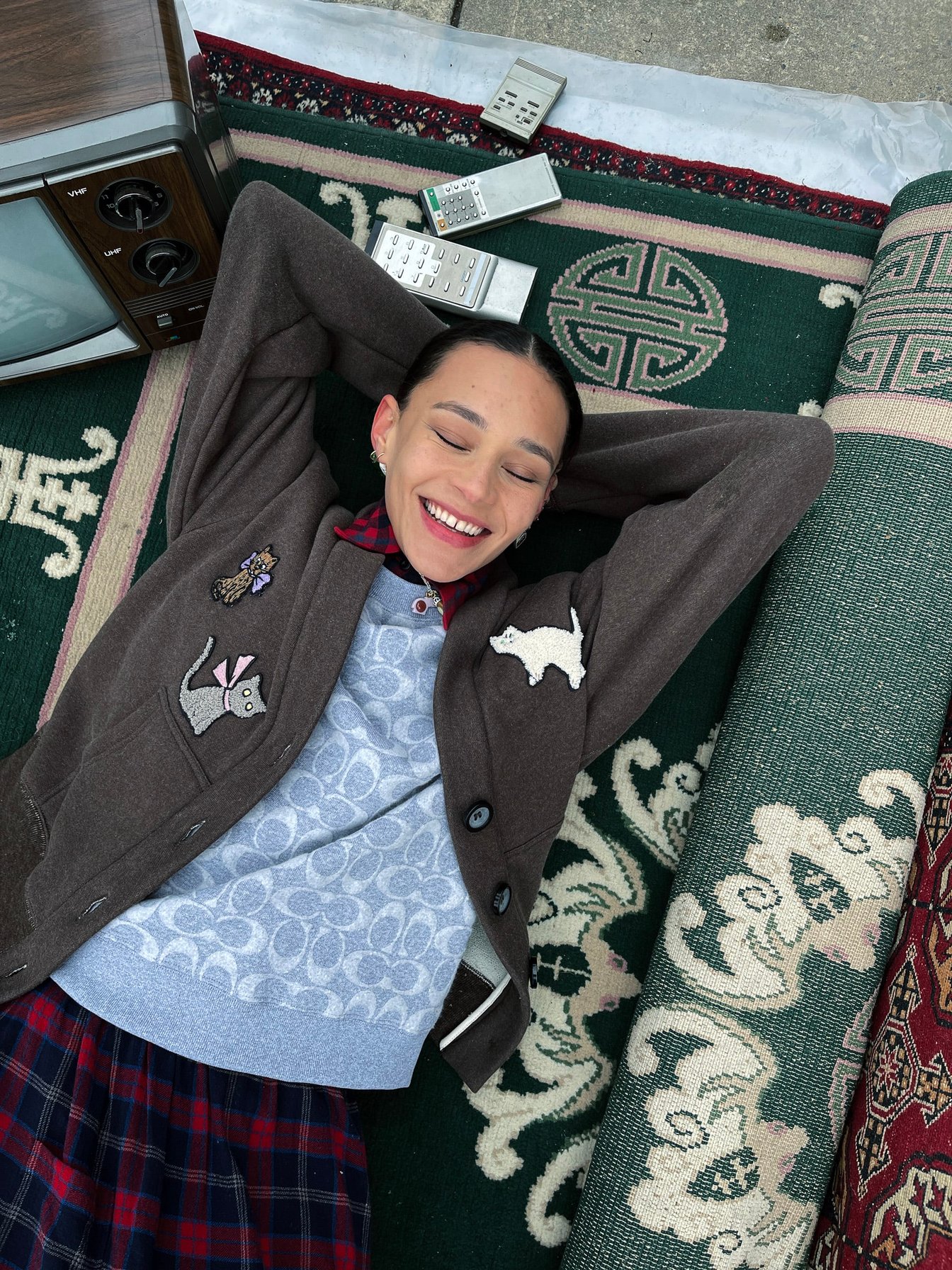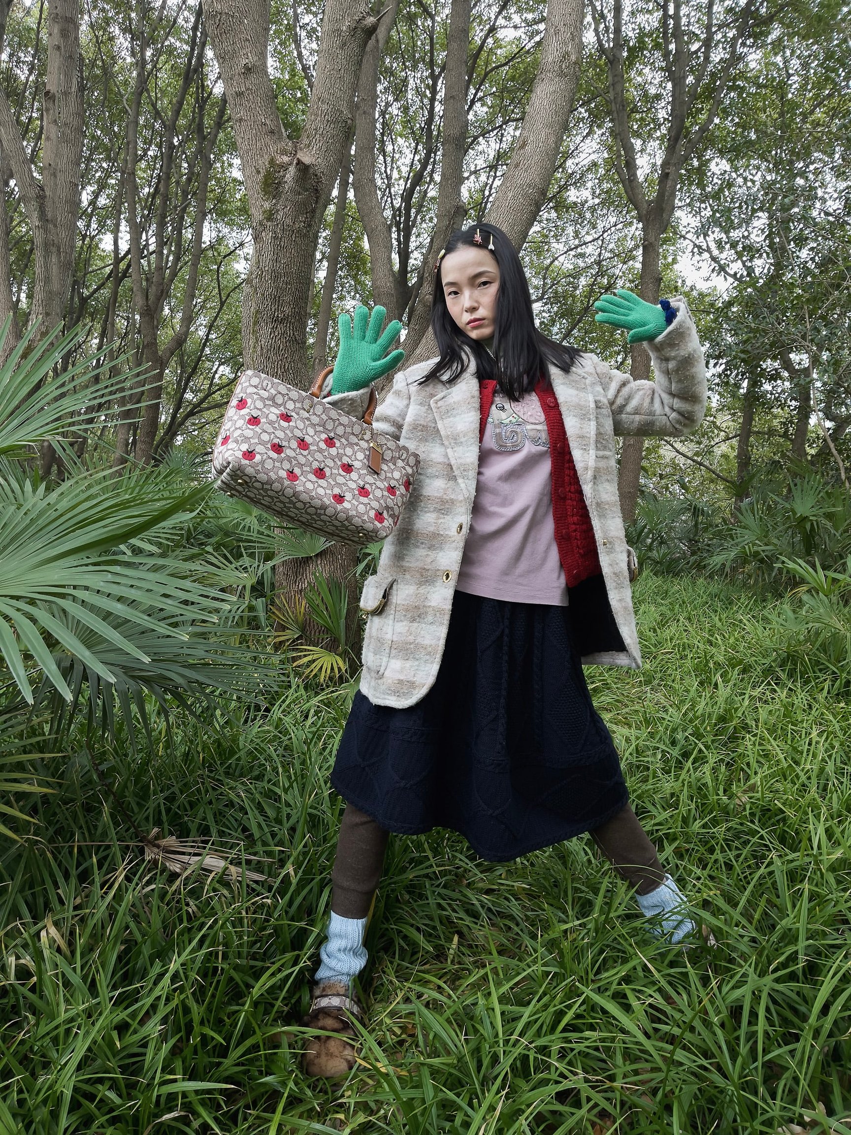 街中にソファや掃除機が置かれるなど、室内と屋外が入り交ざったロケーションでの撮影。各々がまとうのは、家着としても活躍しそうなコンフォータブルな服でありながら、そのまま外出もできるようなスタイル。Tシャツの上にネルシャツ、ヴィンテージ風ドレス、さらには手袋や分厚い靴下をレイヤードするなど、重ね着によるルーズなシルエット、そしてウェアやアクセサリーに施された生き物の刺繍が、コレクションに温かみを加える。ドレスやジャケットに付けられたヴィンテージ風のピンバッジもノスタルジックに映る。