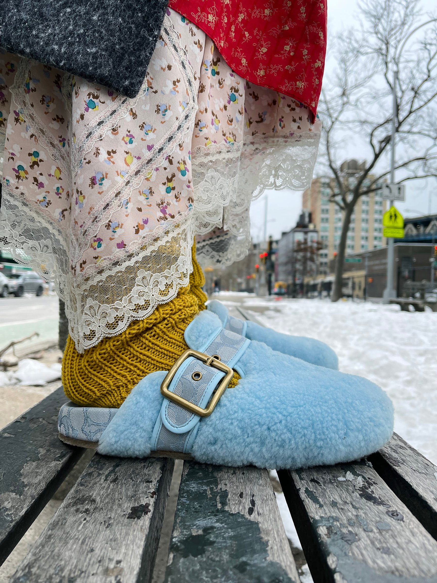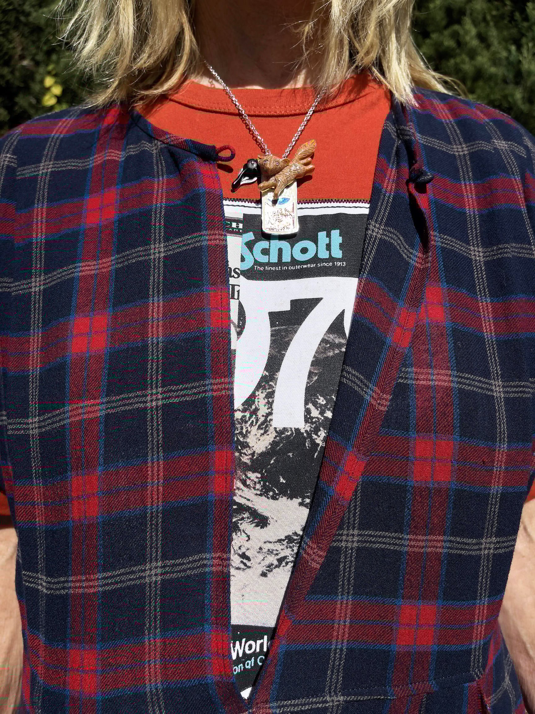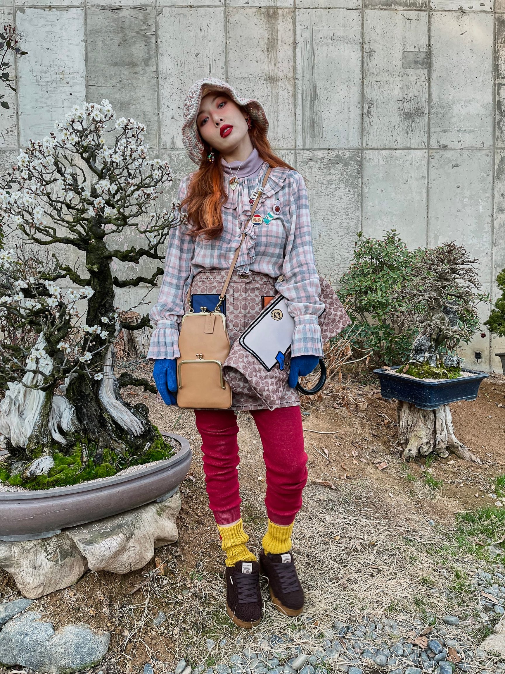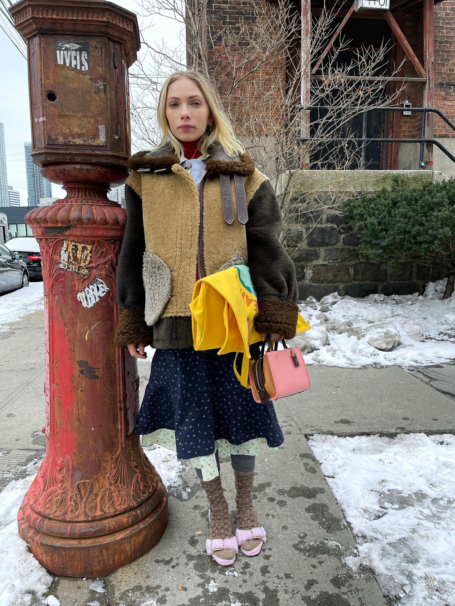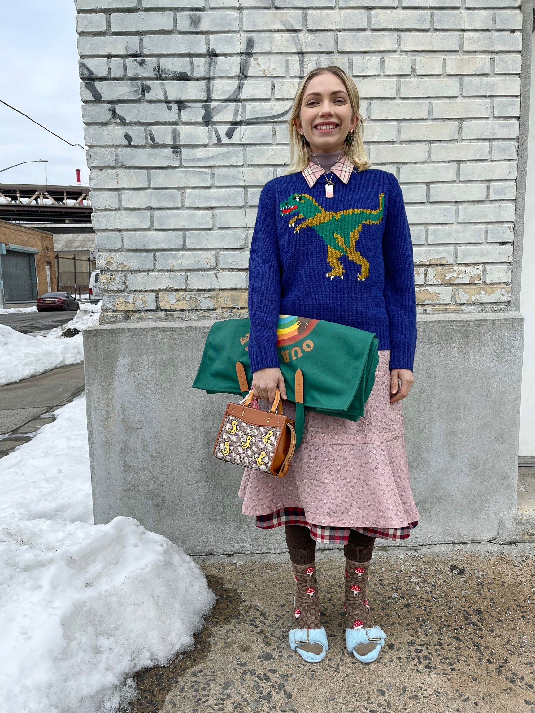 街中にソファや掃除機が置かれるなど、室内と屋外が入り交ざったロケーションでの撮影。各々がまとうのは、家着としても活躍しそうなコンフォータブルな服でありながら、そのまま外出もできるようなスタイル。Tシャツの上にネルシャツ、ヴィンテージ風ドレス、さらには手袋や分厚い靴下をレイヤードするなど、重ね着によるルーズなシルエット、そしてウェアやアクセサリーに施された生き物の刺繍が、コレクションに温かみを加える。ドレスやジャケットに付けられたヴィンテージ風のピンバッジもノスタルジックに映る。