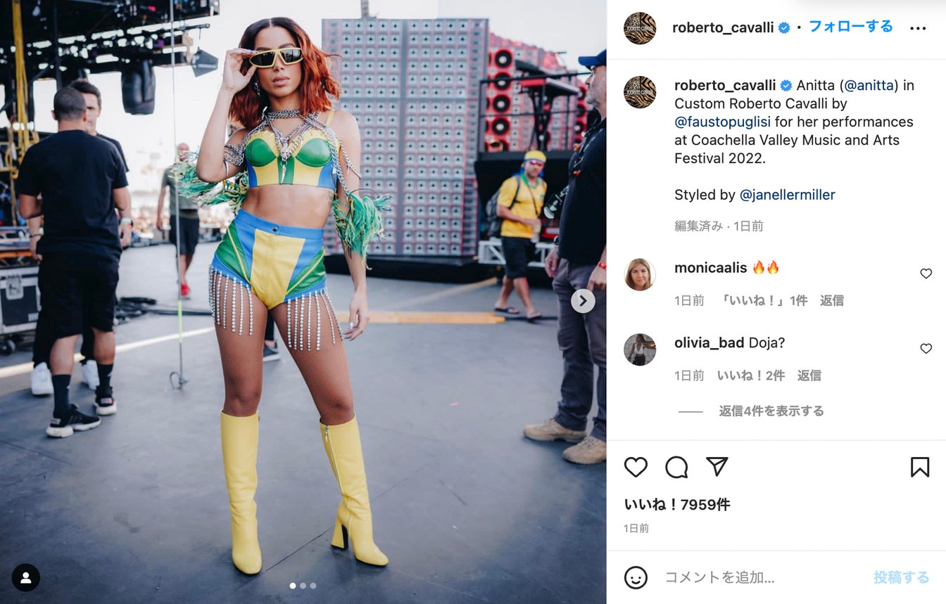 地元ブラジルで大ブレイクして以来、ラテン・アメリカの音楽シーンをリードするアーティスト アニッタは、「ロベルト・カヴァリ(Roberto Cavalli)」のホットパンツとバンドゥトップスを着用。ブラジル国旗を彷彿とさせるカラーリングで、情熱的なパフォーマンスに華を添えました。