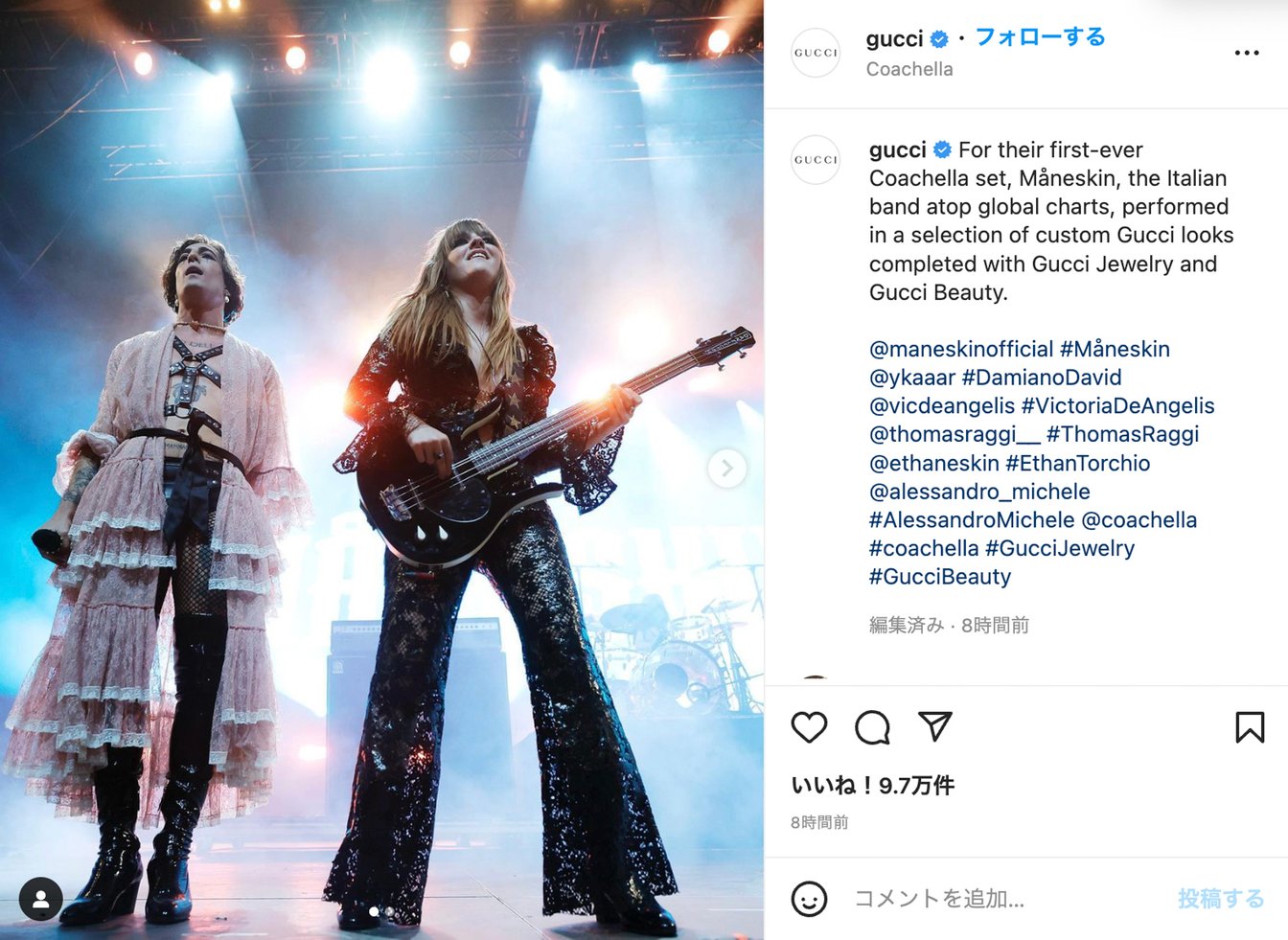 アバやセリーヌ・ディオンを輩出した「ユーロビジョン・ソング・コンテスト」でのパフォーマンスをきっかけに世界中が虜となった、今最も勢いのあるイタリアのバンド マネスキン。着用衣装は「グッチ」のカスタムピース。セクシーで、グラマラスで、エレガントな彼らの世界観とマッチしていますね。