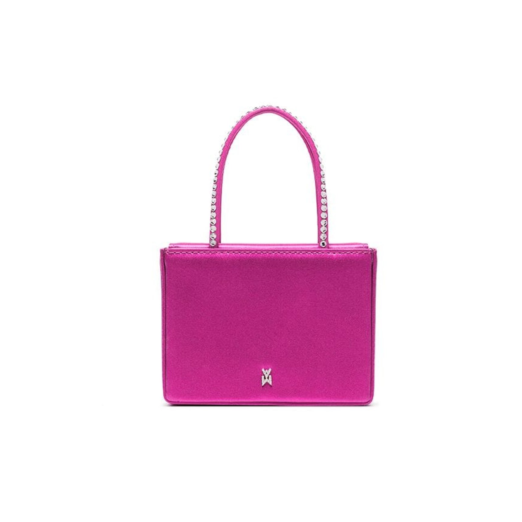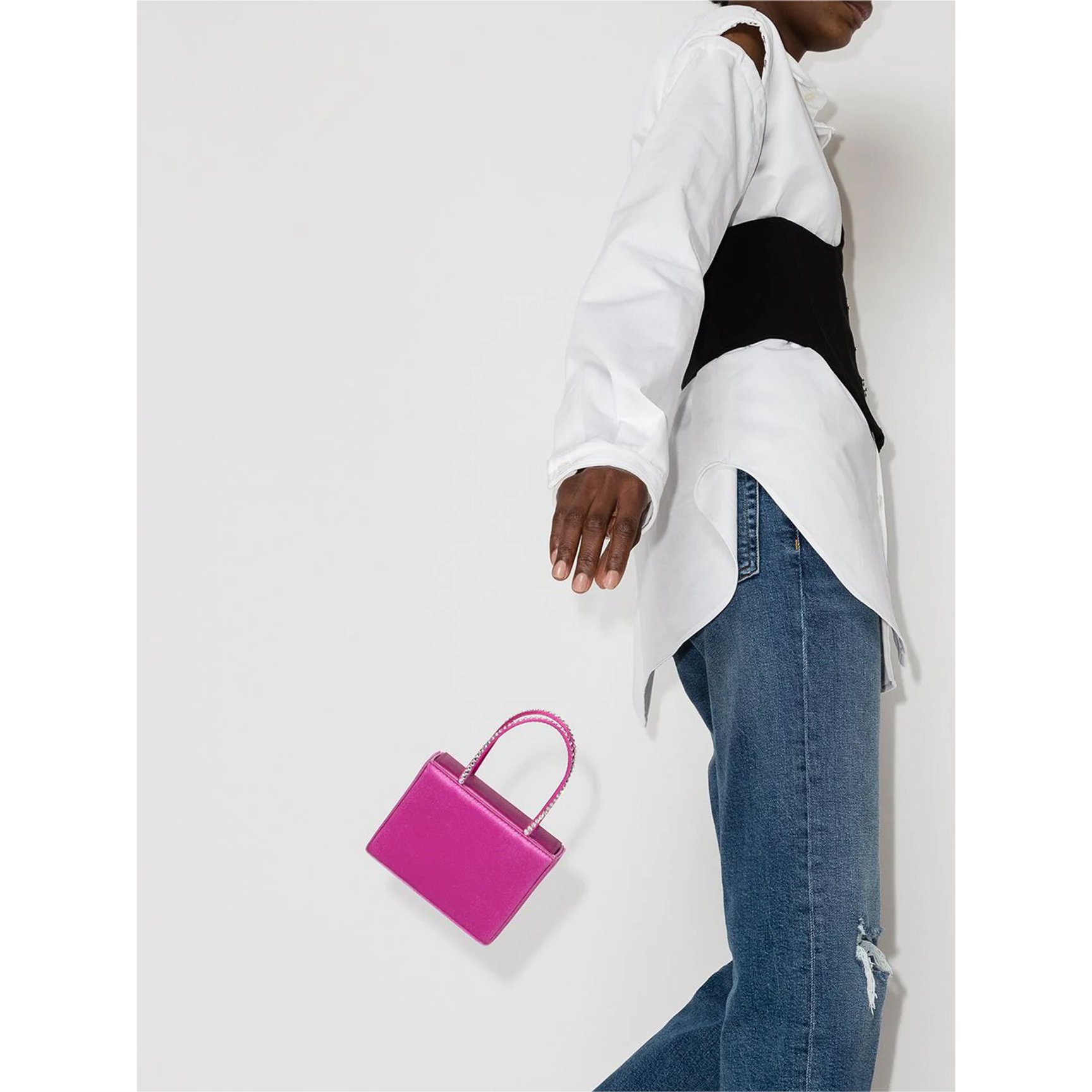ショッキングピンクが女性らしさを引き立てるミニバッグは「アミナモアディ(Amina Muaddi)」のもの。高さ9cm、幅12cmとかなりのミニサイズなのでパーティー使いなどにおすすめ。裏地はレザー100%、表地はクリスタル・サテン100%と高級感漂うデザイン。