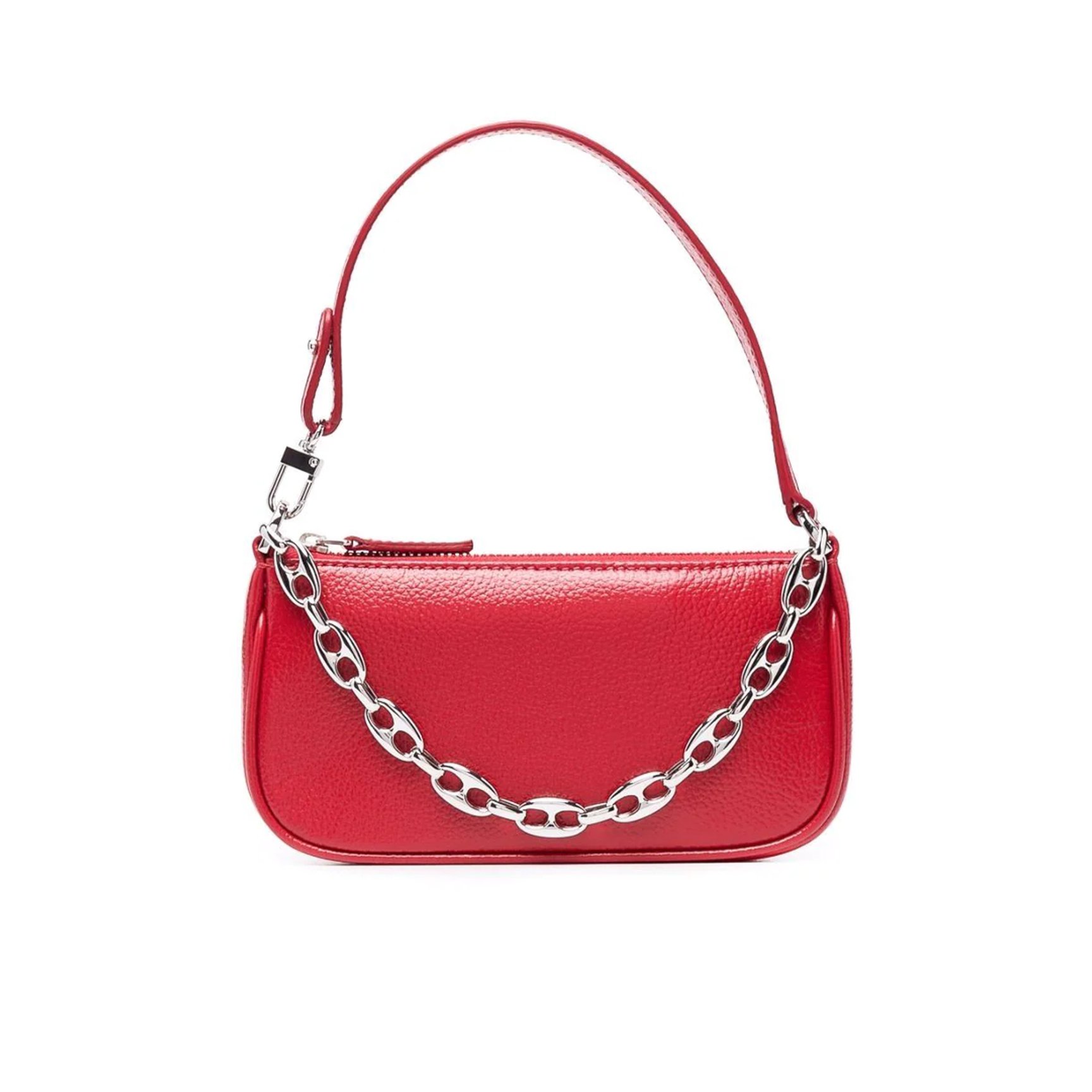 「バイ ファー(BY FAR)」のショルダータイプミニバッグ。表地はラムスキン100%使用の真っ赤なデザインが一押しポイント。シルバートーンのチェーンがプラスされ、一気に洗練された印象を与えます。