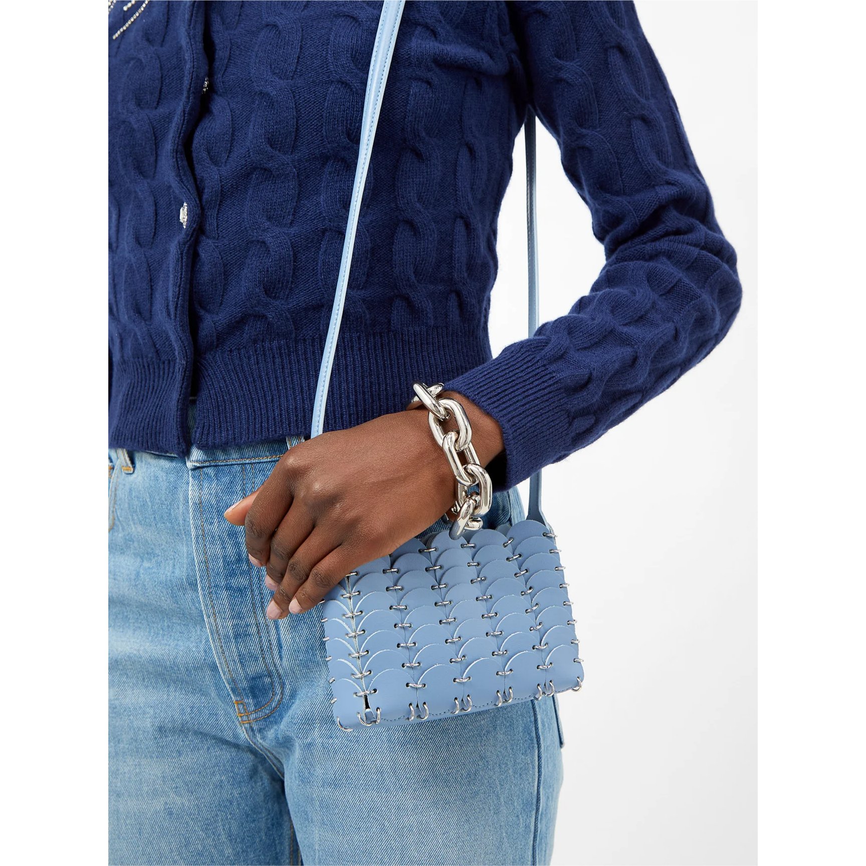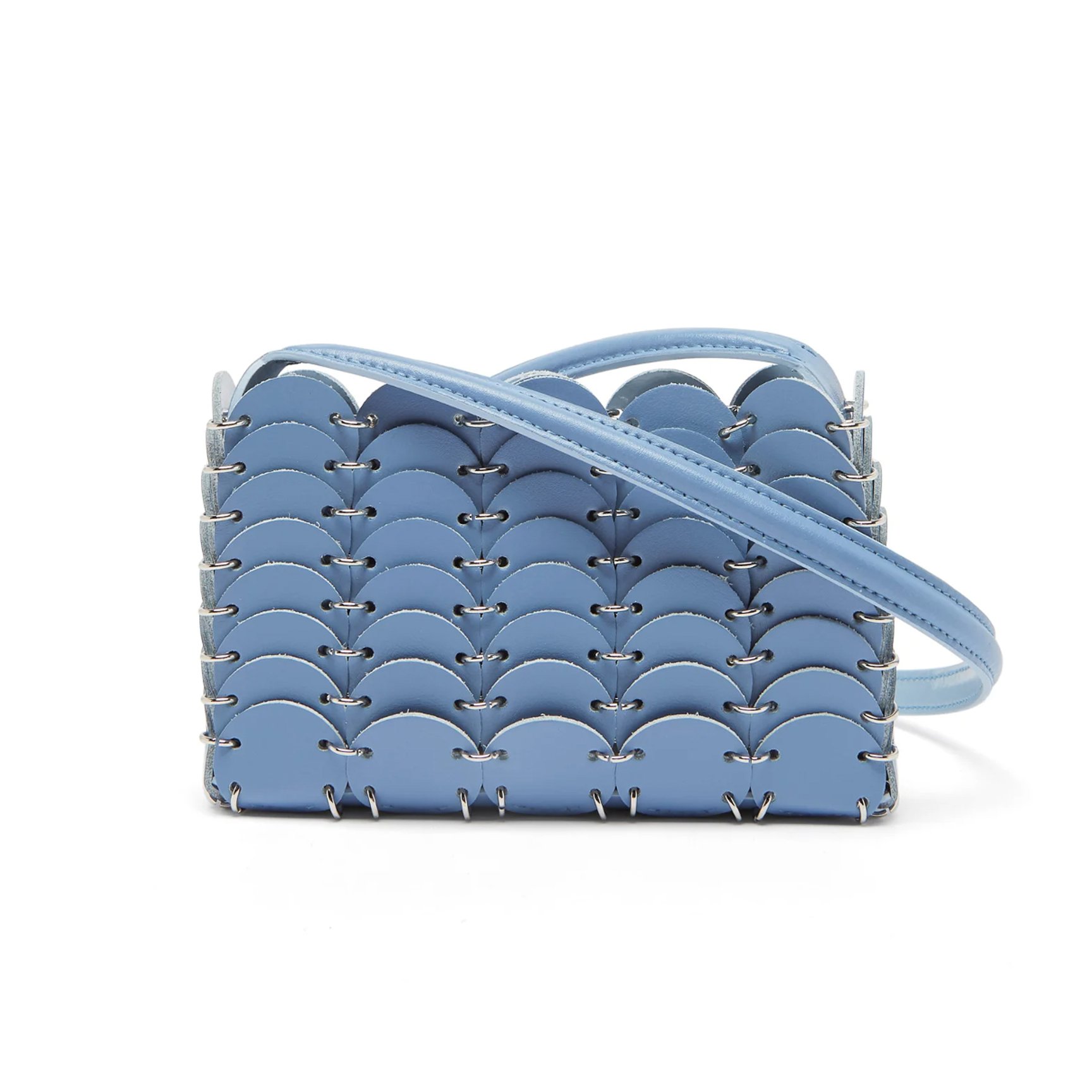 レザーディスクを精緻に配し、マーメイドの鱗のような独特なデザインを叶えたミニバッグは「パコ・ラバンヌ(PACO RABANNE)」のもの。モノトーンコーデに映えるだけでなく、他の色使いを邪魔しない彩度低めのパウダーブルーカラーがおすすめポイント。高いデザイン性なので、ミニバッグながらも存在感を放ちます。