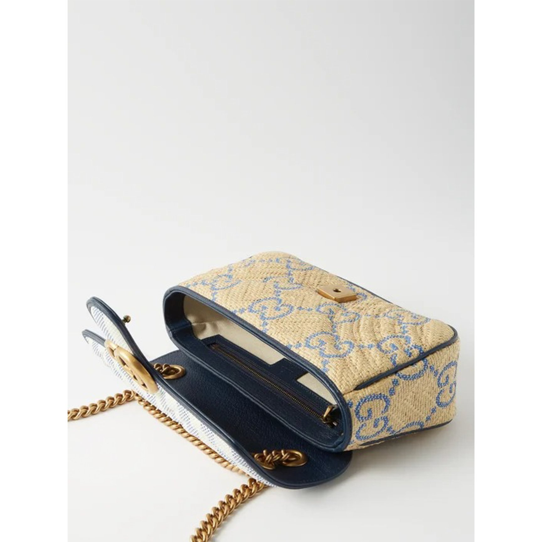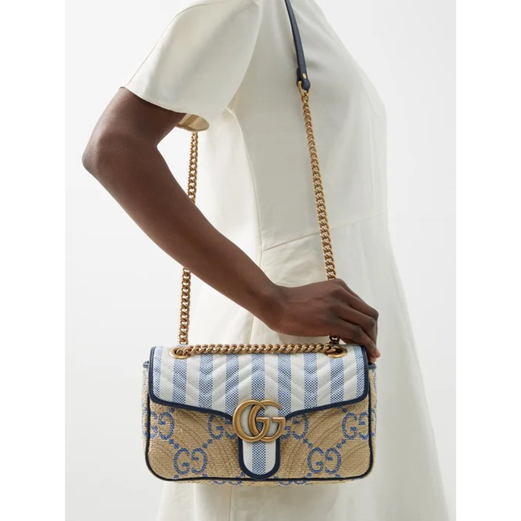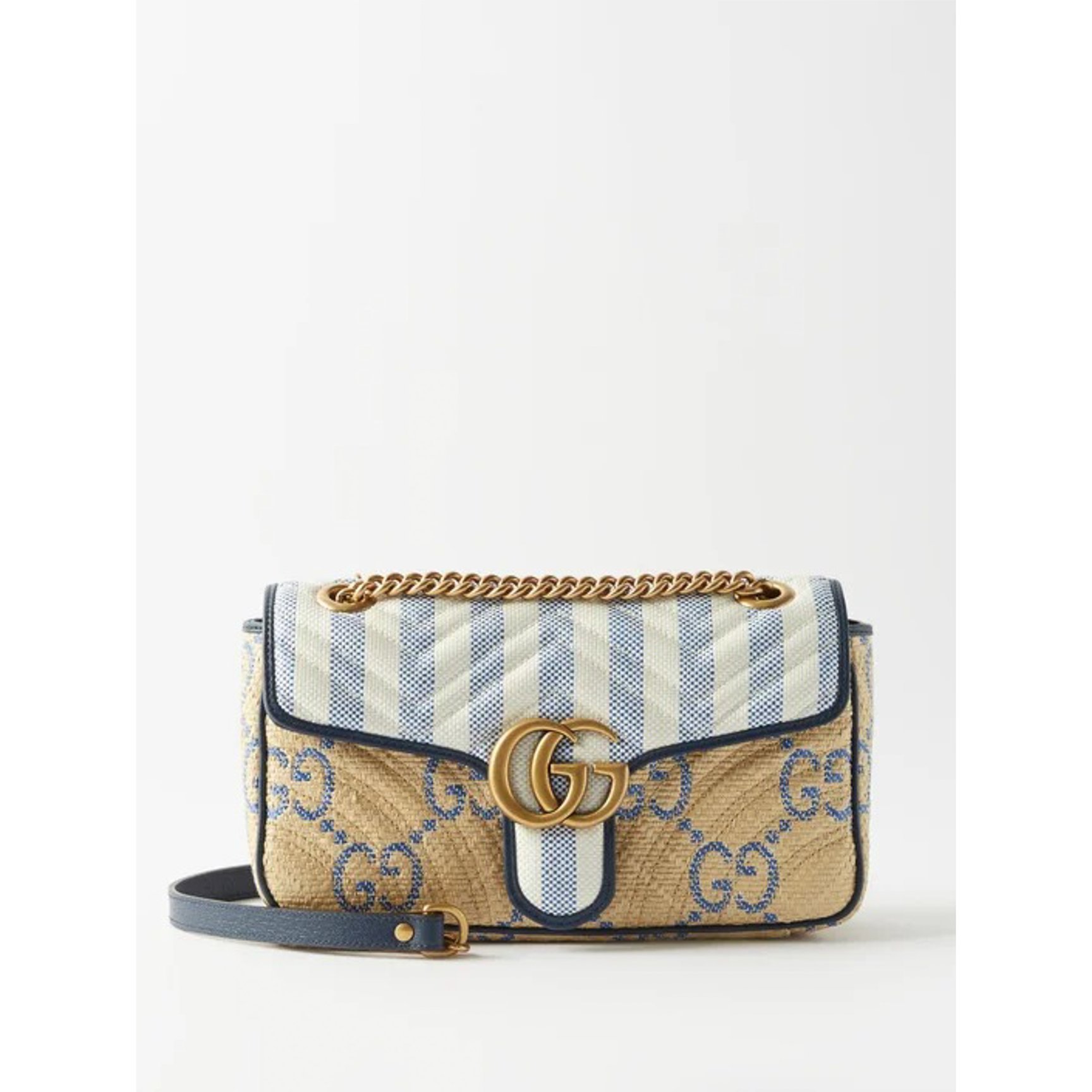 爽やかなブルー×ホワイトのストライプと、フェイクラフィアの素材感が夏の訪れを感じる「グッチ(GUCCI)」のGGマーモントショルダーバッグ。ゴールドのチェーンとロゴのハードウェアが、ラフに寄りすぎないグラマラスな表情に仕上げています。