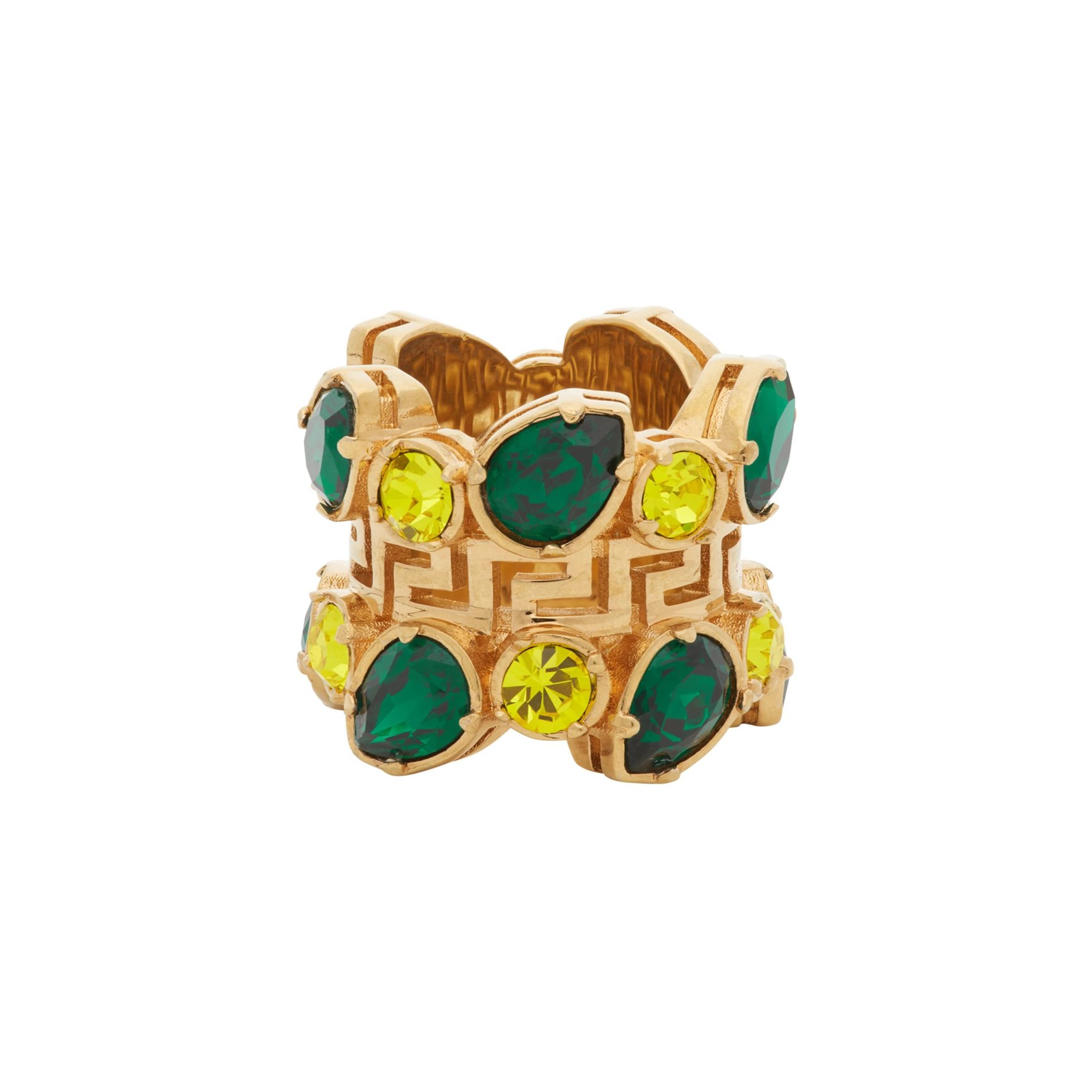 「ヴェルサーチェ(VERSACE)」のゴージャスなゴールドリングです。ブランドのシグネチャーである、直線的なグリーク・キーデザインに、カットの美しいグリーンのクリスタルが映えます。どこかアンティークジュエリーのような風合いも。