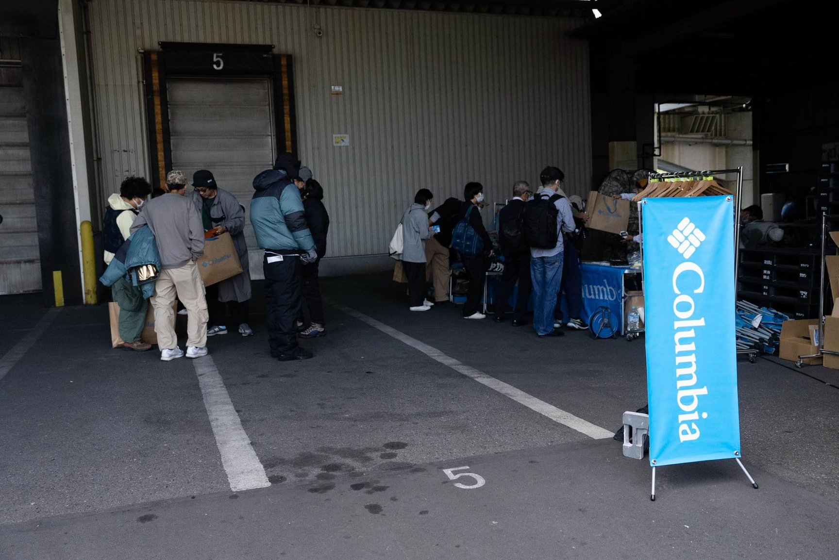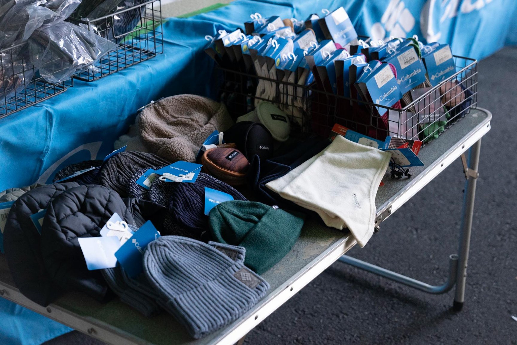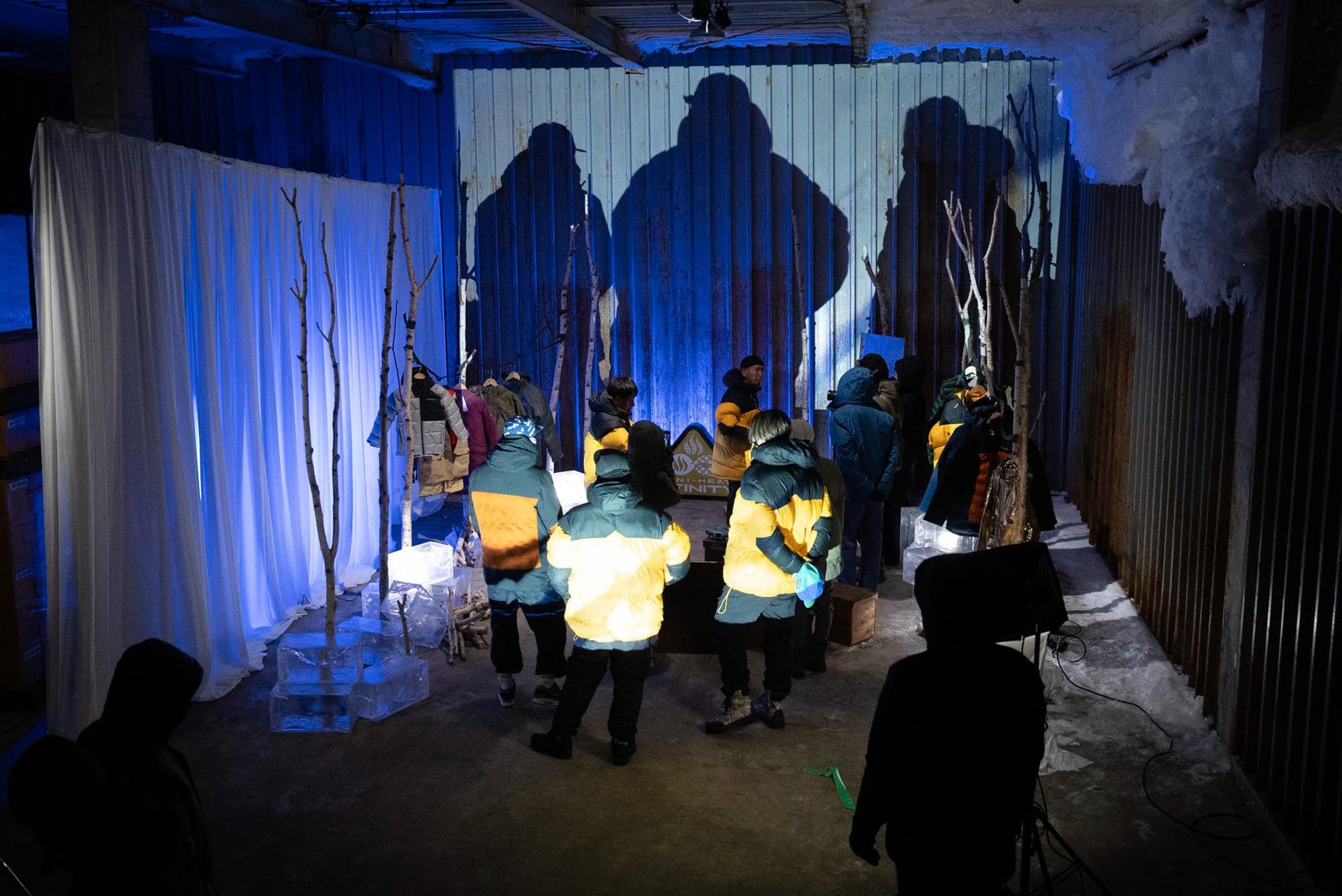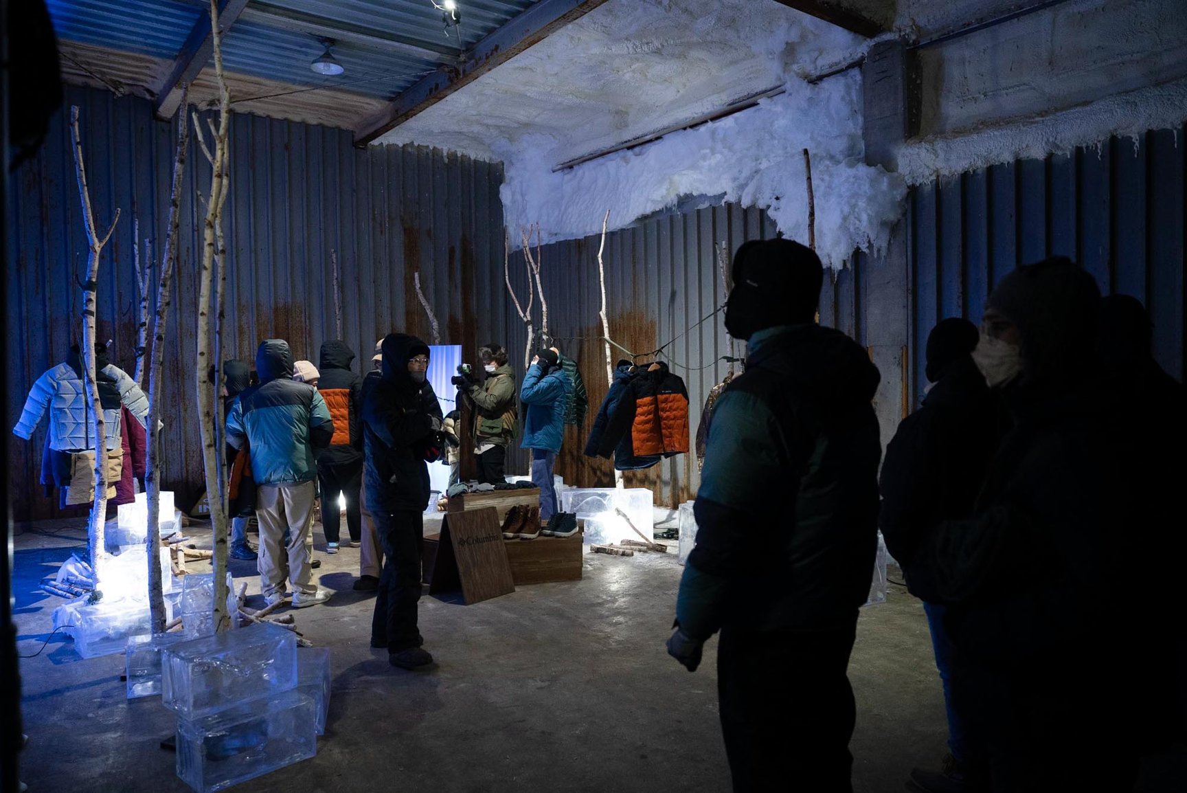 展示会の会場は、中外倉庫運輸の冷凍倉庫。普段は冷凍食品などを扱っていて、温度は−20〜30度に設定されているそうです。事前に「極力暖かい服装で来てください」と連絡をもらっていましたが、受付では来場者用のダウンのほかに、帽子、手袋、ブーツをはじめ、トップスやパンツも用意されていました。