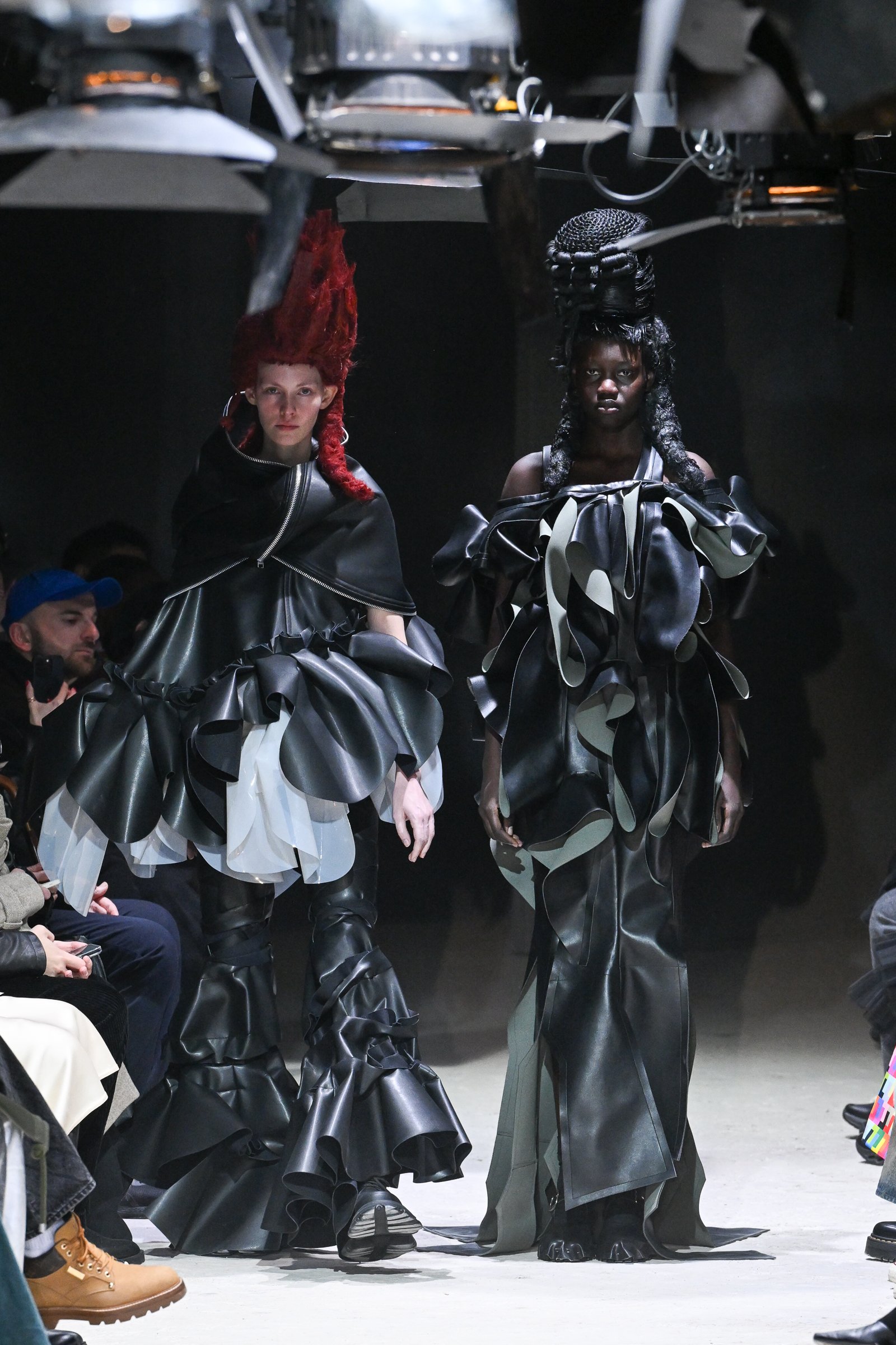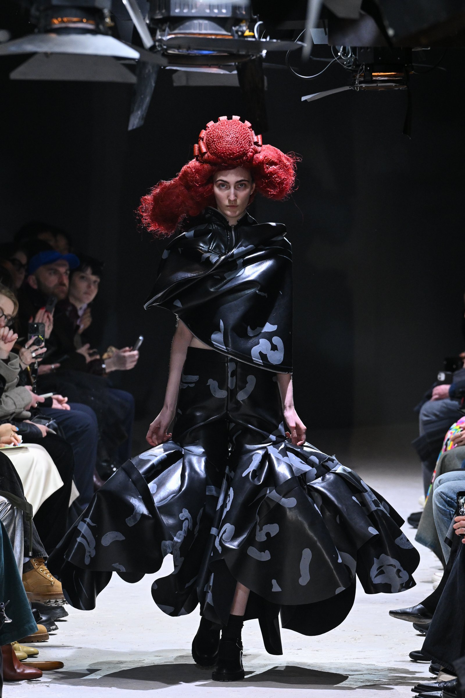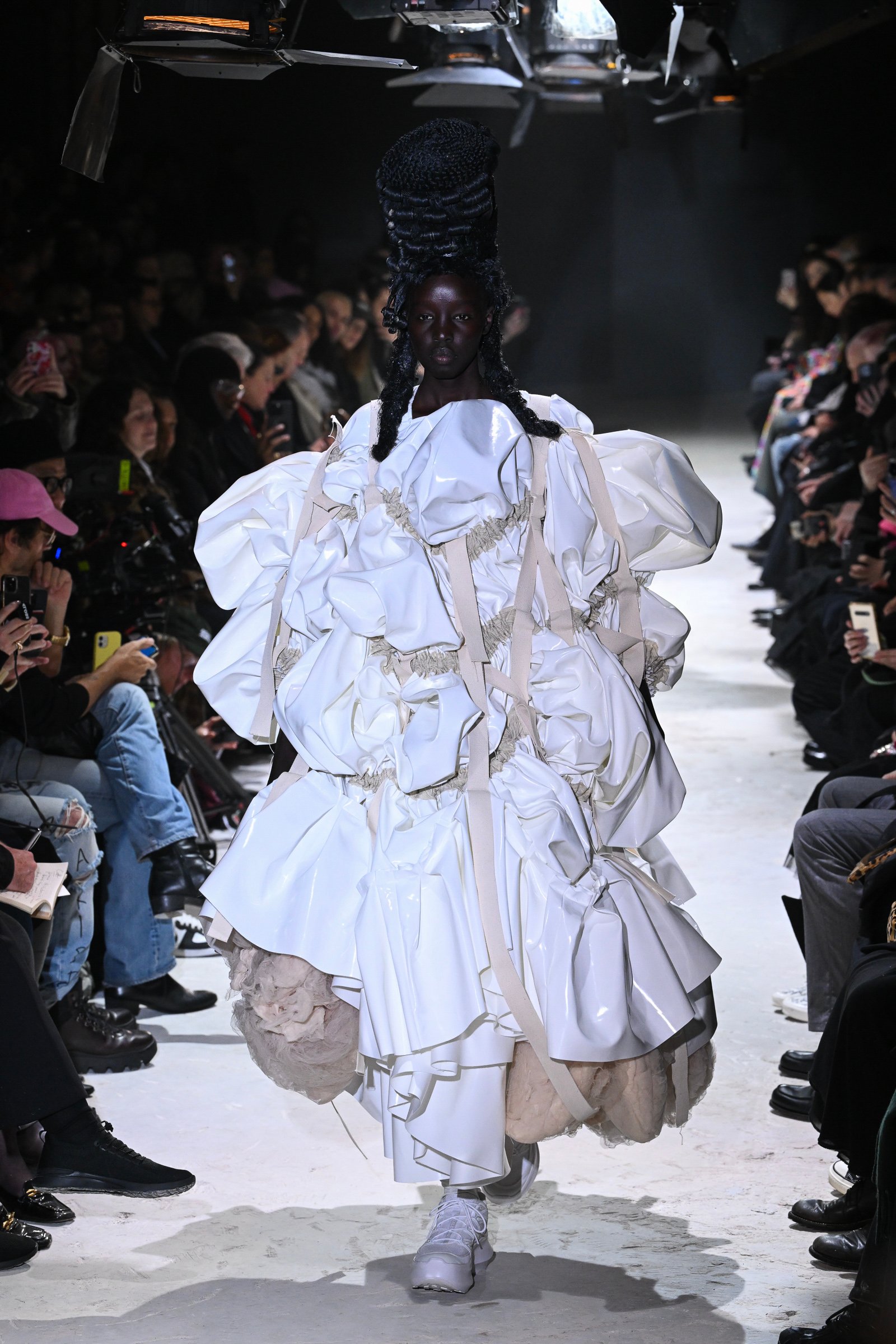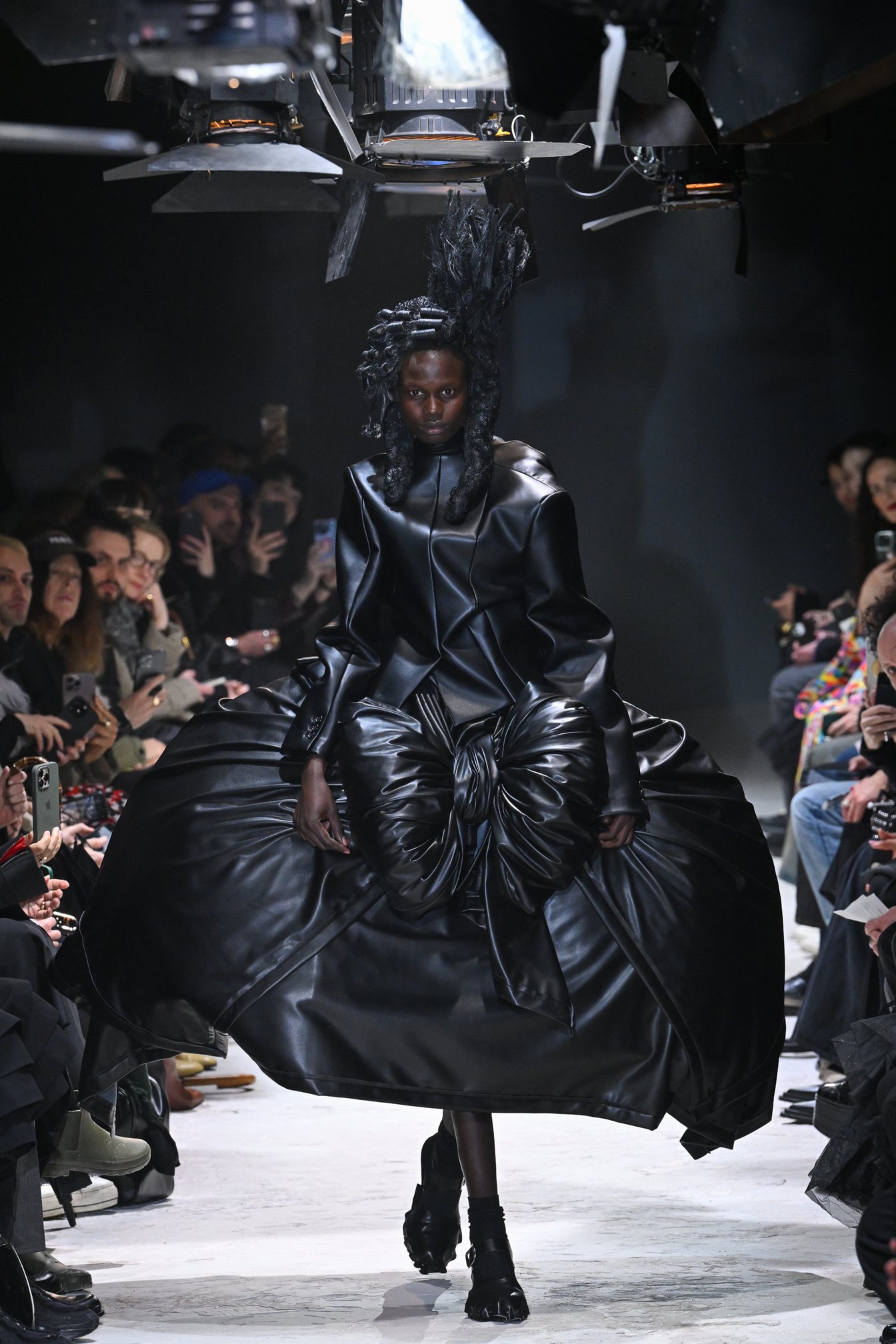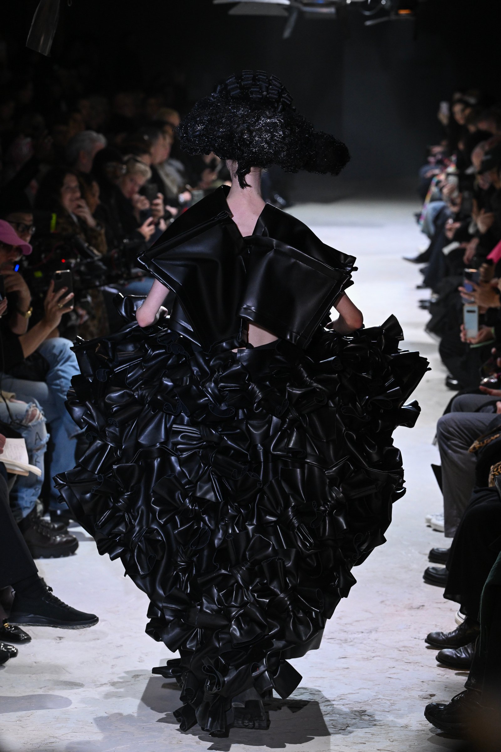 やっと人々がシートにつき、ショーがベートーヴェンのピアノソナタ「月光」とともに始まった。人工レザーを使用した大きな黒い塊のような歪なフォルムをもつドレスをまとったモデルが静かに歩みだす。この人工レザー素材は質感を変えながらショーの全ルックに使用されていた。ポンパドール風に結い上げられたヘアウィッグ(ARAI TAKEO)がドレスのフォルムに共振するように上に横に、無作為にそびえる。