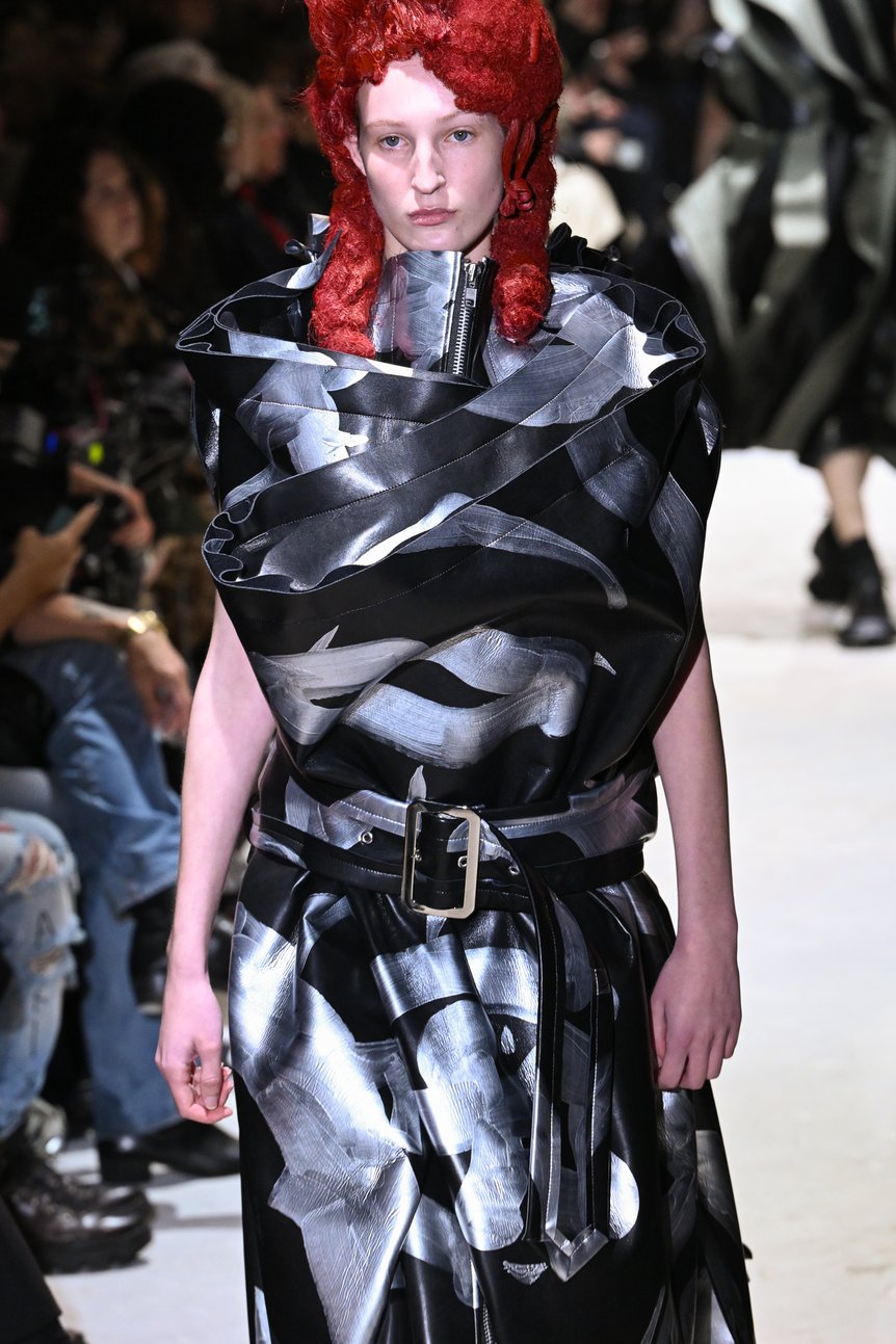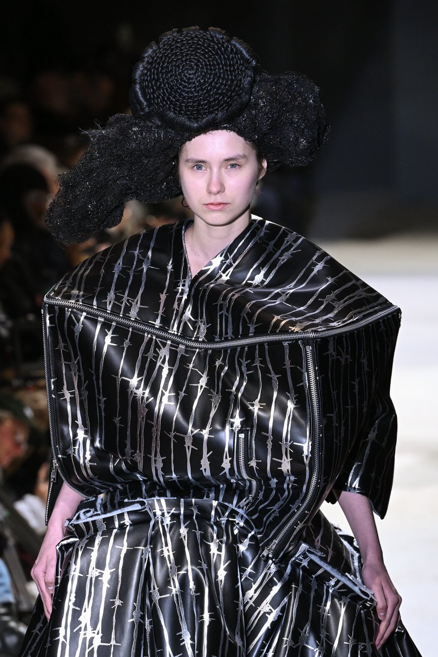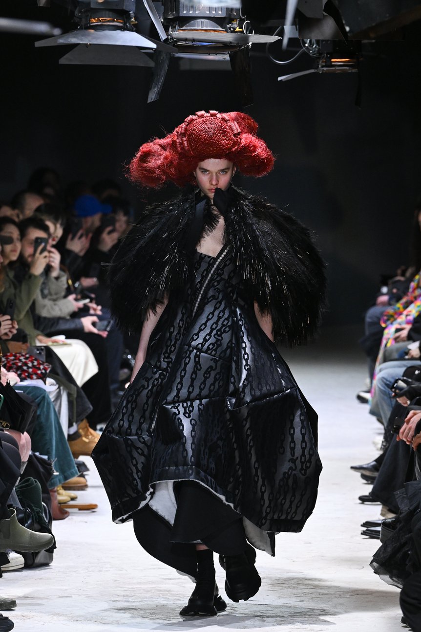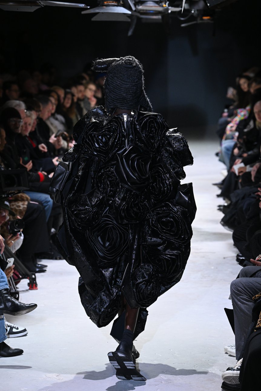 川久保さんは「見たことのない新しさ」を常に目指しながら、経験を積めば積むほどそれが難しくなってくる、とここ数年何度も語っていた。しかし、その「苦しさ」が独自の方法論となり、誰にも到達できない「新しさ」を生むことにもつながってきた。では、今回はその流れがさらに難しさを増し、思うようにならない自身への込み上げる「怒り」に達したのか。一方で、世界に目を移せば、戦争の悲惨さは終わりの見えない状況にはまり込んでいる。憤りと寄る辺のない感情が渦巻く。無力感、苛立ち、不安。私たちはそれらの感情から、目をそらして何もなかったかのように日常をただやり過ごしてはいないだろうか。さまざまな感情を突きつけてくるモデルたちのアクションは、川久保さん自身に、そして私たちすべての生き方に対して、深く荒々しい問いを投げかけるものであった。