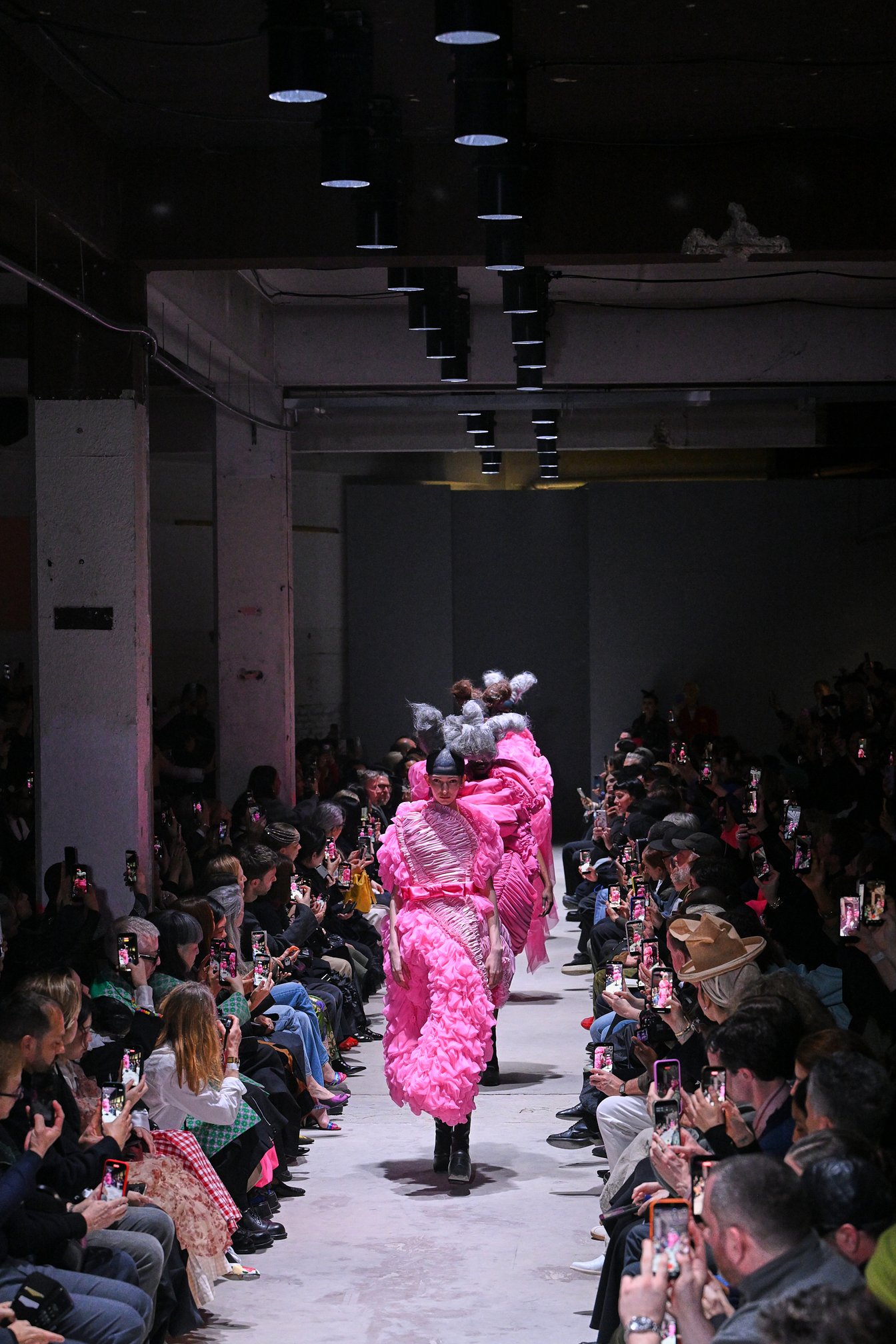 統一したテーマのコレクションで、唯一の例外となったのが、音楽が途切れたショーの中盤。無音の中、ピンクのドレス6体が登場した。よく見ると、序盤に登場した黒のドレスと同じデザインをピンクに変え、スタイルを呼応させている。対比によって黒を際立たせ、また影の反対側にある光の存在を表し、希望を見出すようなシーンとなった。