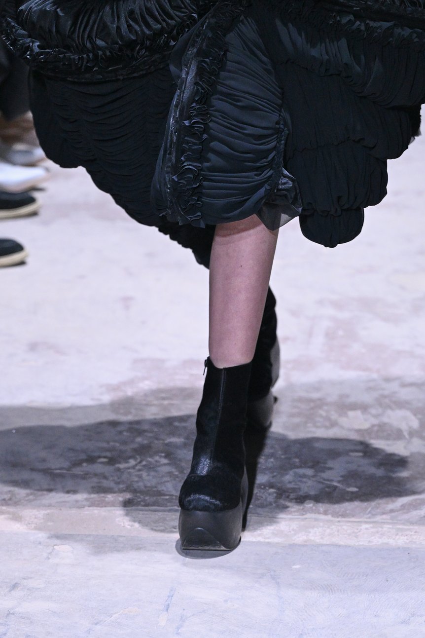 そしてショーは再び黒の世界へ戻る。よりボリュームとうねりを増し、レースの重なりや垂れ下がるフリンジが強いインパクトを放つドレスが終盤を飾った。