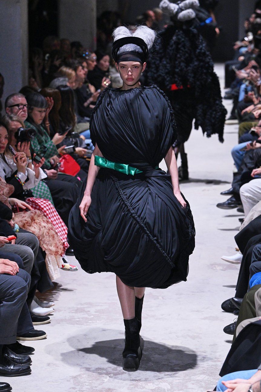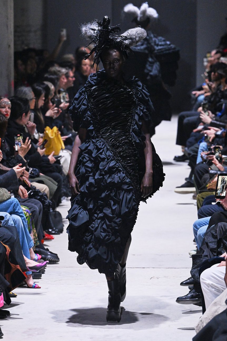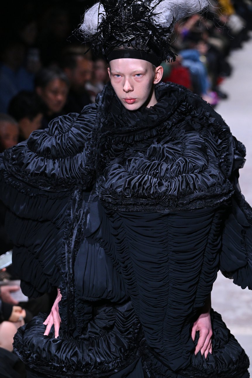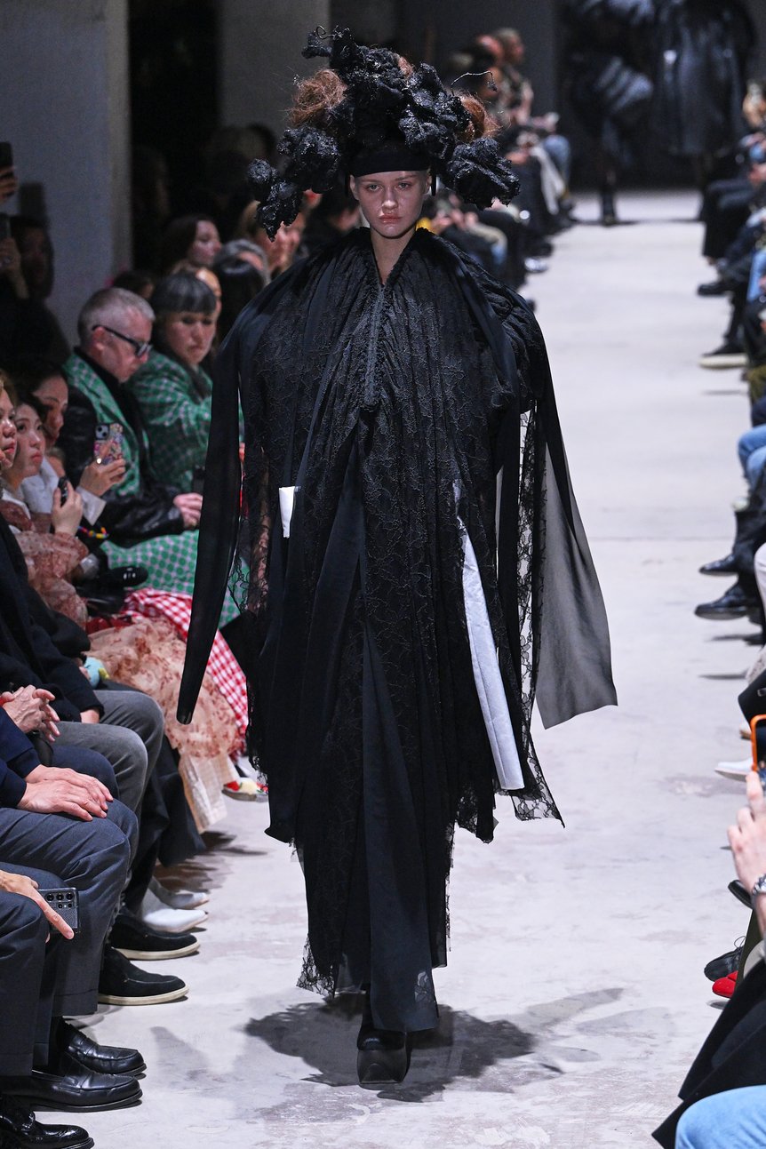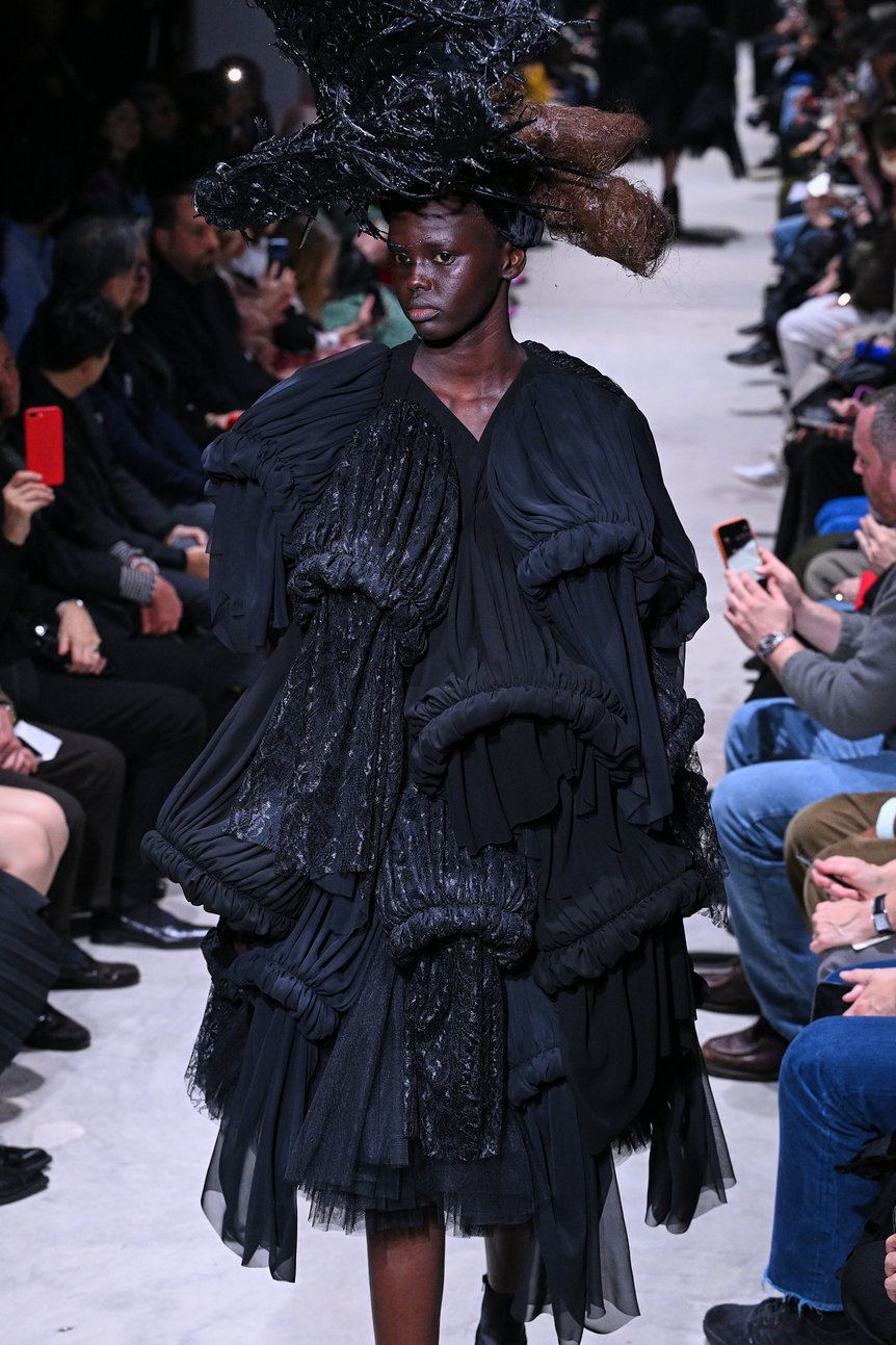 身体のラインと完全に離れた異形のドレスは、コム デ ギャルソンの近年のコレクションでたびたび登場しているが、全てのルックに洗いをかけてダメージを負わせた先シーズンとは対照的だ。ジョーゼットやレースといったドレス素材をメインとし、幾重にも重ね、折ったり、寄せたり、縛ったり。あらゆる手法によって陰影を生み出し、黒が深みを増していく。まるで布の彫刻のように、繊細さと強さが共存する黒の造形美を印象付けた。