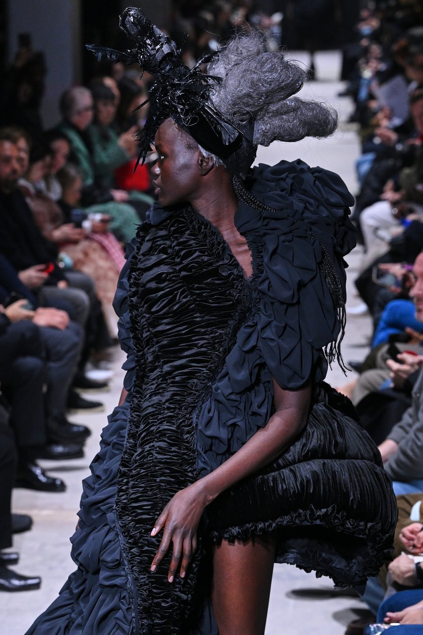 ショーが始まってすぐに、黒一色の巨大な造形が現れた。肩や腰回りが鳥の翼のように突出したドレスで、細かくギャザーを寄せた薄手のテキスタイルが覆っている。それに続くルックも同様に、バロック調のクラシカルなドレスのフォルムをベースとしながら、うねりやコブといった歪んだ造形を繊細な素材が包み込む。