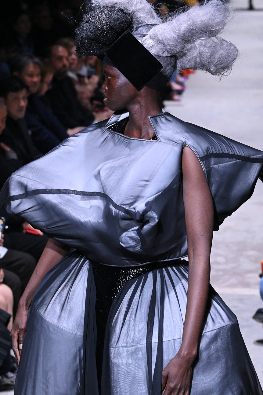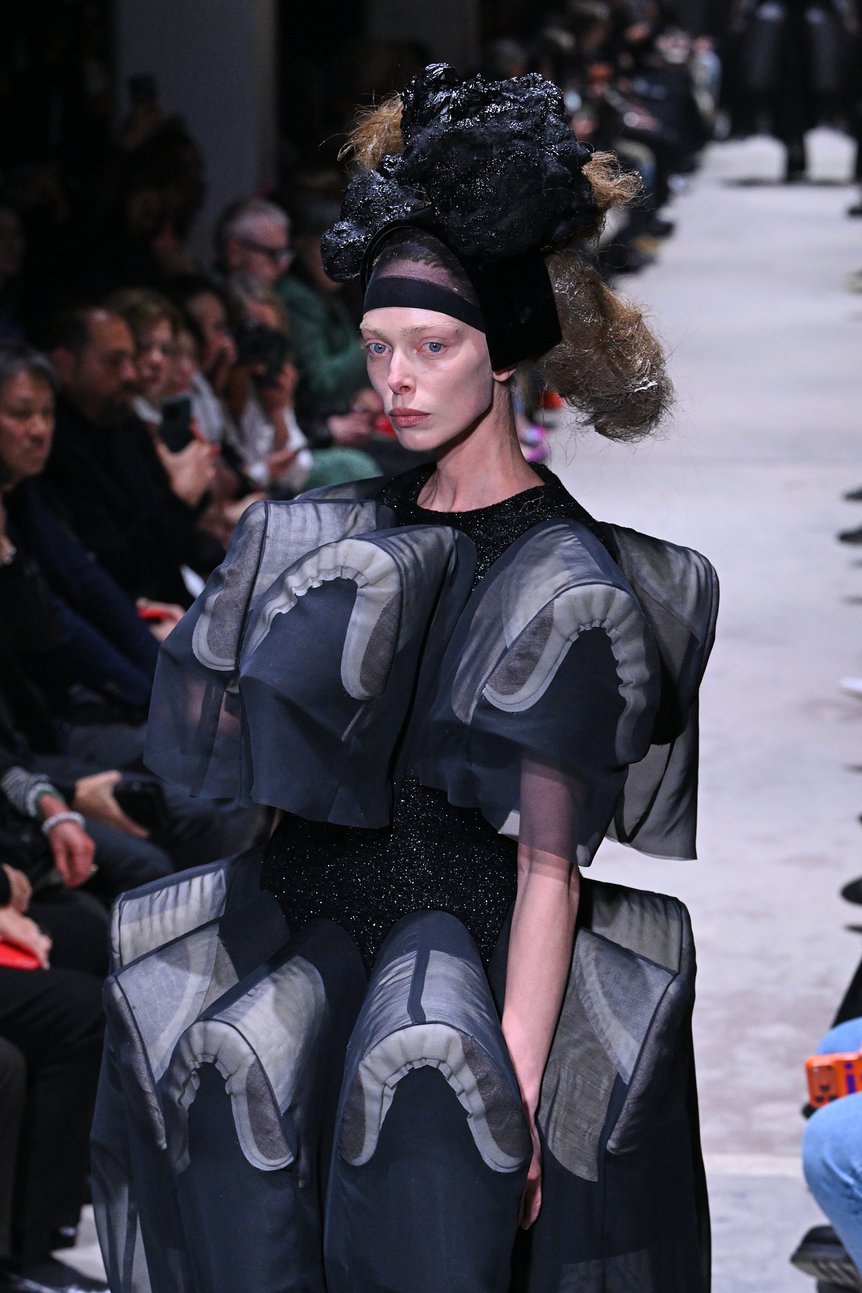 シースルー素材は、衣服の骨組みをあらわにする。テーラードの肩の構造を反復させ、胸と腰の周りを立体的に突出させたドレスに視線が集まった。透けて見える肩パッドや芯地の構造──その美しい仕立てこそが、コム デ ギャルソン社が培ってきた確かな技術の証だ。