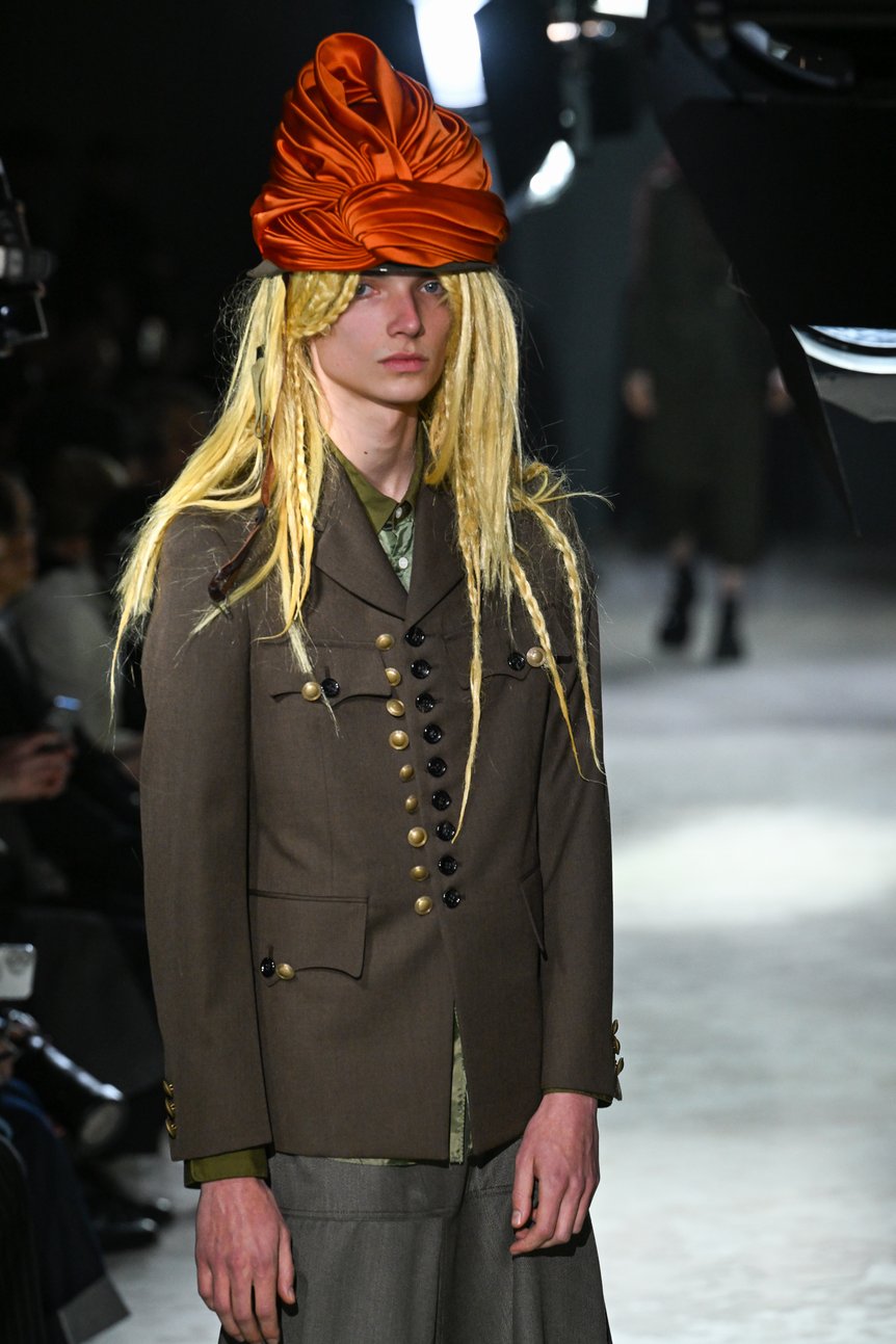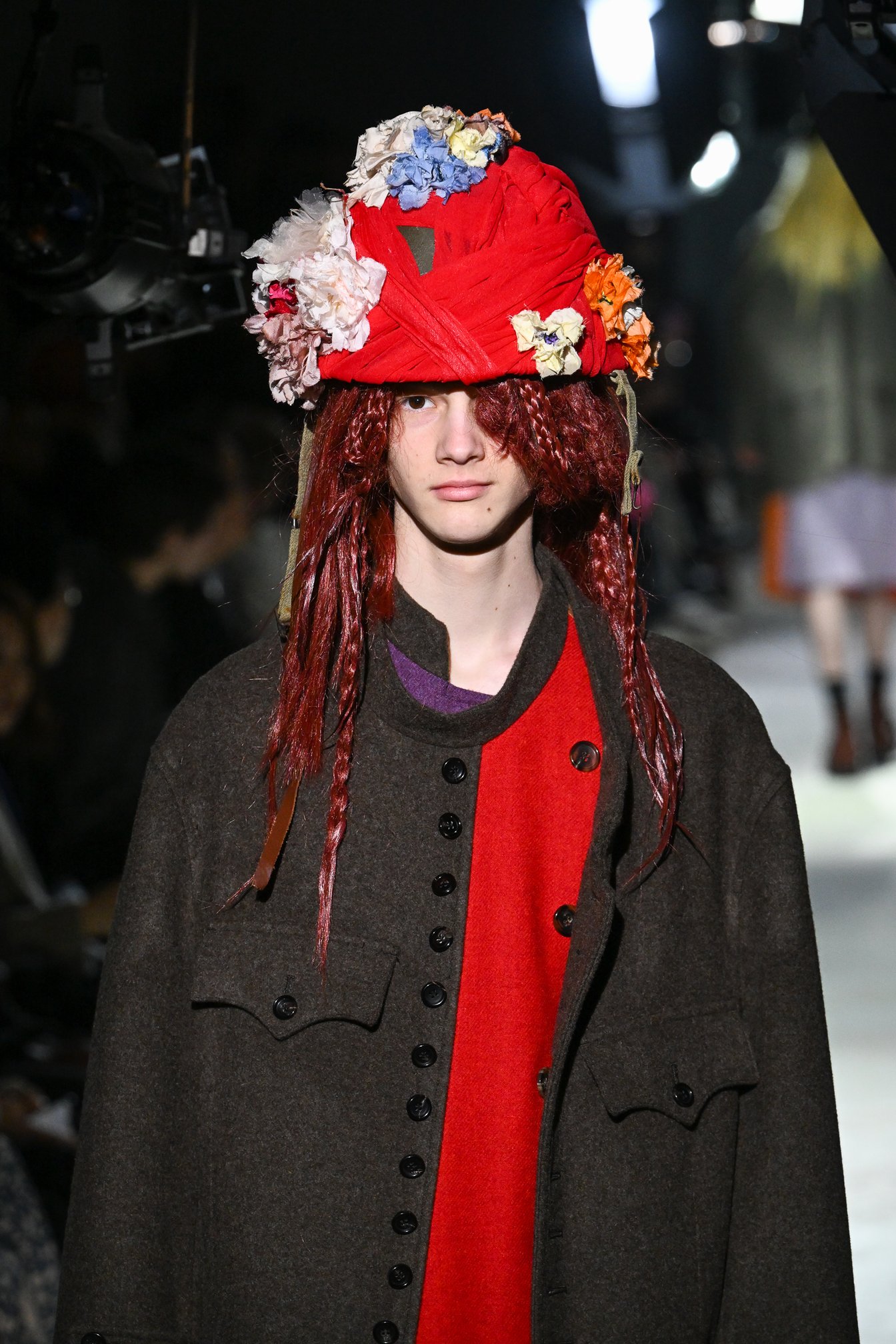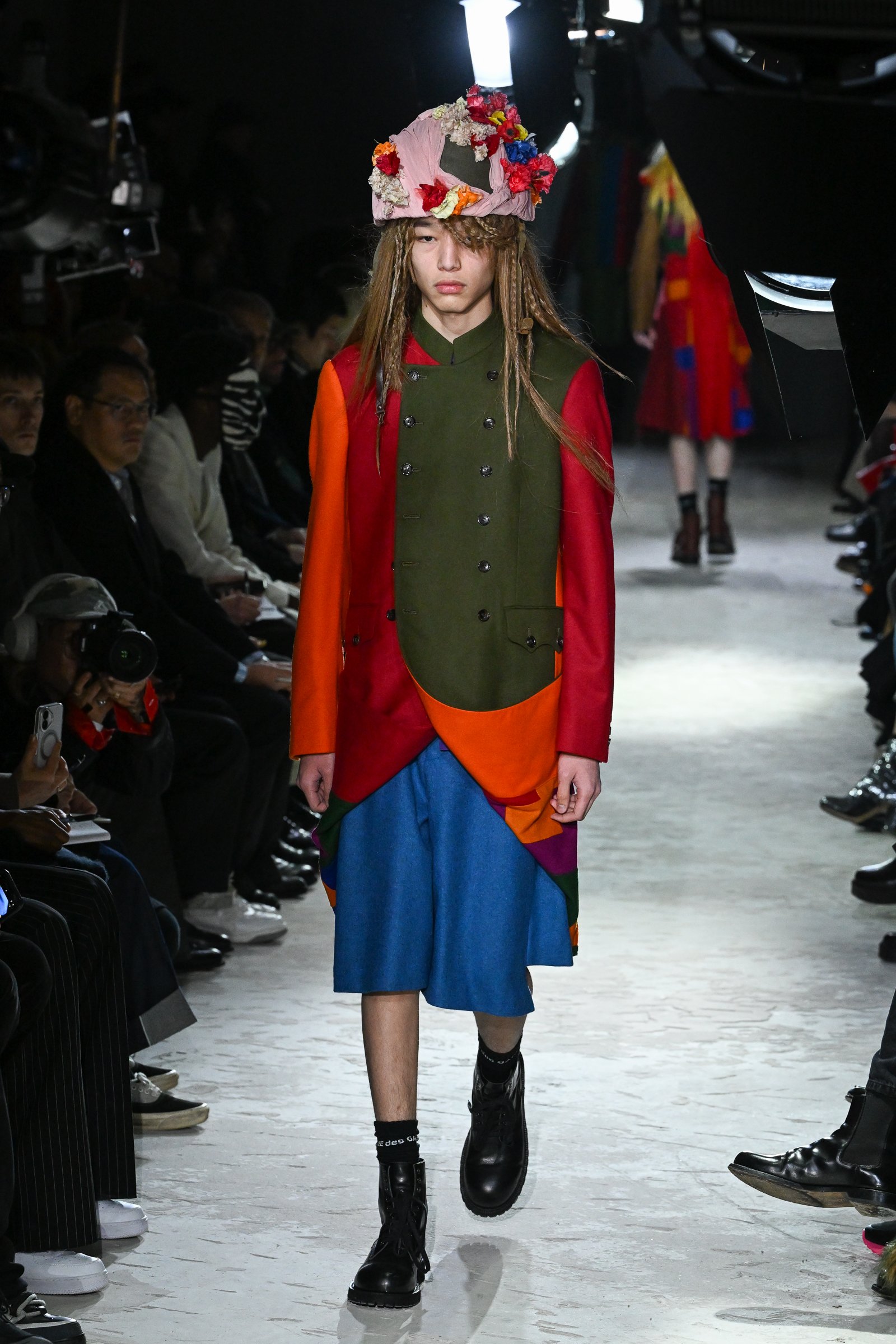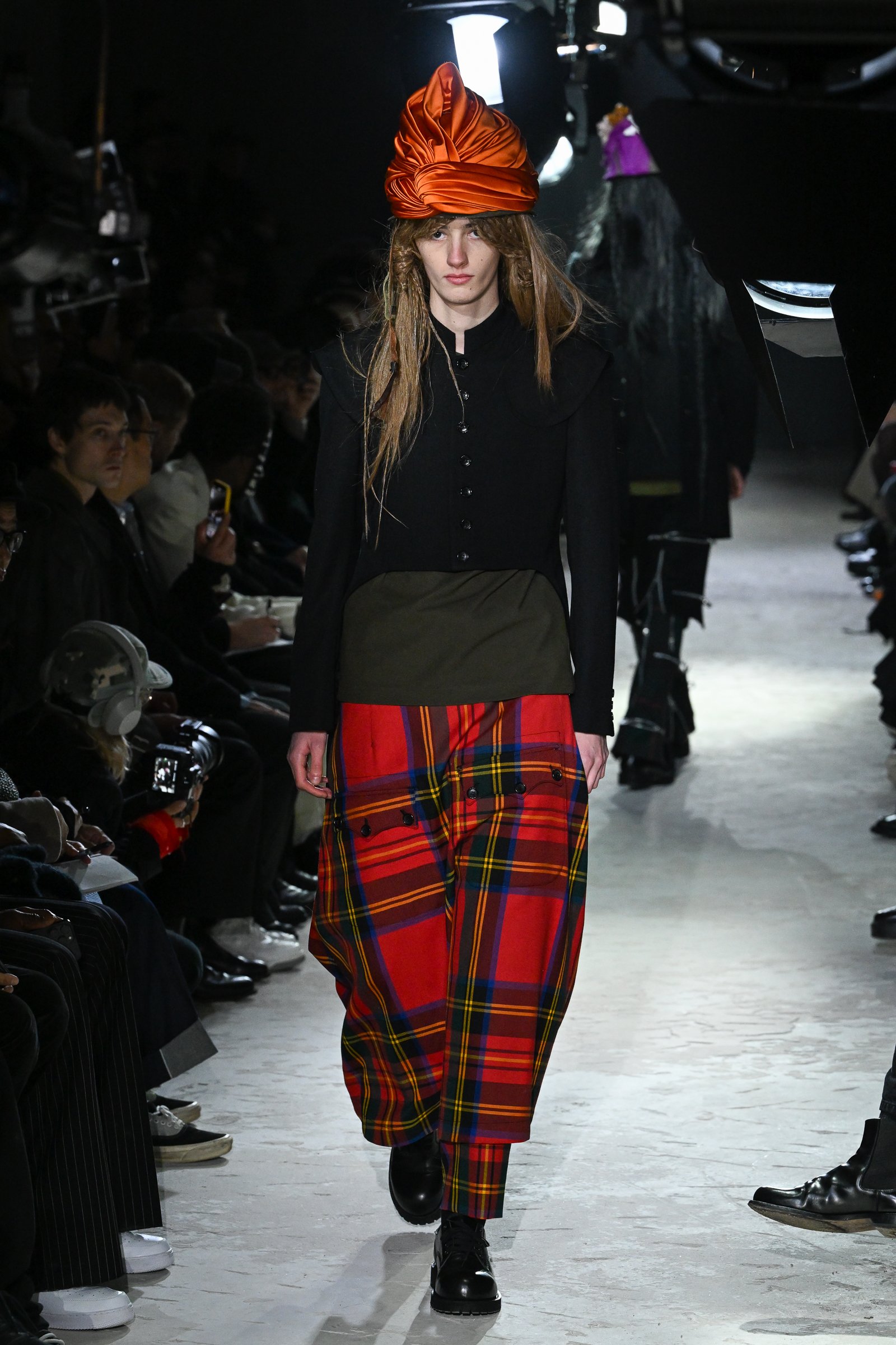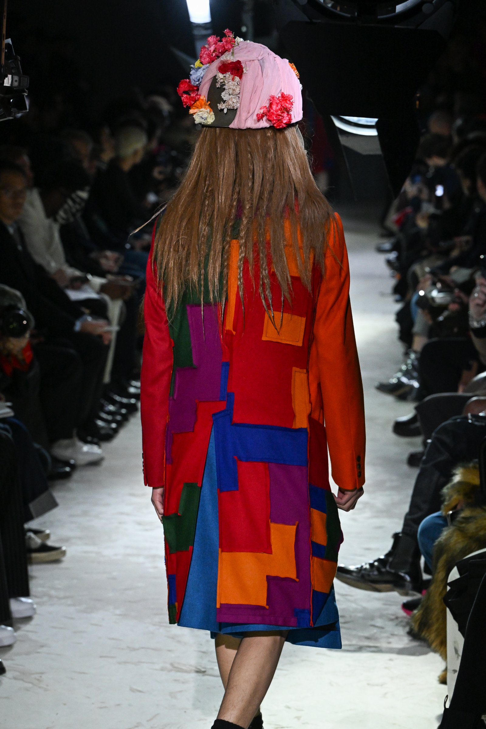 カラフルなフェルト生地は一見、プレイフルにも見えるが、1900年代初頭以前のアーミーウェアは戦地の風景に溶け込むアースカラーではなく、権力の象徴として色彩が取り入れられていたことを思い出させる。タータンチェック柄もまた、スコットランドの軍隊に由来するもの。川久保のクリエイションは、抽象的な方法で"新しさ"を伝えるが、今回のショーは直感的というより暗示的なものとして、あらゆるディテールを取り入れているように見えた。