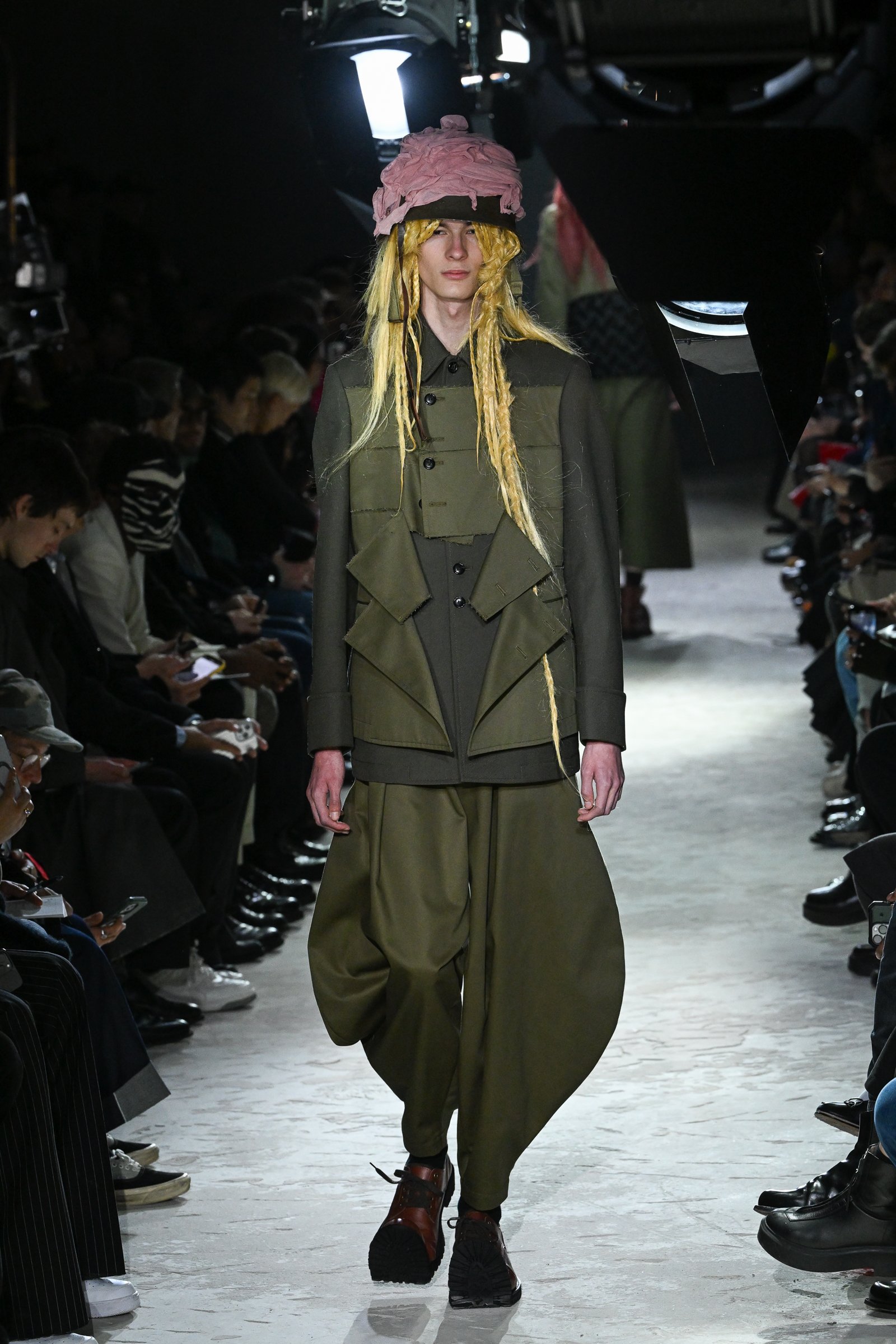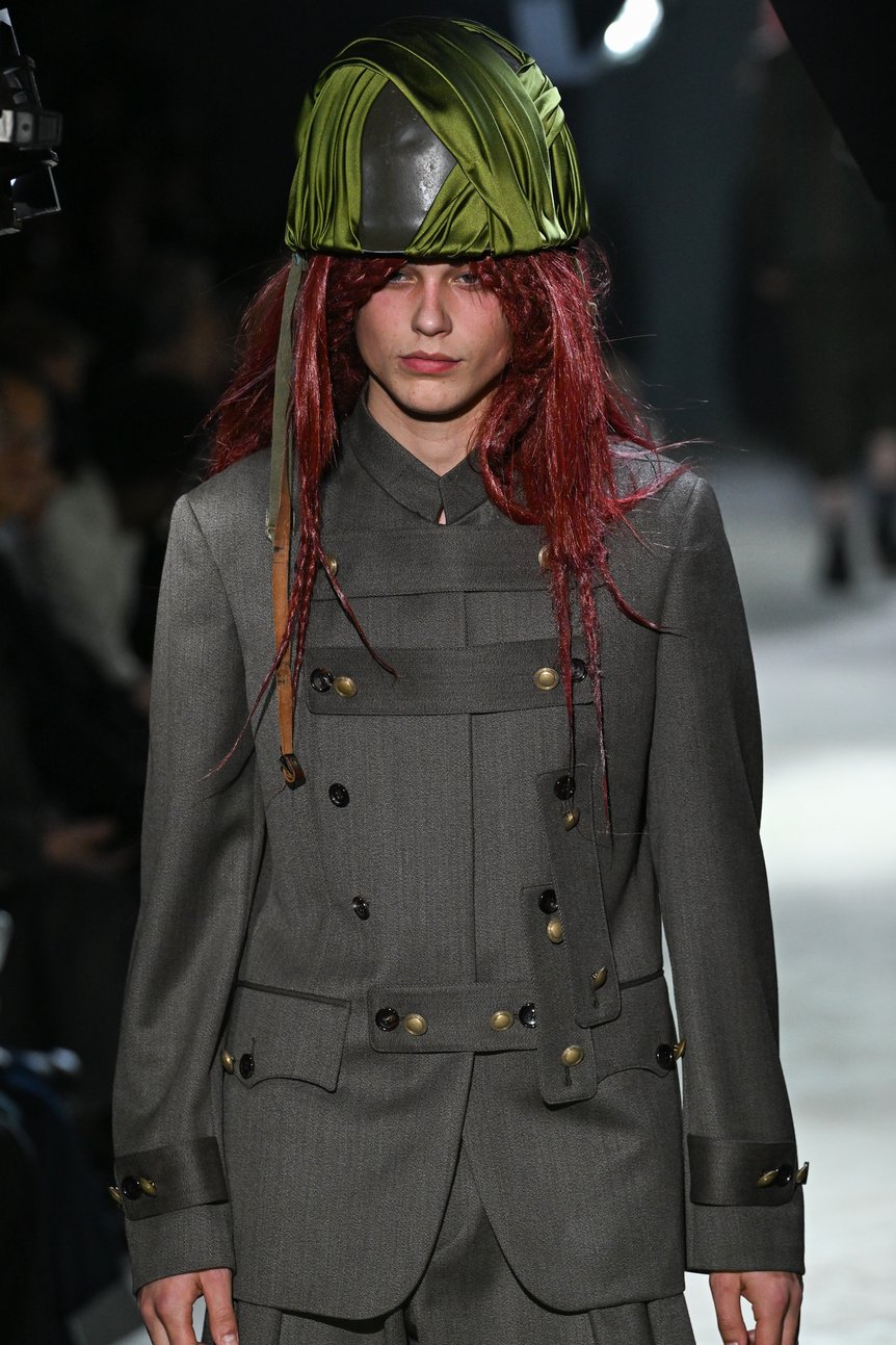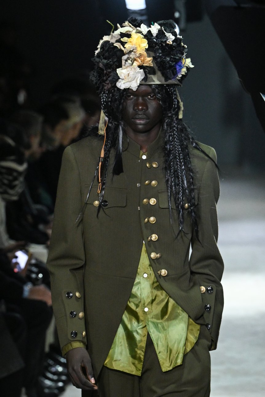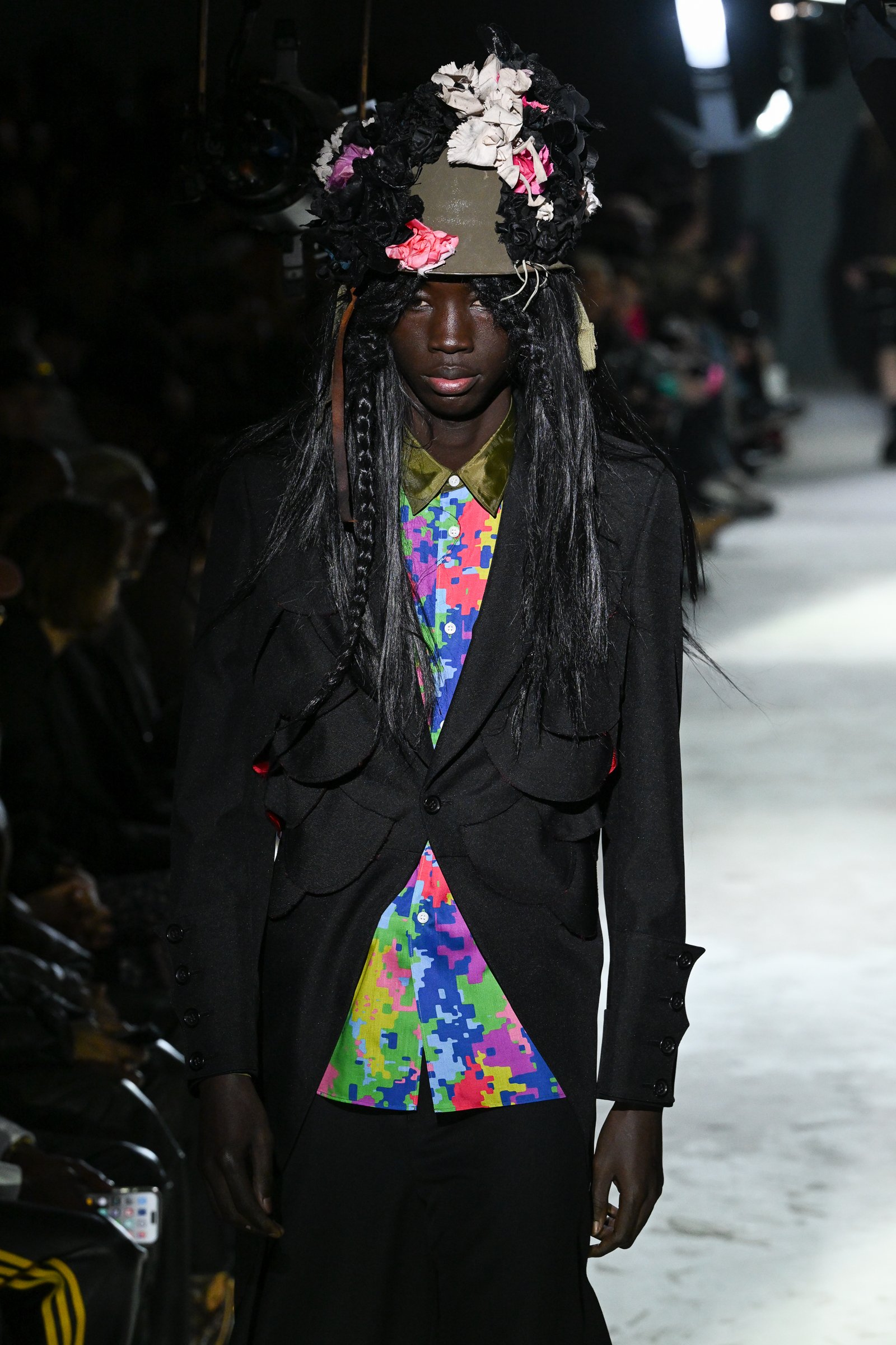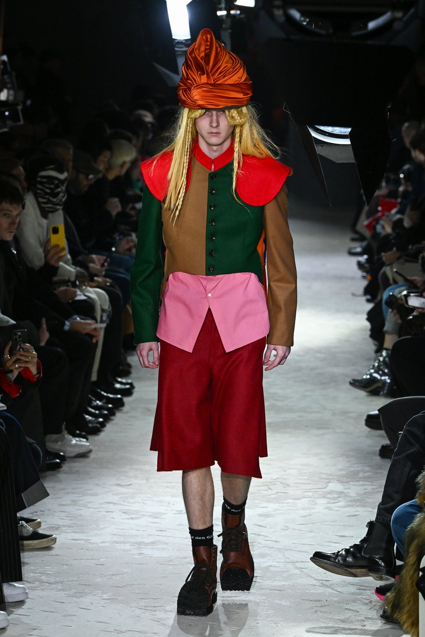 カラフルなフェルト生地は一見、プレイフルにも見えるが、1900年代初頭以前のアーミーウェアは戦地の風景に溶け込むアースカラーではなく、権力の象徴として色彩が取り入れられていたことを思い出させる。タータンチェック柄もまた、スコットランドの軍隊に由来するもの。川久保のクリエイションは、抽象的な方法で"新しさ"を伝えるが、今回のショーは直感的というより暗示的なものとして、あらゆるディテールを取り入れているように見えた。