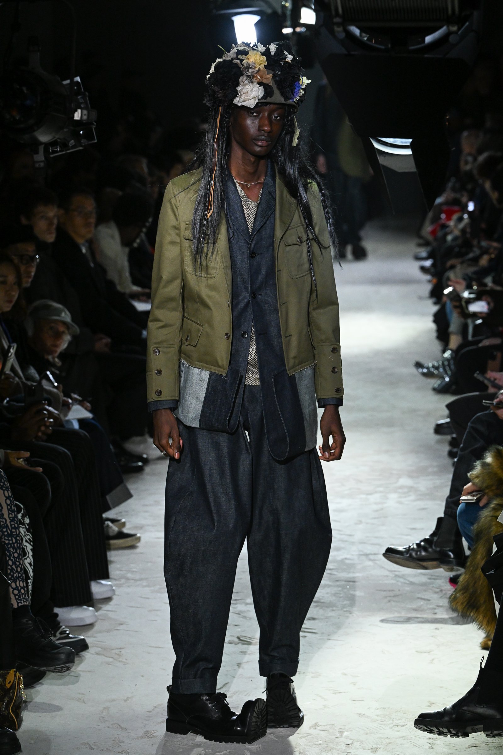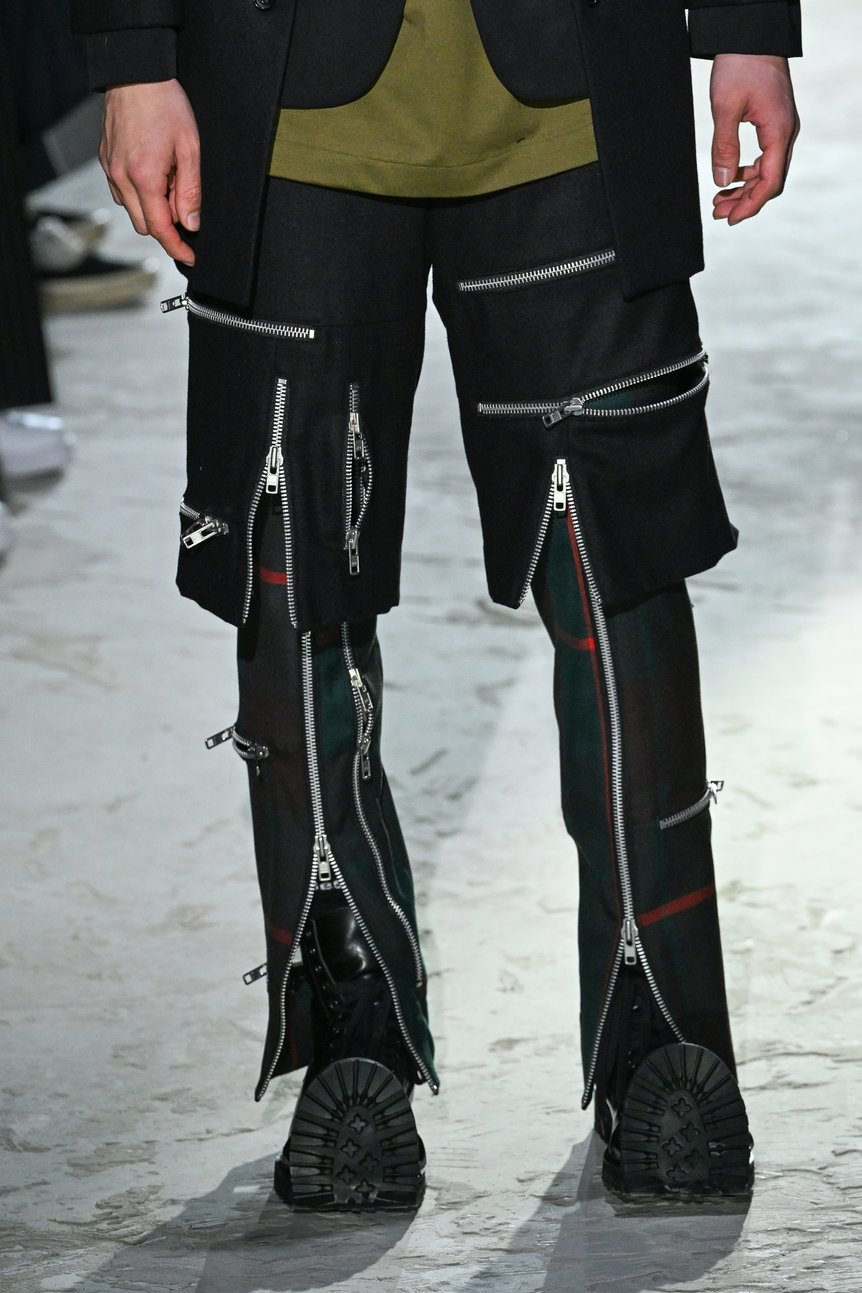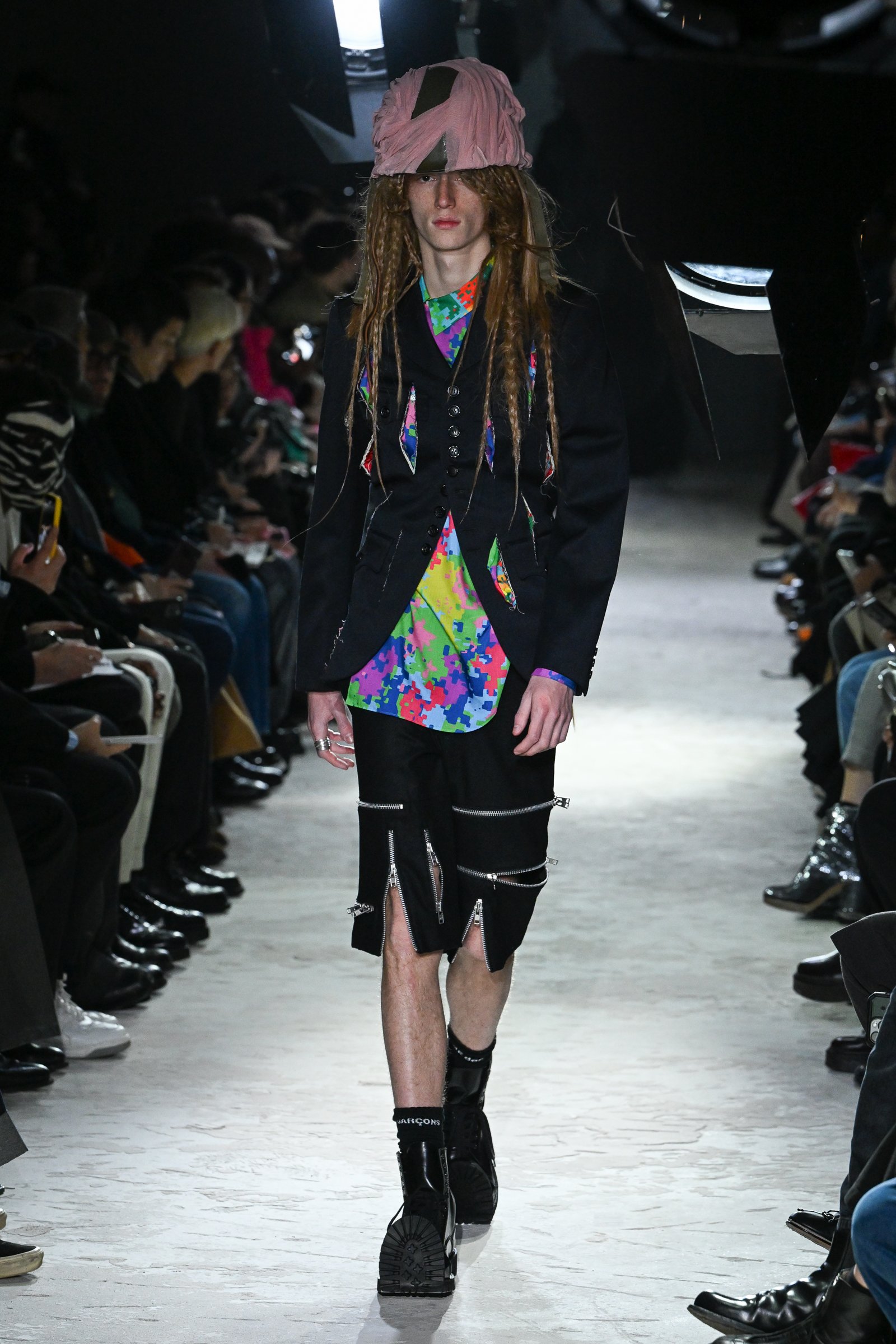 1960年代から70年代にかけて、ベトナム戦争を背景に、フラワー・チルドレンは平和と愛の象徴として体を花で飾った。花の刺繍が施されたウエストコート、デジタルカモフラージュのサイケデリックな色彩、コム デ ギャルソン オム プリュスでは珍しいデニム生地の使用も、このムーブメントとのリンクを感じさせる。フラワーチルドレンが宿した反逆心は、海を越えて、イギリスのパンクへと繋がっていったのか、縦横に走るジップ使いは反骨精神を示す。