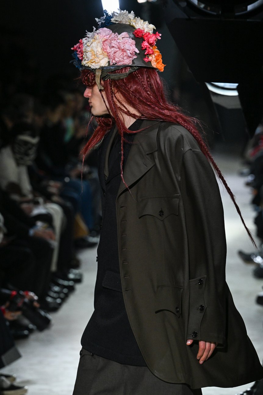 モデルが被っているヘルメットは、あるものは花で覆われ、あるものは厚いサテンがターバンのように巻き付けられている。帽子ブランド「ヒヅメ(HIZUME)」を手掛ける日爪ノブキが制作を手掛け、ヘルメットの下からはヒッピーのように編み込まれたウィッグが覗く。まるで「武器ではなく、花を」というスローガンを掲げたアメリカのヒッピー、フラワーチルドレンのようだ。