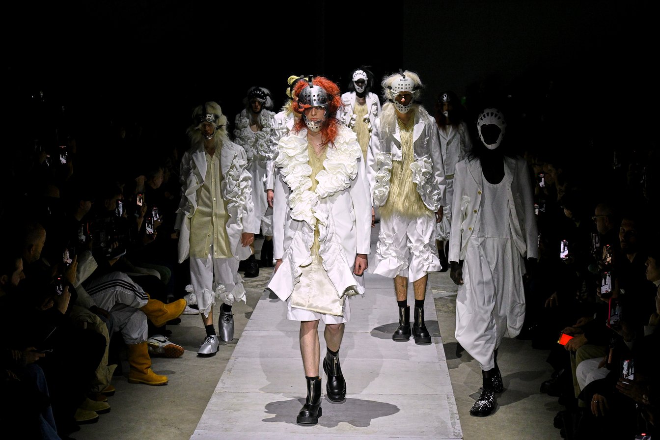 ショーのラスト、張り詰めた黒の世界は転換を迎える。突如として現れた、全身「白」のルック群。それは、ブラックホールの彼方にあるホワイトホールへの到達か、あるいは死と再生の儀式か。いびつなギャザーや歪みはそのままに、色だけが純白へと浄化されたその姿は、神々しくさえ思える。スタックした世界、出られない闇。しかし、川久保玲は最後に「白」を提示することで、冒頭の言葉「Let’s get out of the black hole.」を体現してみせた。それは安直な希望なのかもしれない。しかし、極限の圧力と歪みを通過した者だけが辿り着ける、何ものにも縛られない「LIVE FREE」な境地、ひいては無垢なる解放がそこにはあった。コム デ ギャルソン オム プリュスは、深い闇の底から、強烈な光を我々に投げかけたのである。