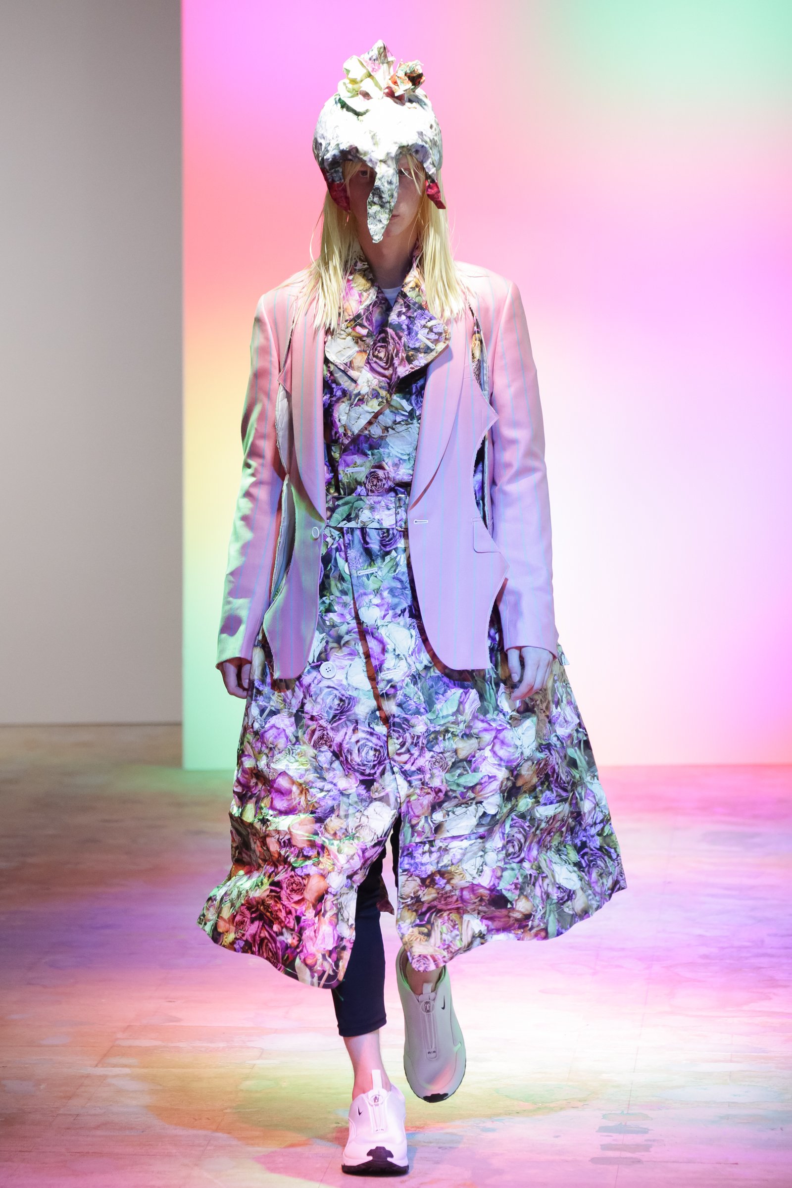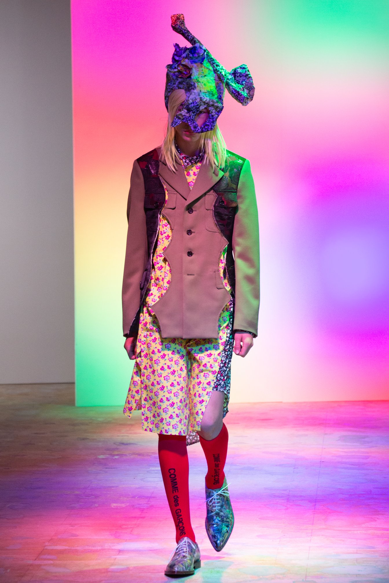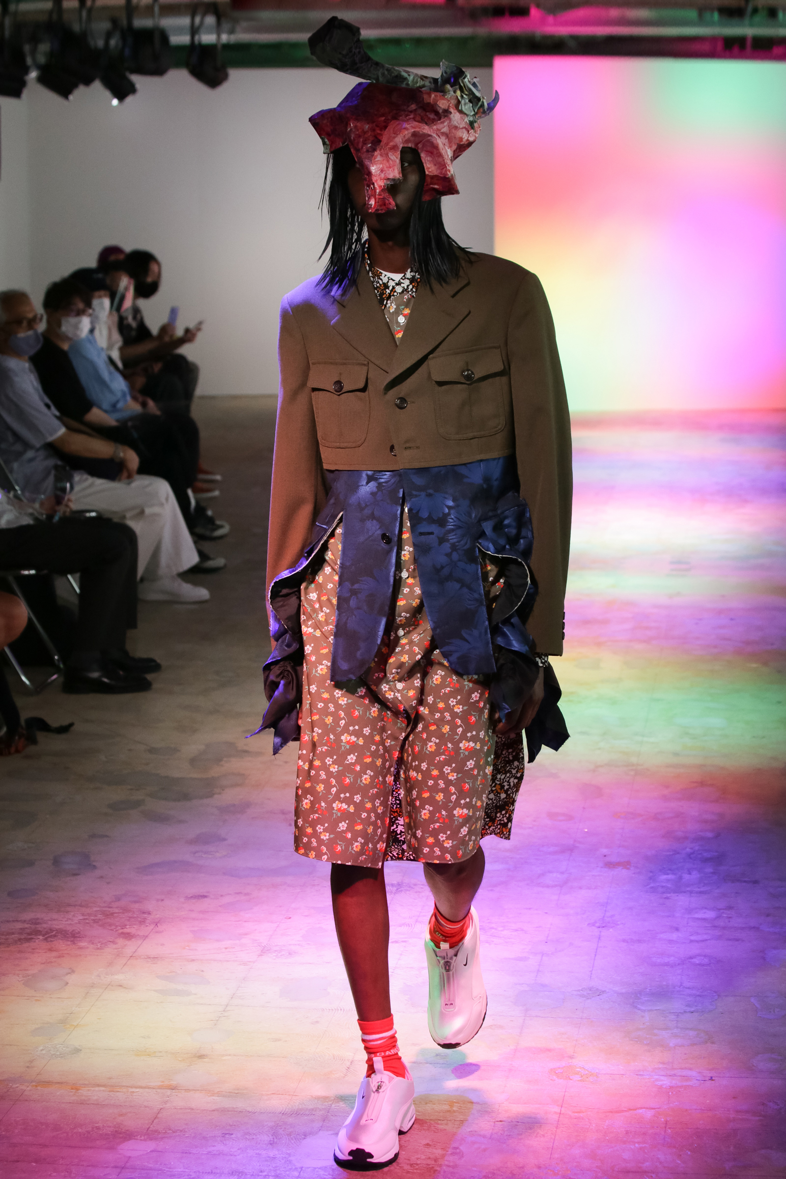 前回の暗闇とはガラリと変わり、カラフルなライトに照らされたランウェイ。川久保玲が手掛ける「コム デ ギャルソン オム プリュス(COMME des GARÇONS HOMME PLUS)」2022年春夏コレクションのフロアショーが東京の本社で開催された。タイトルは「花の存在」。