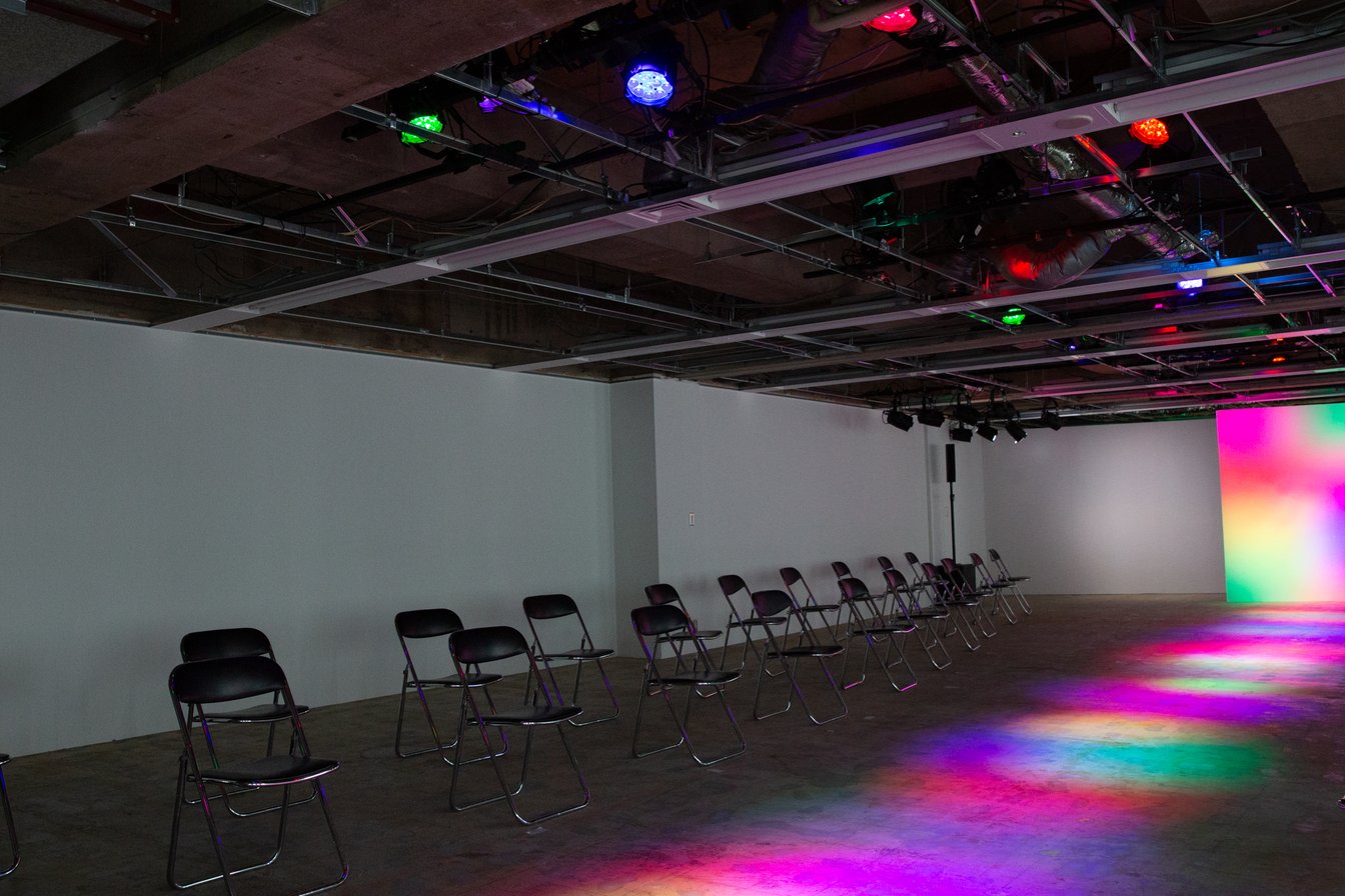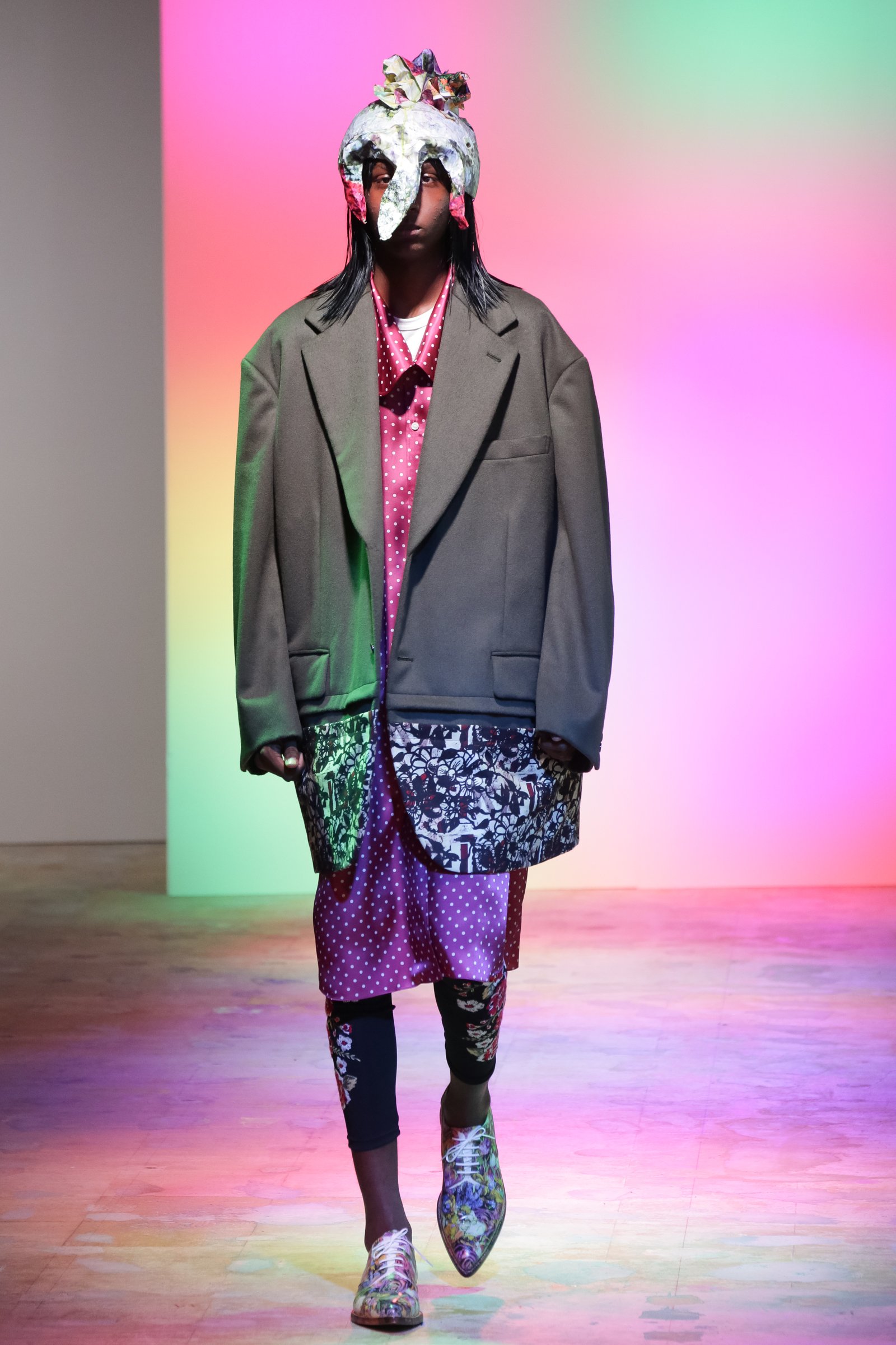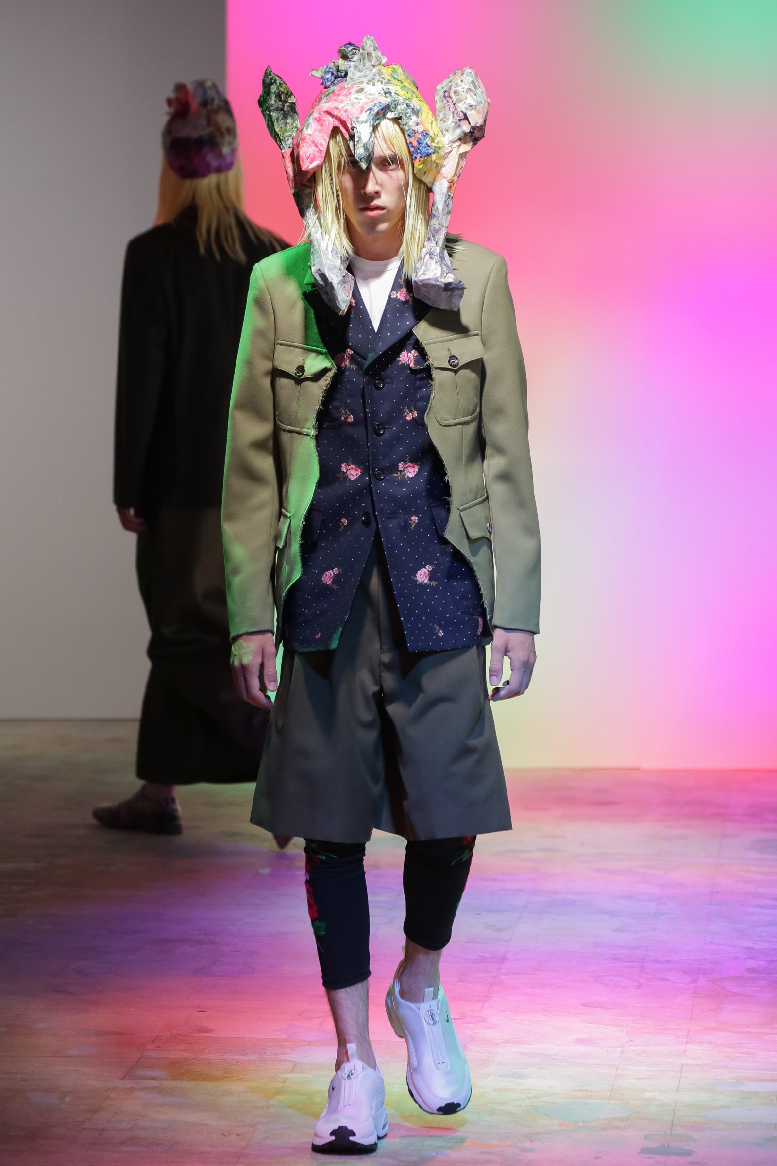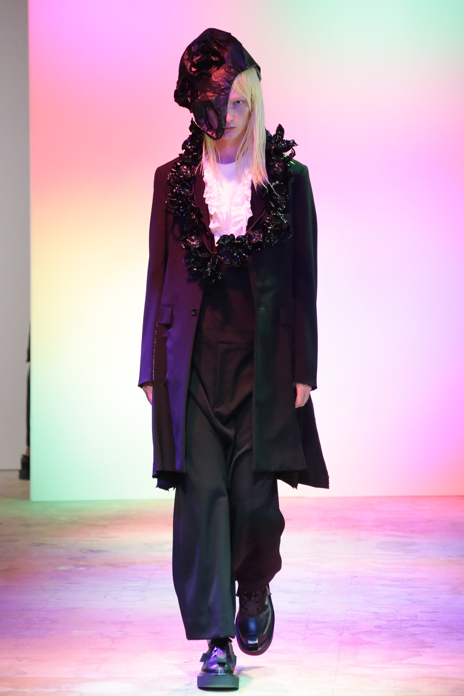前回の暗闇とはガラリと変わり、カラフルなライトに照らされたランウェイ。川久保玲が手掛ける「コム デ ギャルソン オム プリュス(COMME des GARÇONS HOMME PLUS)」2022年春夏コレクションのフロアショーが東京の本社で開催された。タイトルは「花の存在」。