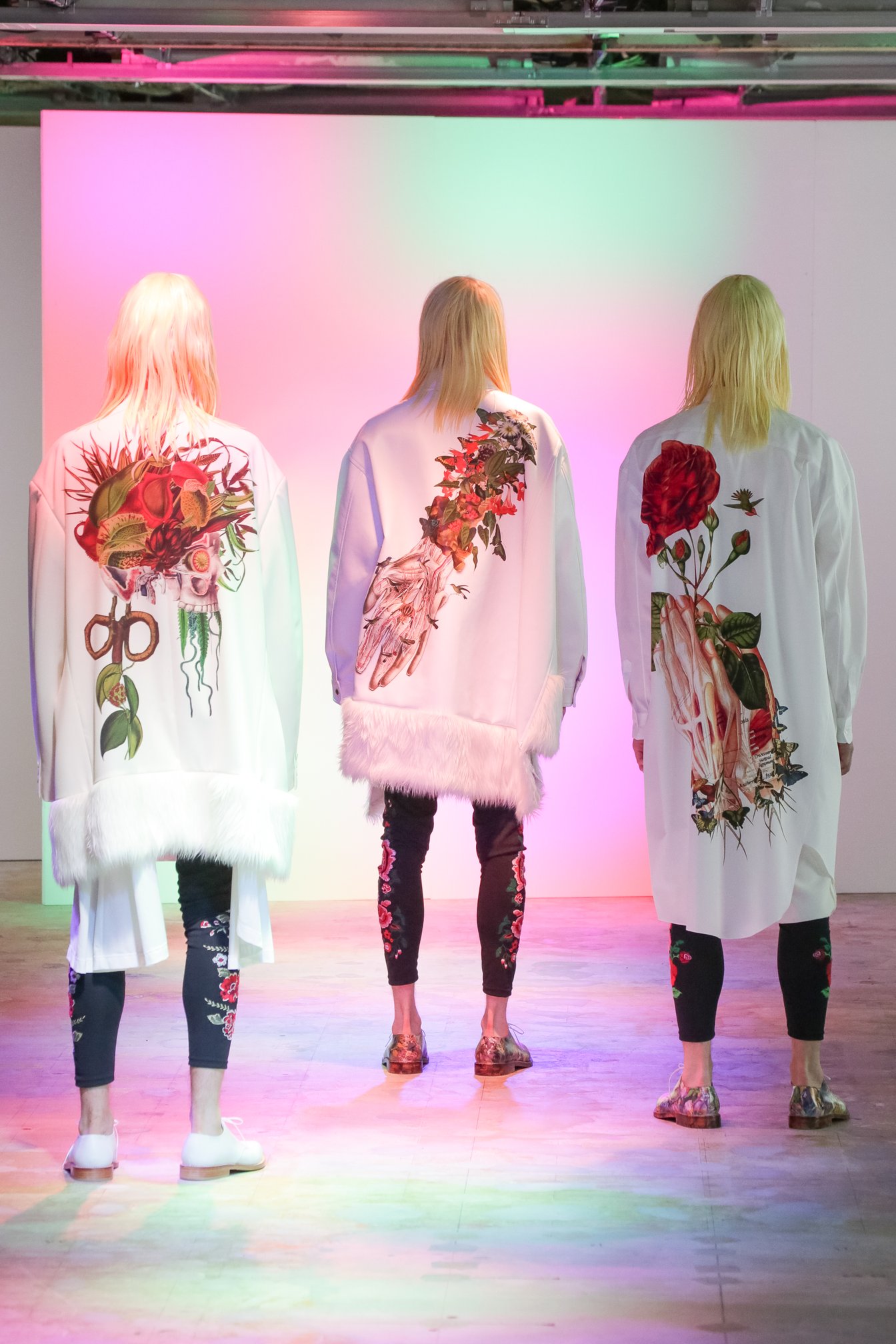 後半は、黒い花やしおれた花のモチーフが混じる。また、スカルと花のコラージュがチェック柄のジャケットを飾った。