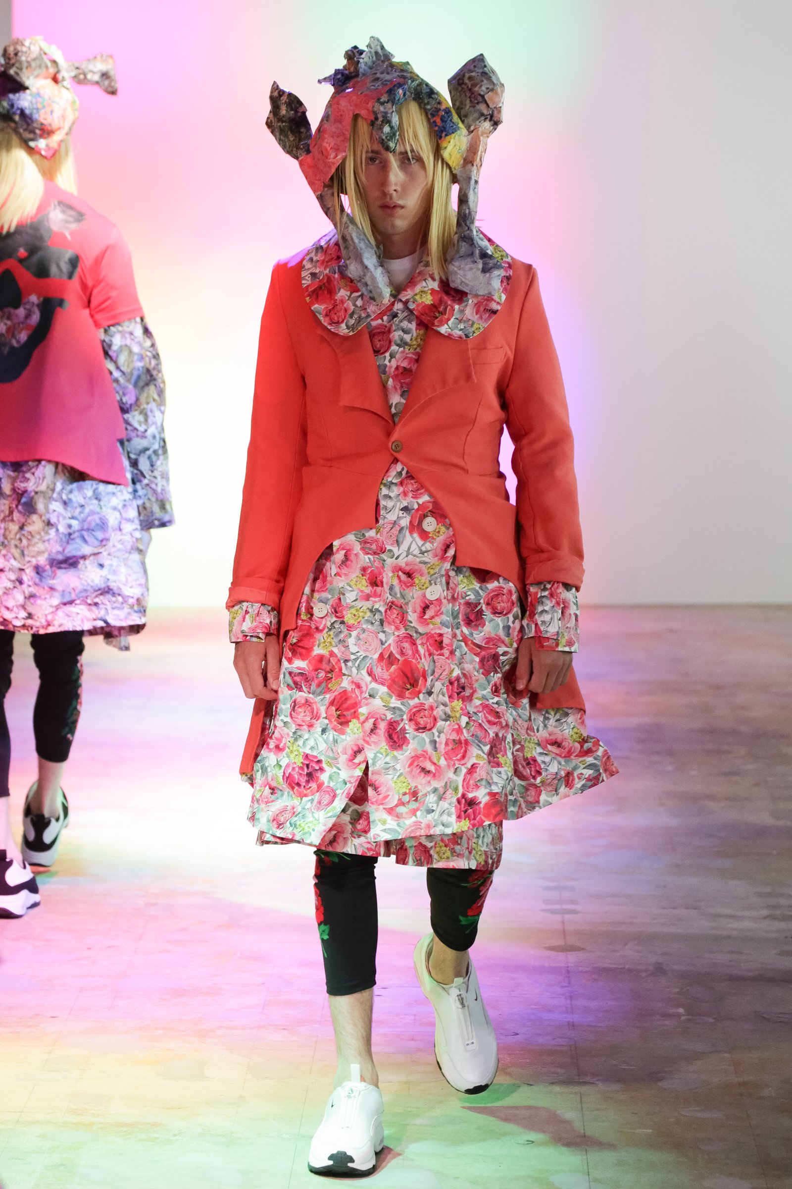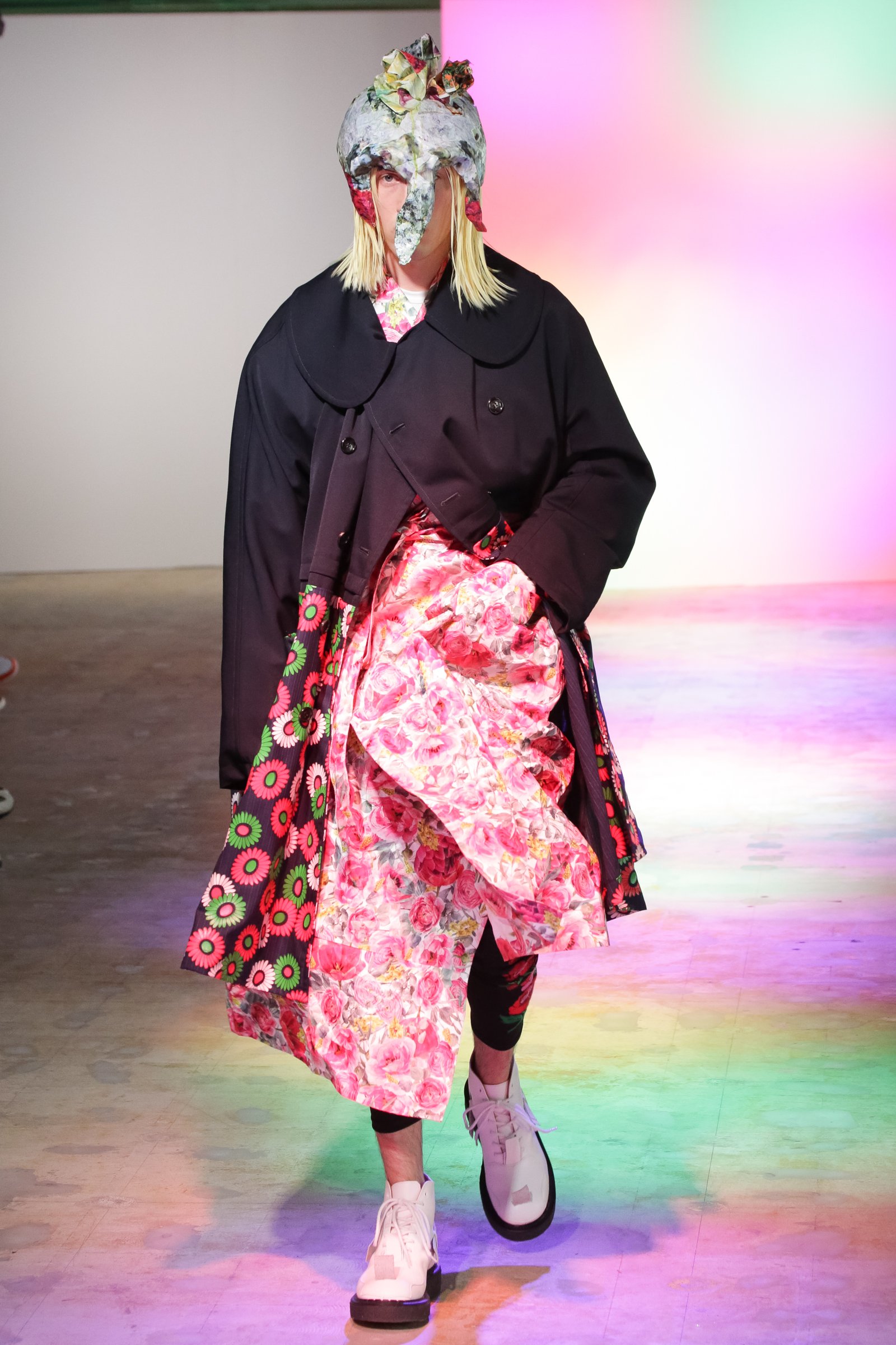 続くルックもジャケットとのレイヤードスタイルがベースだが、前合わせが曲がっていたり、曲線の断ち切り、オーバーサイズ、ミリタリー調と花柄のドッキングなど、随所に歪みが見られる。スカートやオーバーオール、花の刺繍をあしらったレギンス、丸襟のコートがフェミニンなフォルムを誇張。