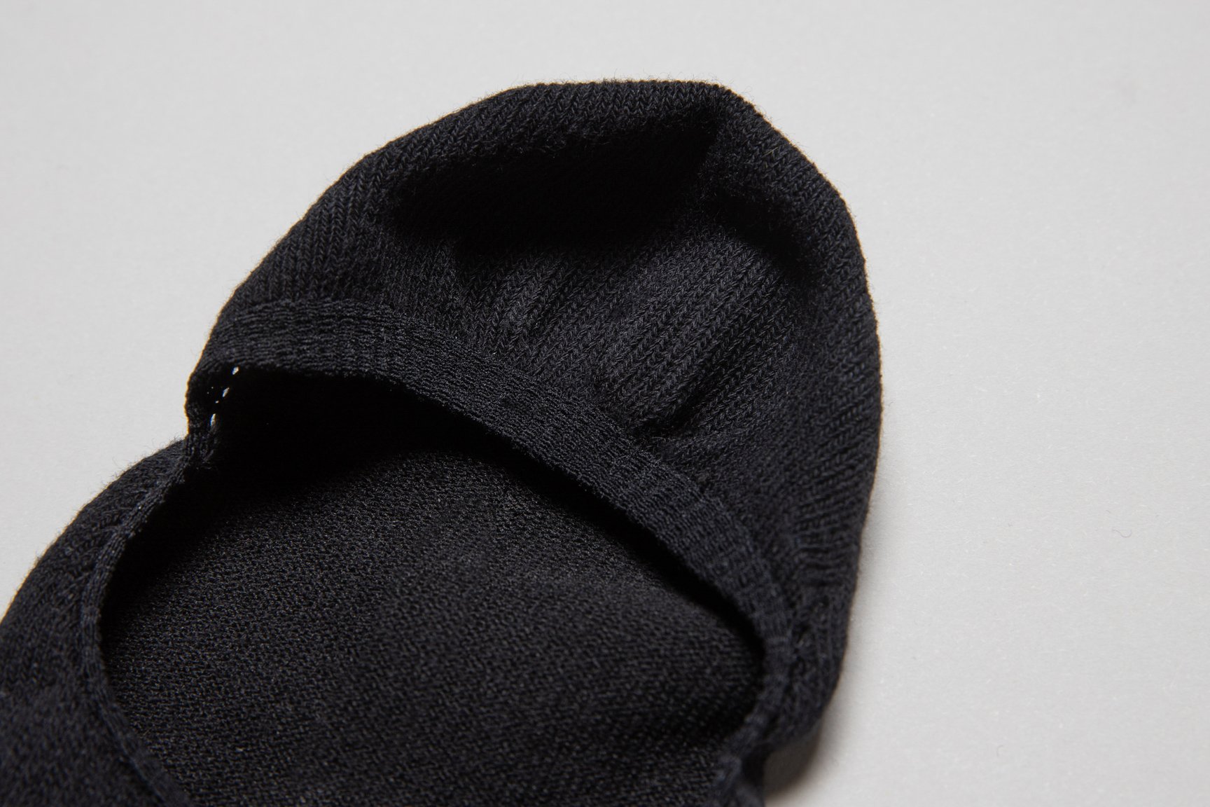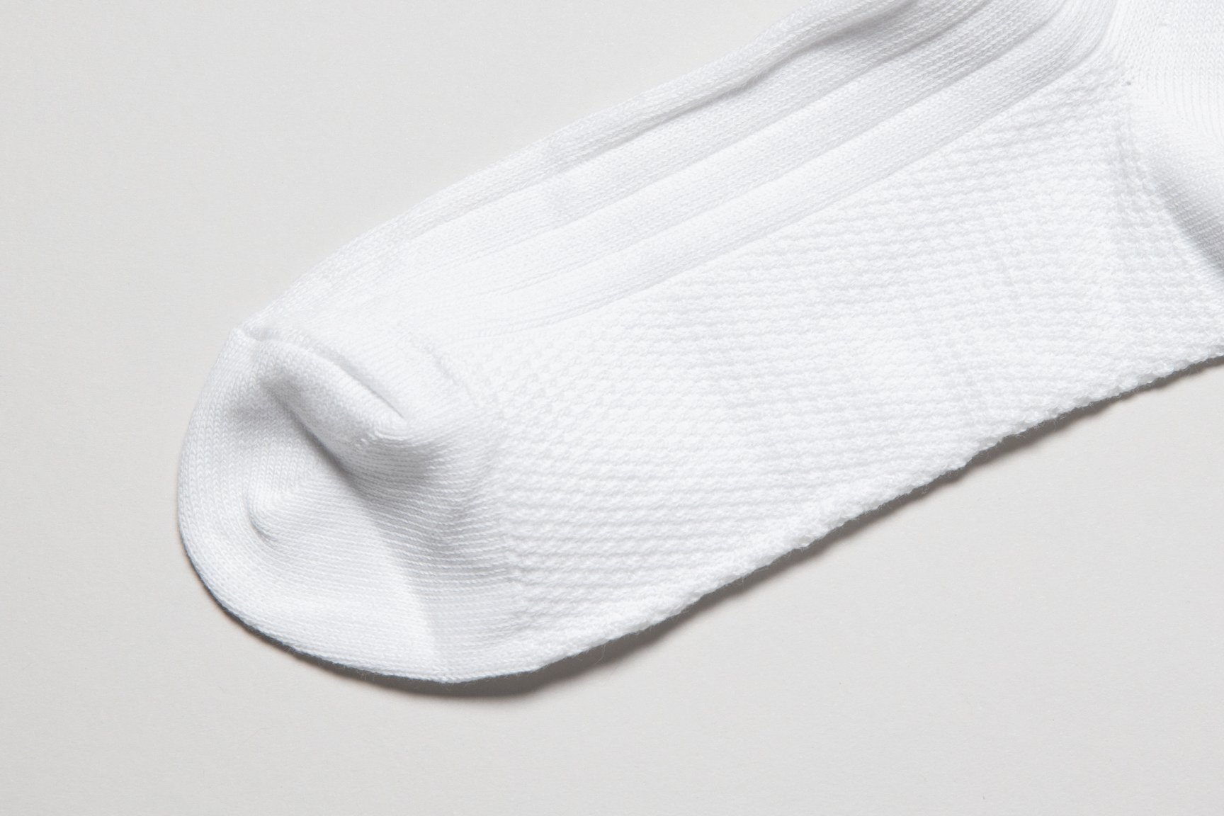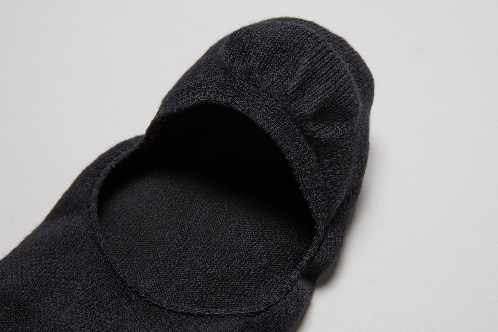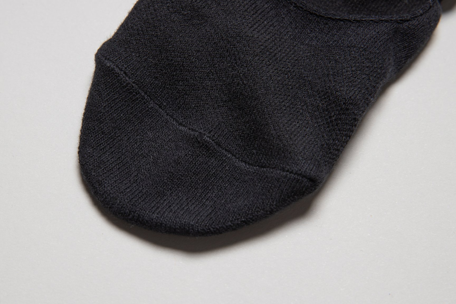 足底は鹿の子編み仕様で、通気性が向上。つま先とかかとには補強糸を使用しています。編地の太さまで落合さんが監修したというリブソックスはシンプルなデザインですが、絶妙なバランス感で細部のディテールからもこだわりを感じます。