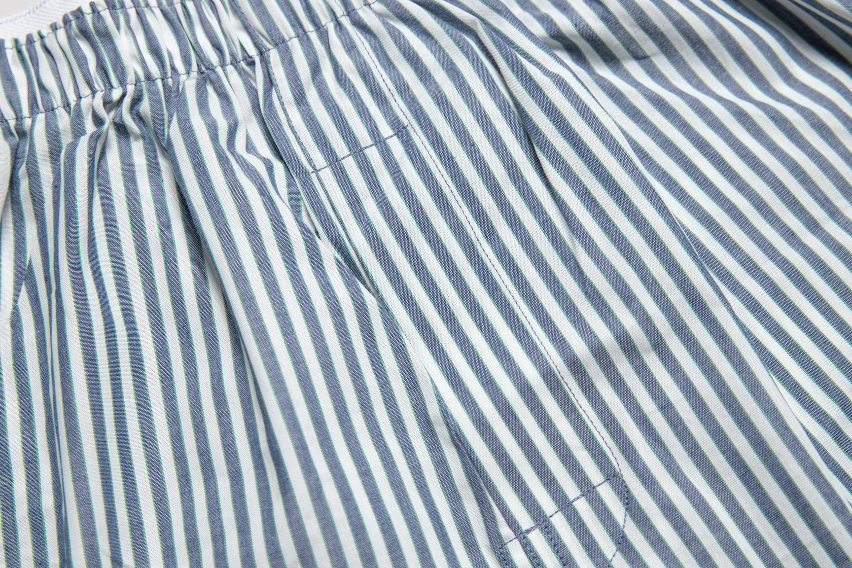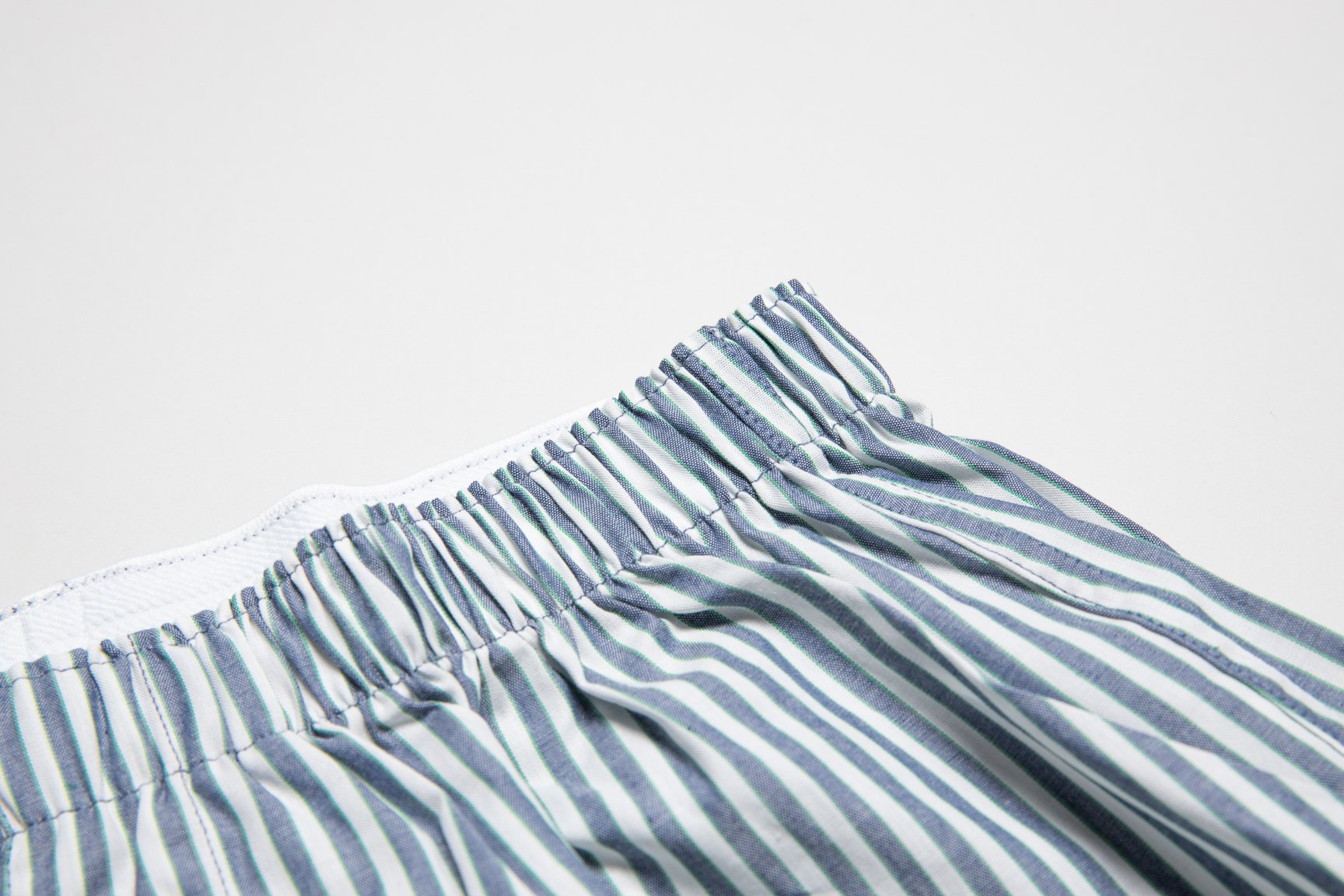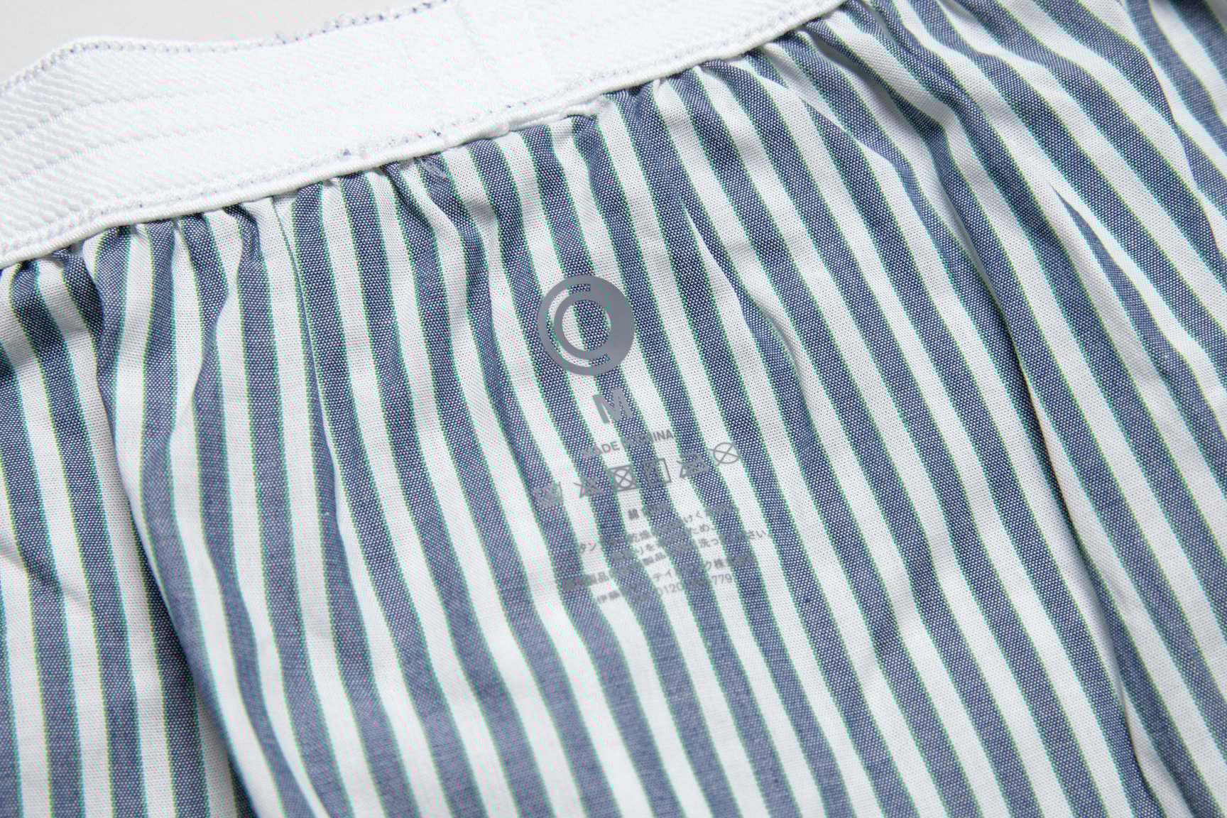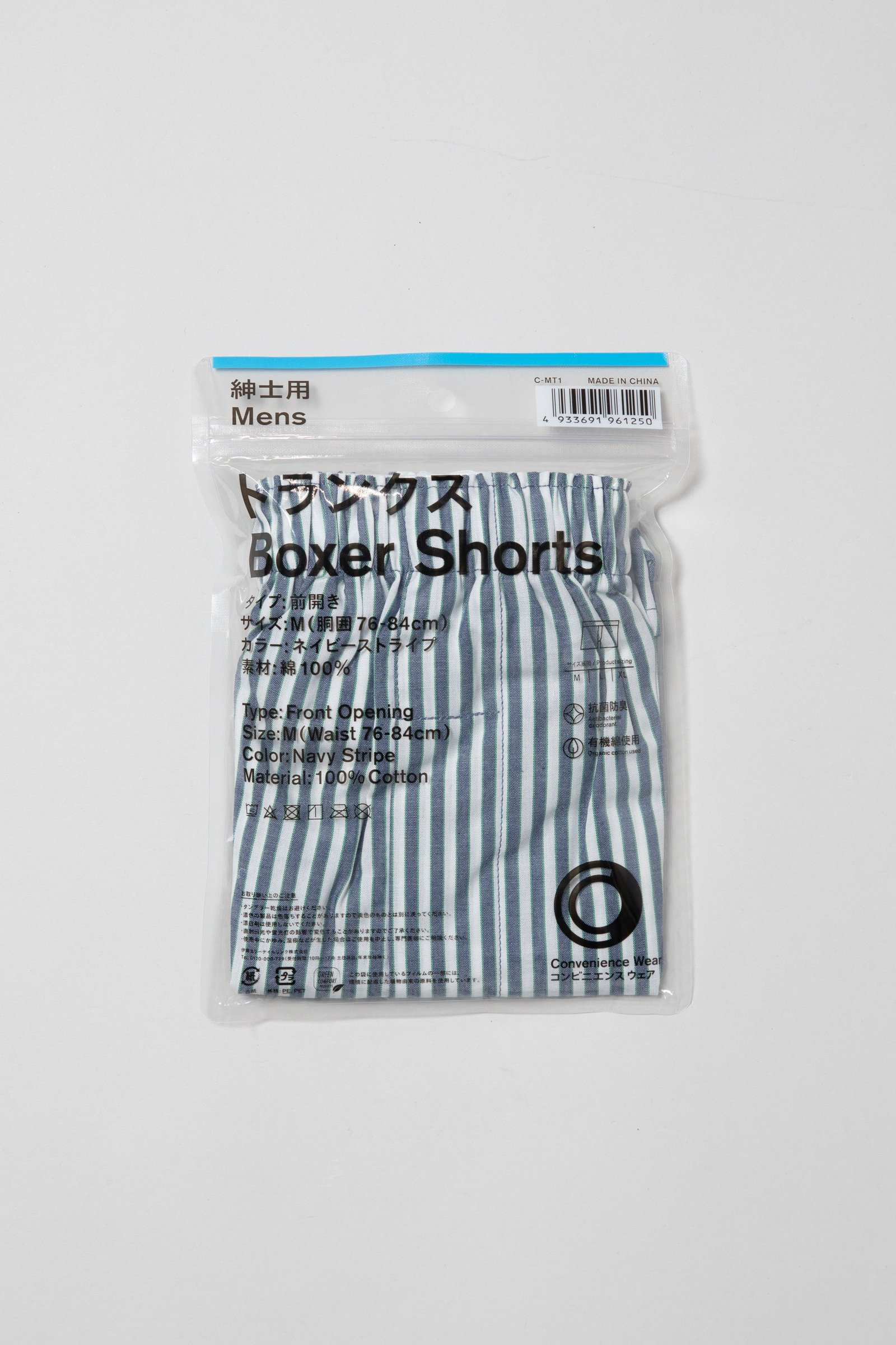 ネイビーストライプのトランクス。素材はコットン100%で、前開きタイプを採用しています。
