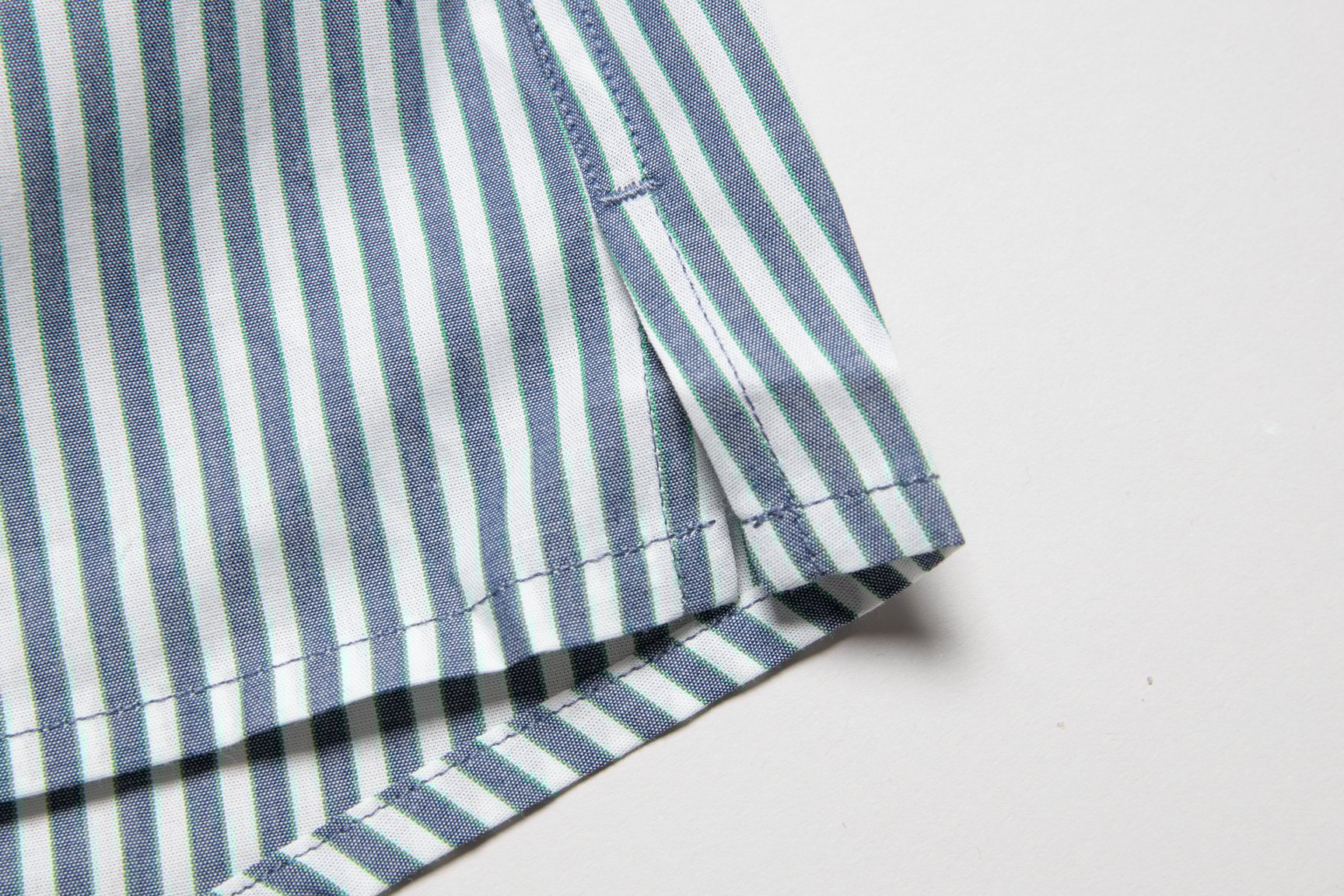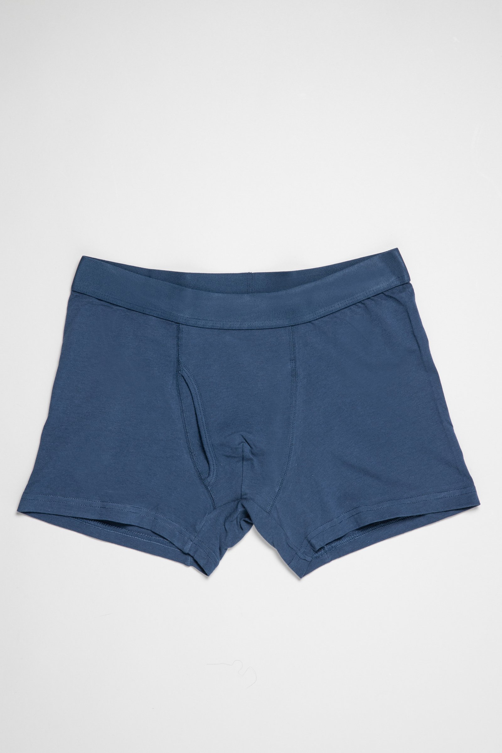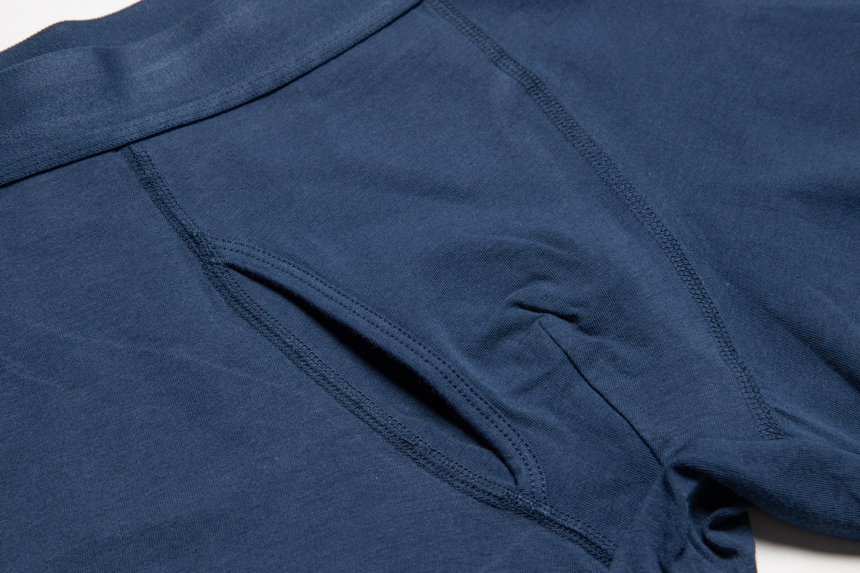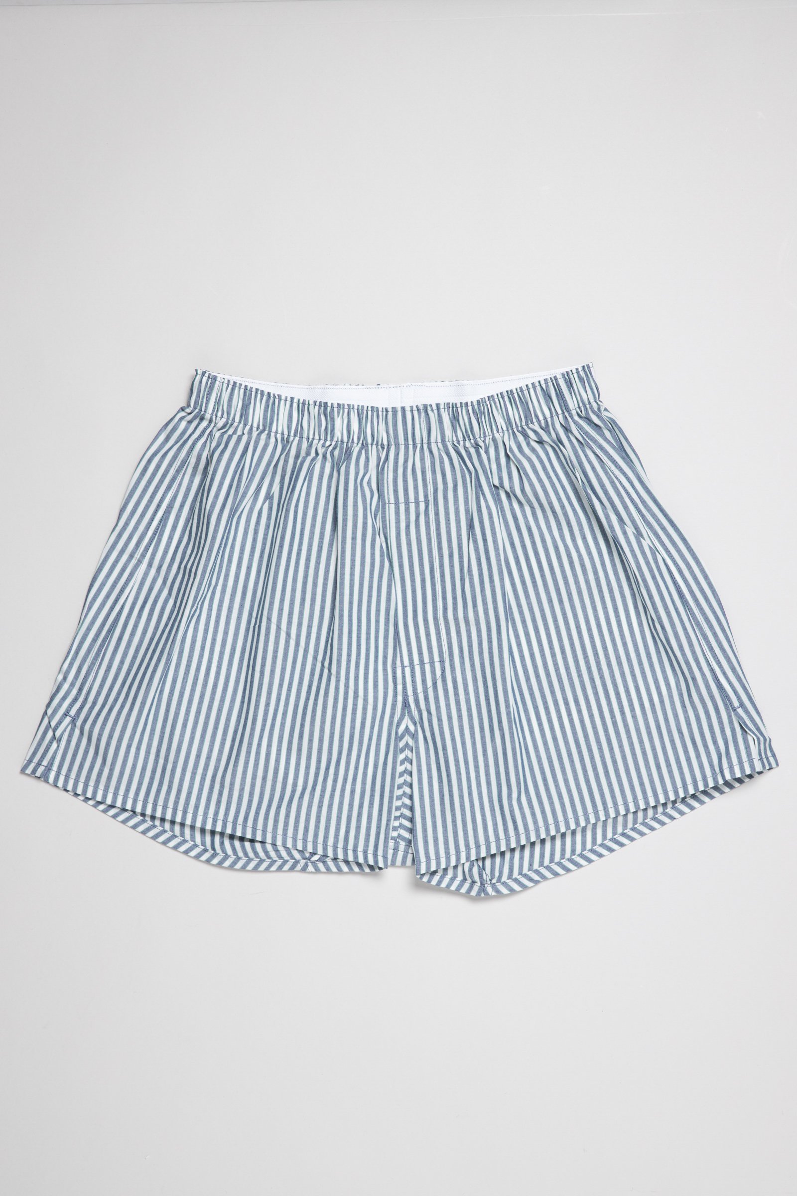 ネイビーストライプのトランクス。素材はコットン100%で、前開きタイプを採用しています。
