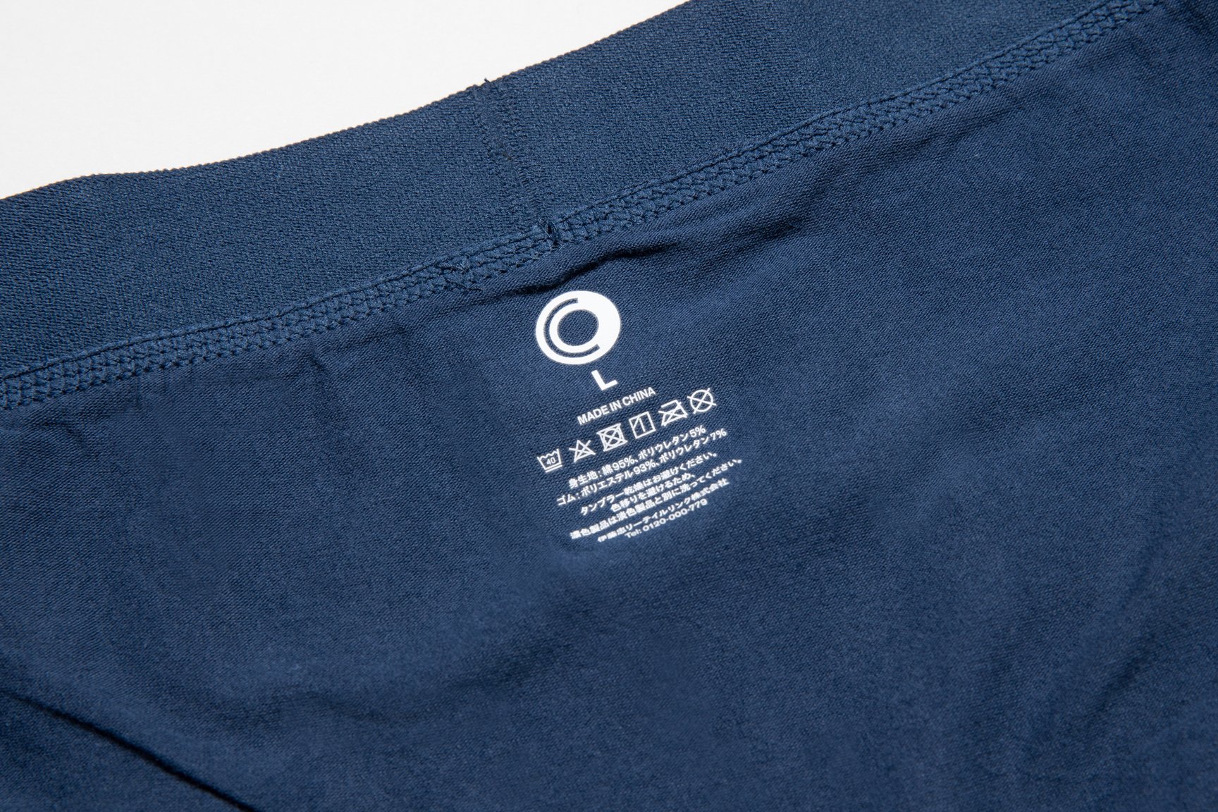 ボクサーパンツ同様に、ウエスト部分にロゴとサイズ表記、取り扱い絵表示をプリントしています。