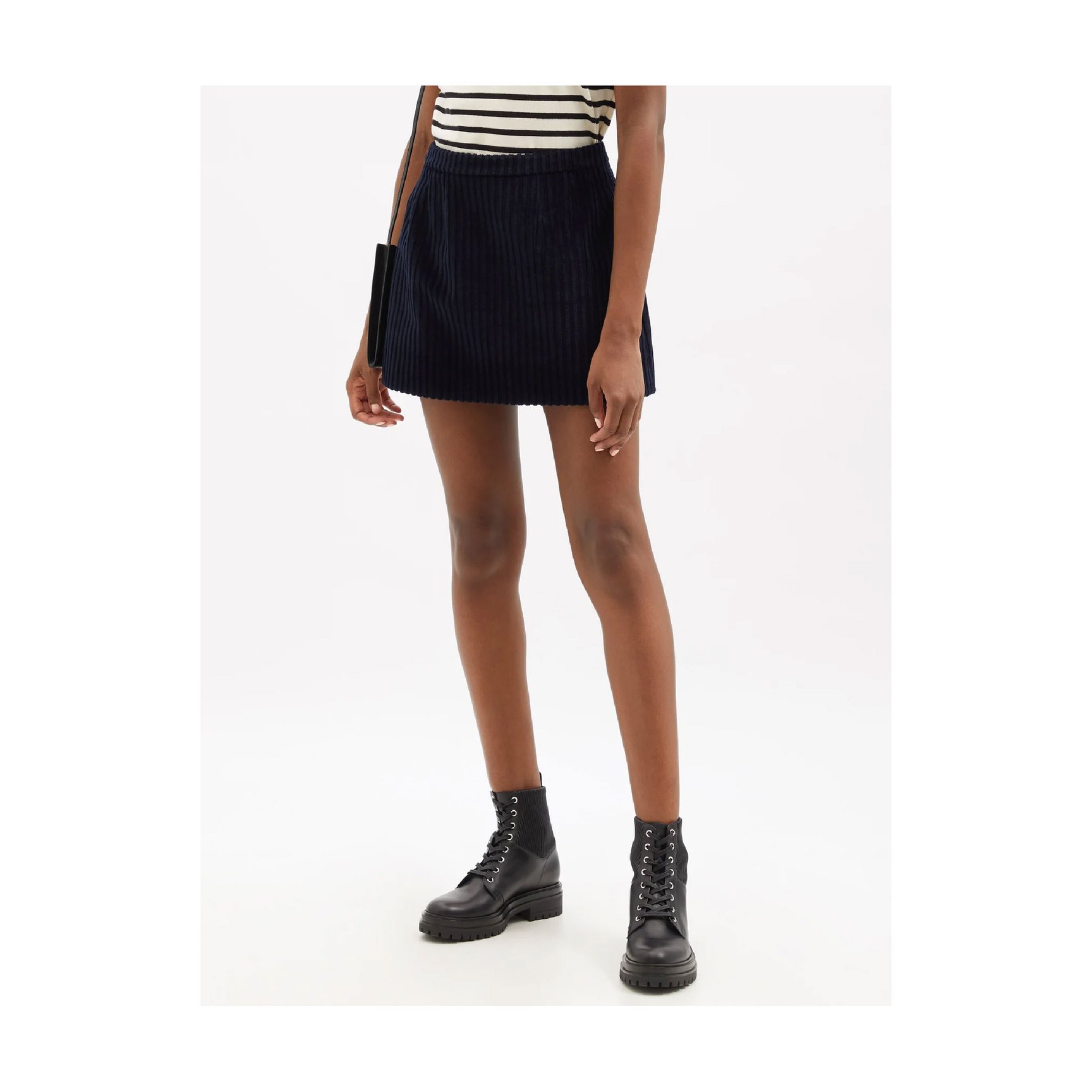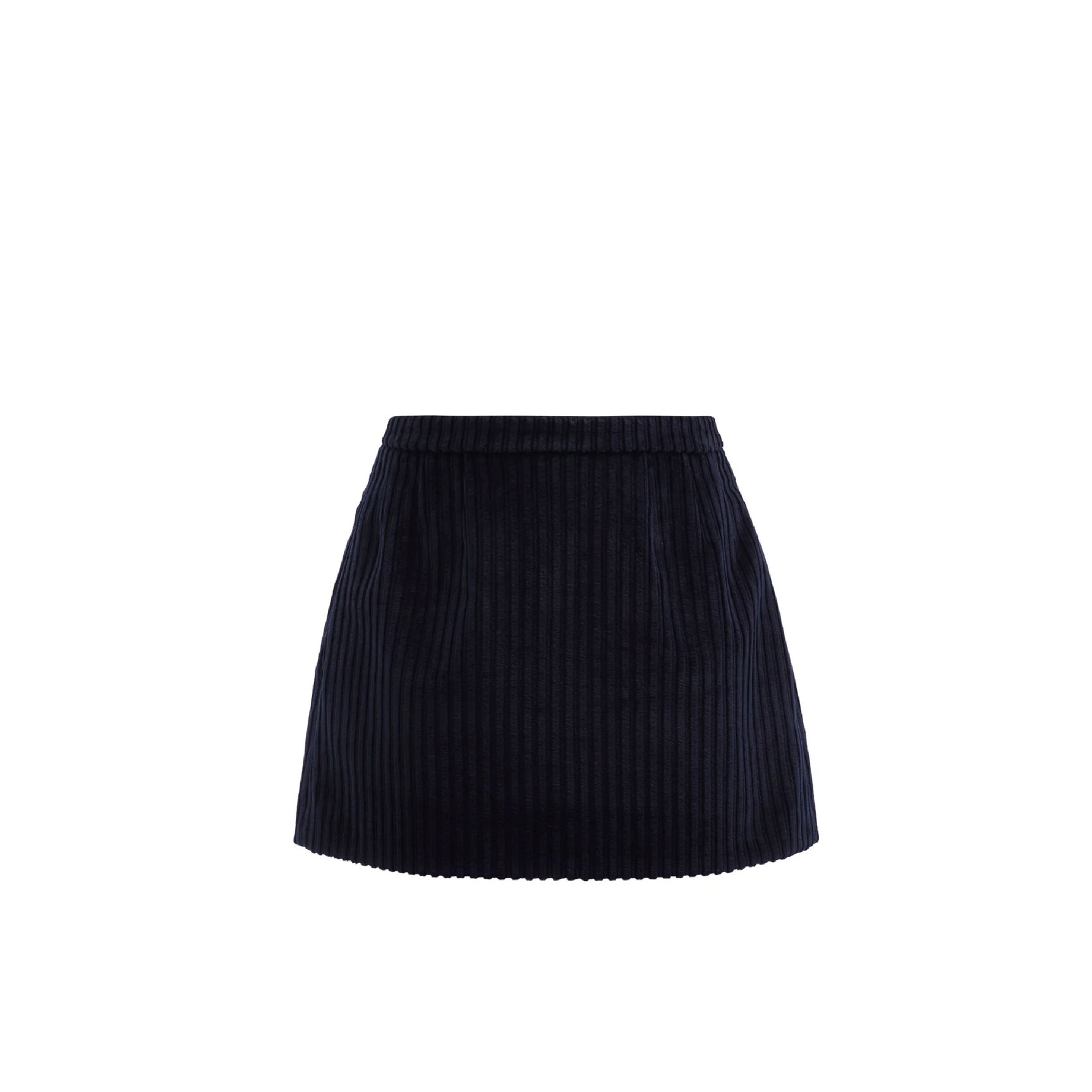 上質なコットンコーデュロイを用いた「レッド・ヴァレンティノ(RED VALENTINO)」のネイビースカート。ゆるやかに広がるミニ丈シルエットが特徴的で、カジュアルにもシックにも着こなせます。秋コーデに欠かせないブーツとの相性も抜群。