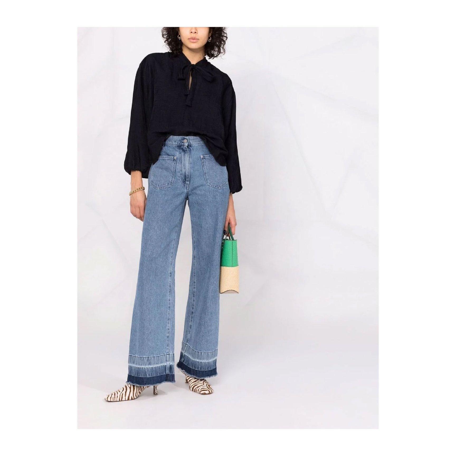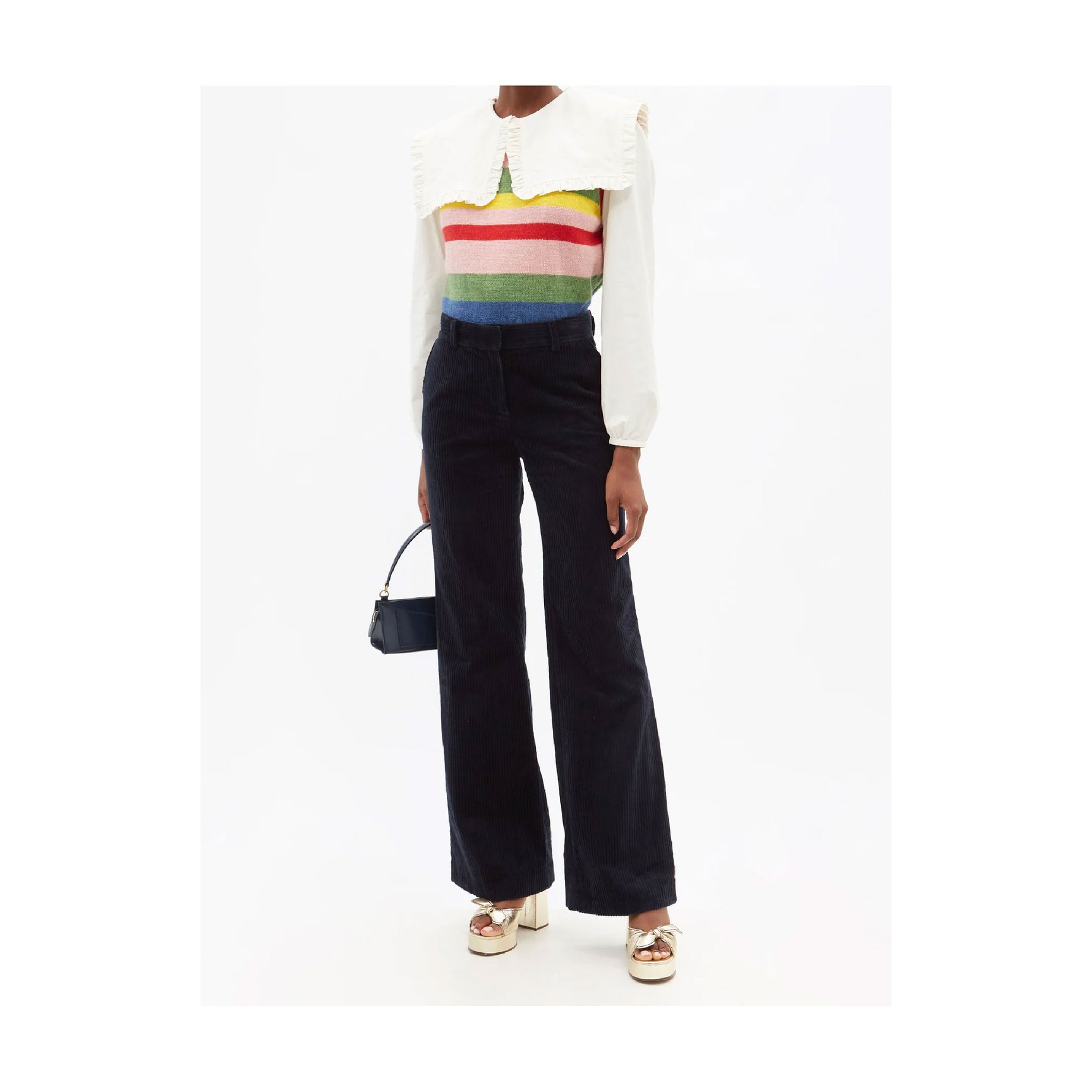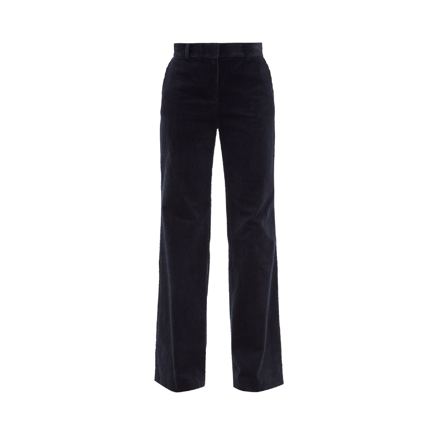 1970年代に着想を得たブーツカットレッグのコーデュロイパンツは「ベラ・フロイド(Bella Freud)」のもの。ブーツカットの美しいシルエットが特徴、ネイビーなのでどんなトップスにも合わせやすい点もおすすめポイントです。