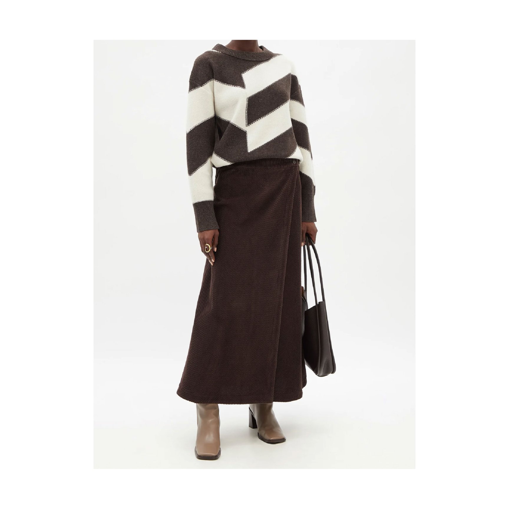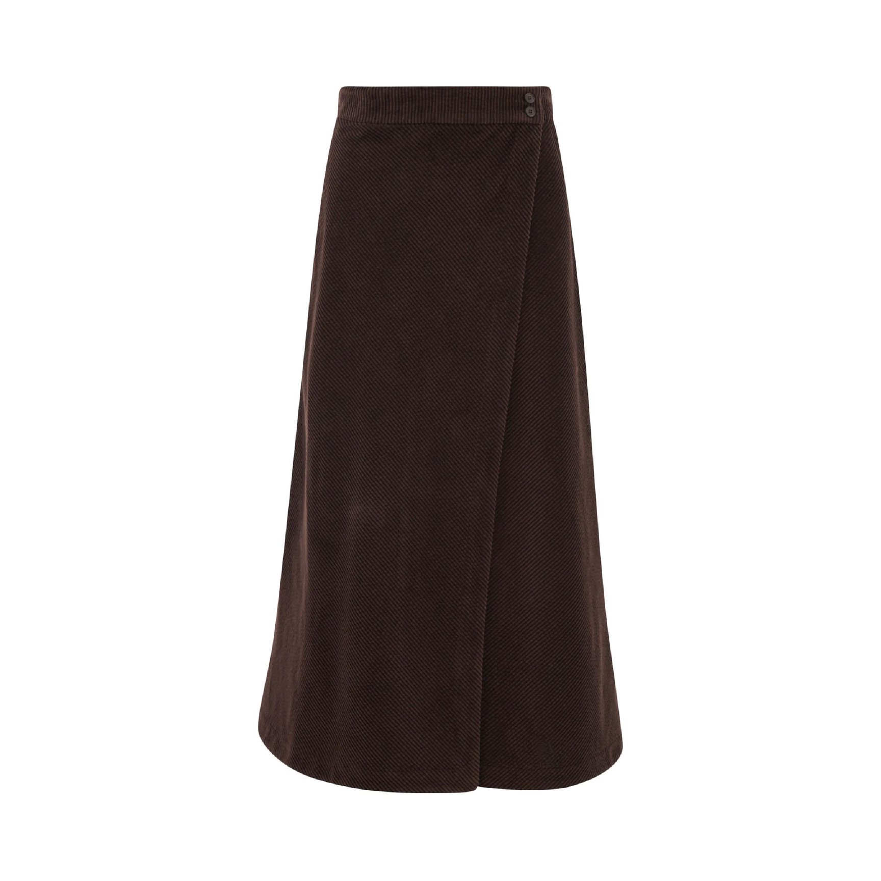 「スリー・グレイス・ロンドン(THREE GRACES LONDON )」のブラウンミディスカートは、ボタン留めのハイウエストを配したラップシルエット仕立て。深みのあるブラウンカラーで、秋ルックを楽しんで。