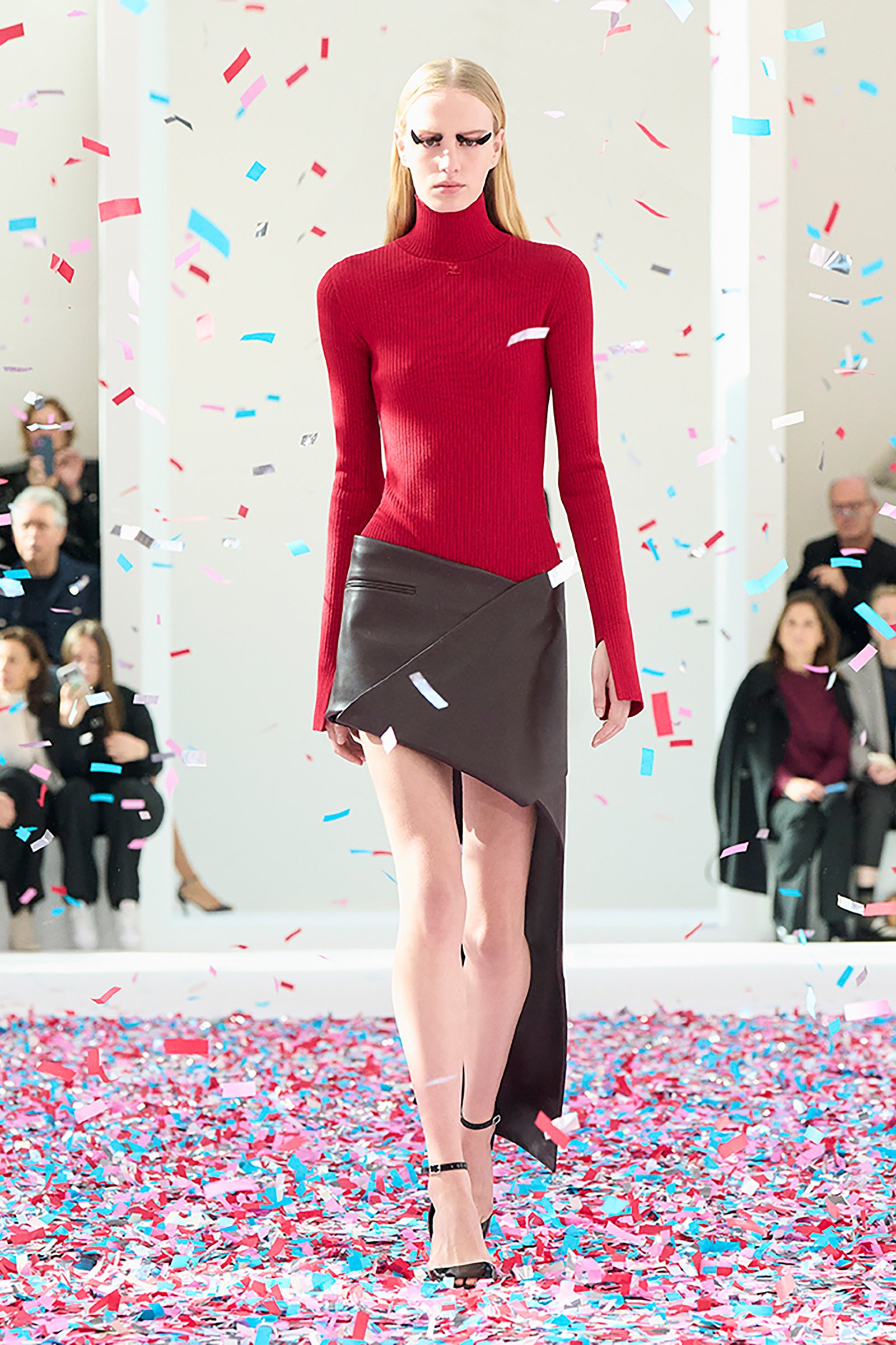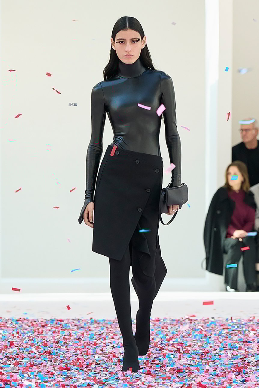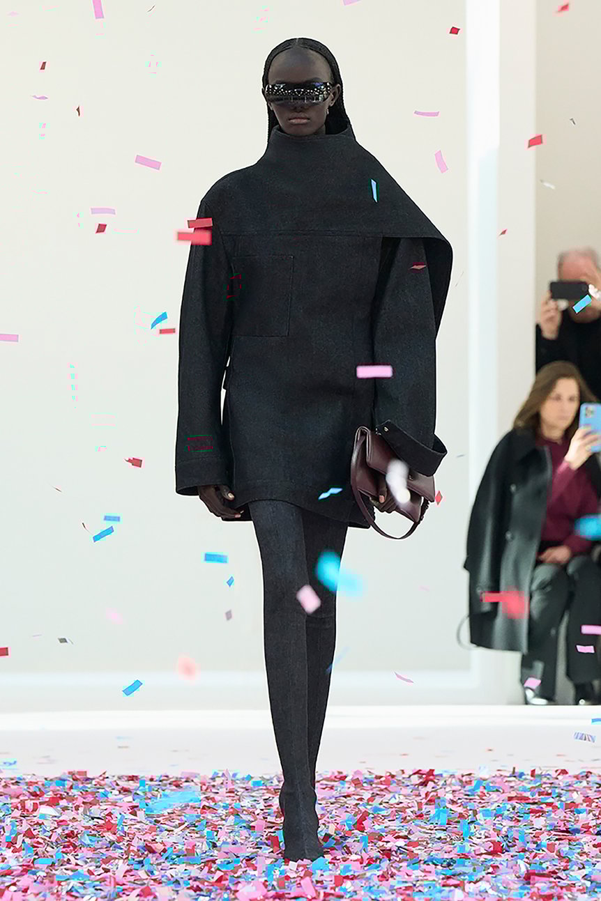 ショーがスタートすると、中央の床から風が吹き出し、紙吹雪が軽やかに舞い上がる。それは飛び散ってしまうのではなく、宙に留まり続け、カラフルな立方体を形成した。そこへ、黒い布を一枚巻きつけたかのようなモデルが突入する。ミニマルでありながらスペクタクルなこの演出は、アメリカのアーティスト、ダン・コーレン(Dan Colen)の作品集「Moments like This」に着想を得たものだという。一瞬を凍結するようなこの視覚的効果は、ジェスチャーを重んじるクレージュのアティチュードとも響き合う。