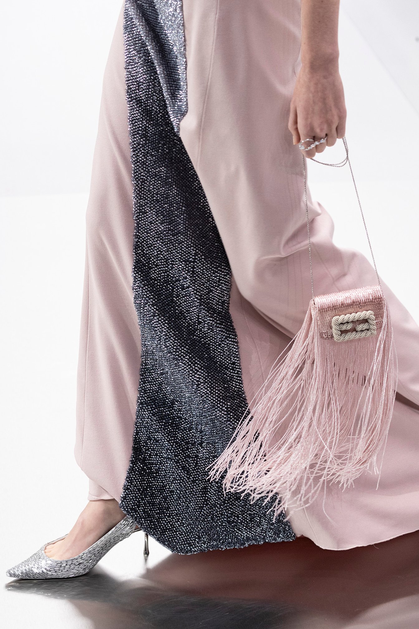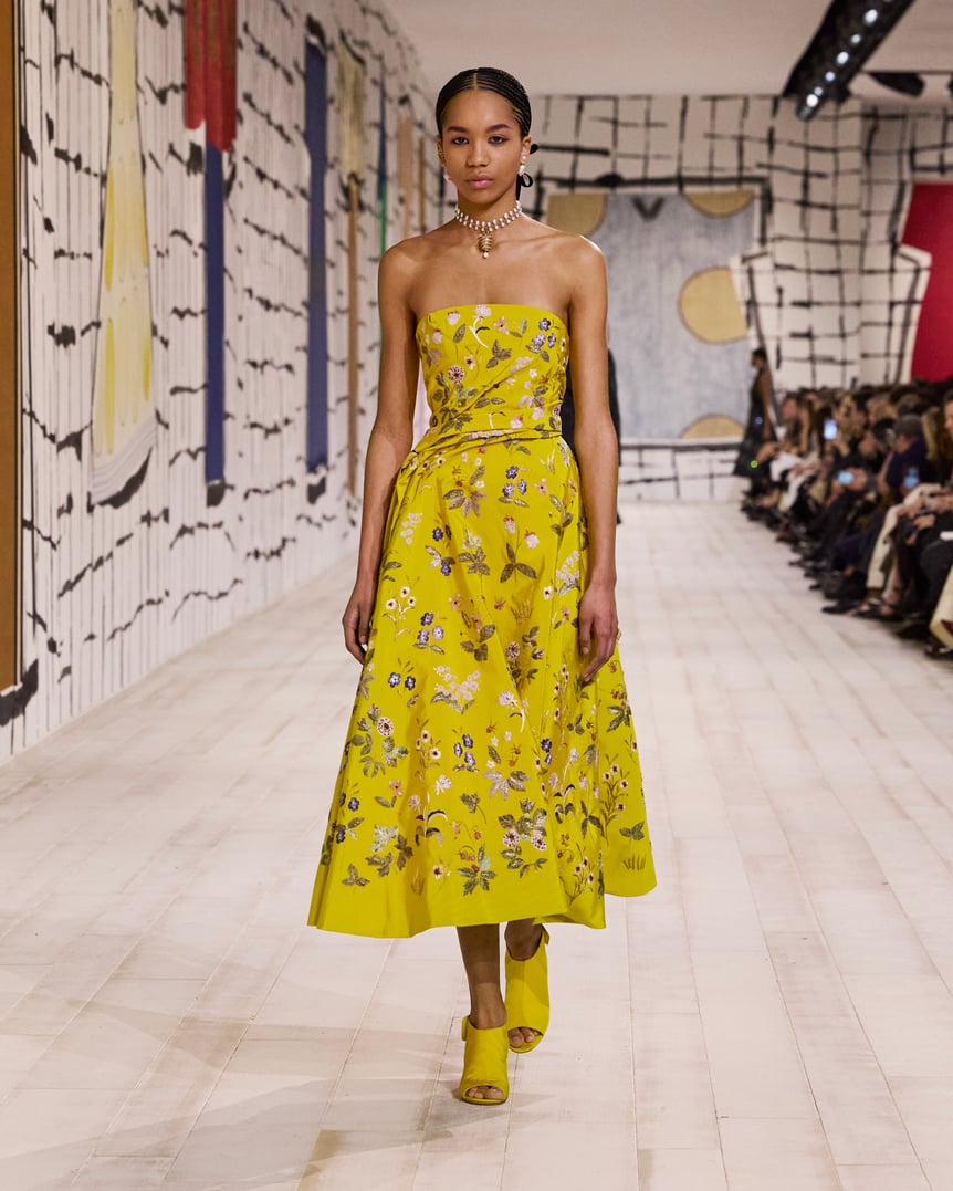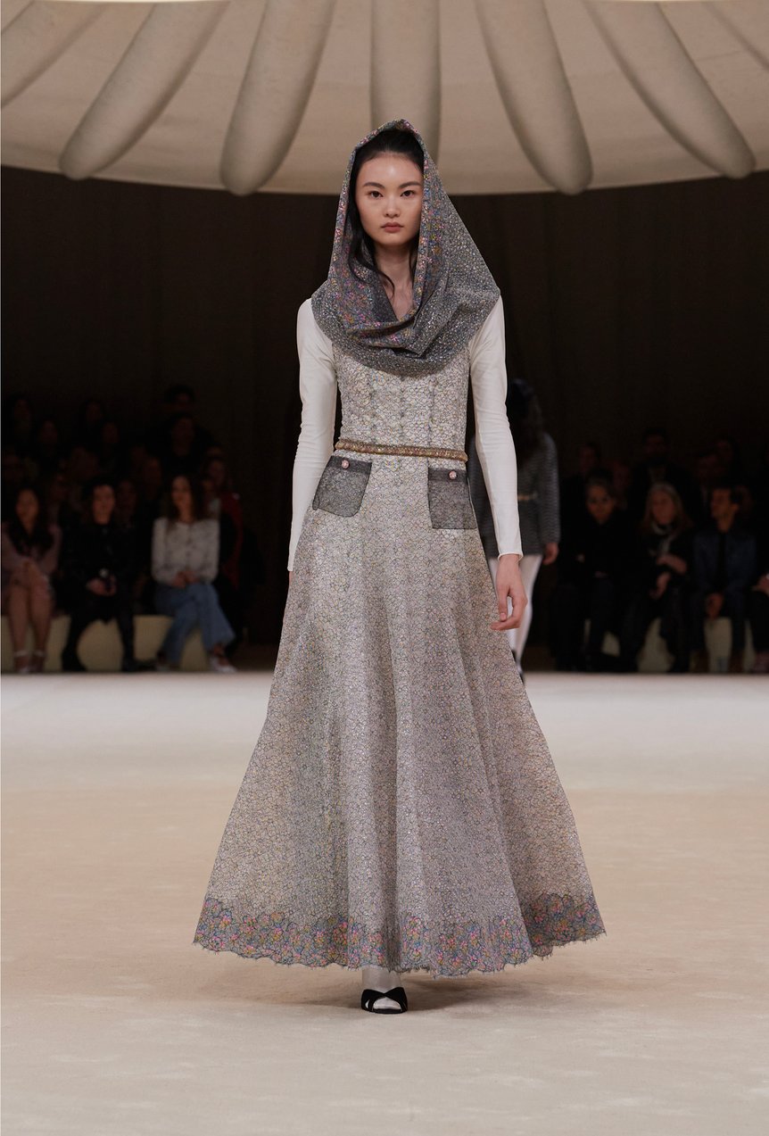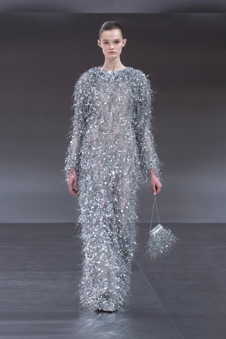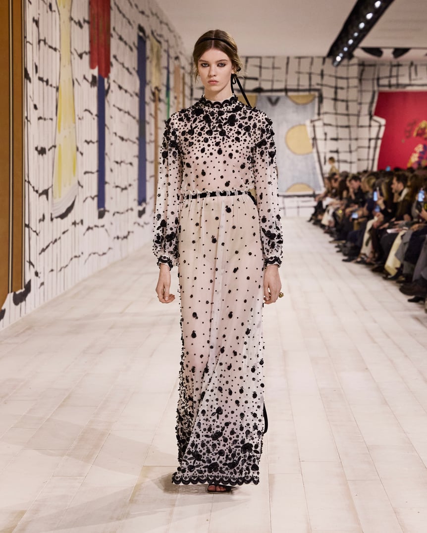 「ディオール」を手掛けるマリア・グラツィア・キウリ(Maria Grazia Chiuri)は、2024年春夏オートクチュールコレクションに「アウラ」の概念を反映させた。アウラとは、ドイツの思想家ヴァルター・ベンヤミンの定義によると、芸術作品の独自性と真正性を反映するもの。マリア・グラツィアは、メゾンの歴史を辿り1952年秋冬オートクチュール コレクションの「ラ シガール」ドレスに着目。彫刻的なシルエットやモアレ生地を現代的に再解釈し、ドレスやセットアップを仕立てた。終盤はミレフィオリ(幾千もの花々)モチーフの刺繍、ビーズフリンジなど、繊細な装飾がイブニングドレスを飾った。