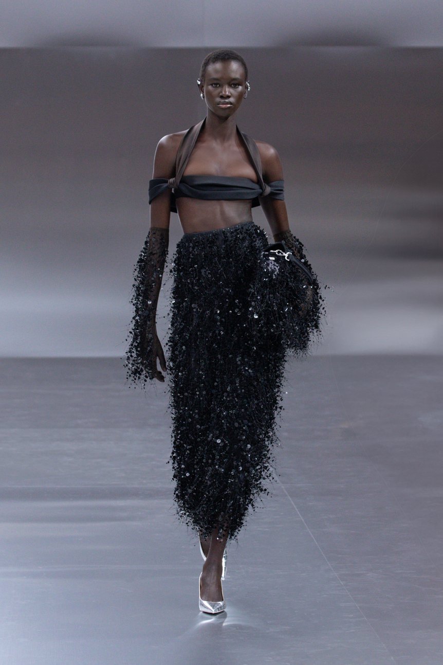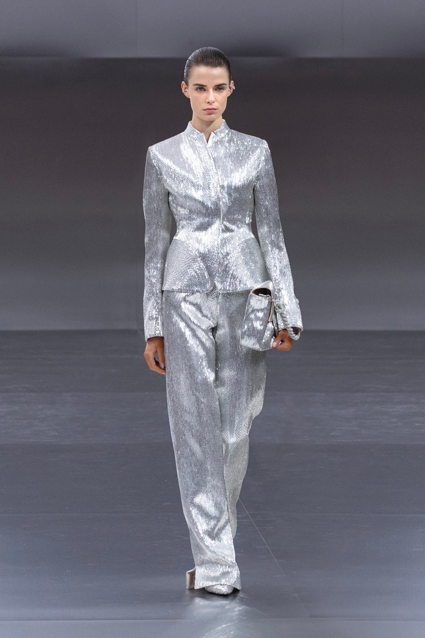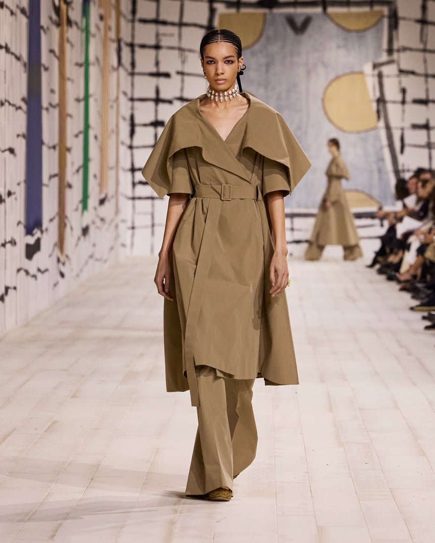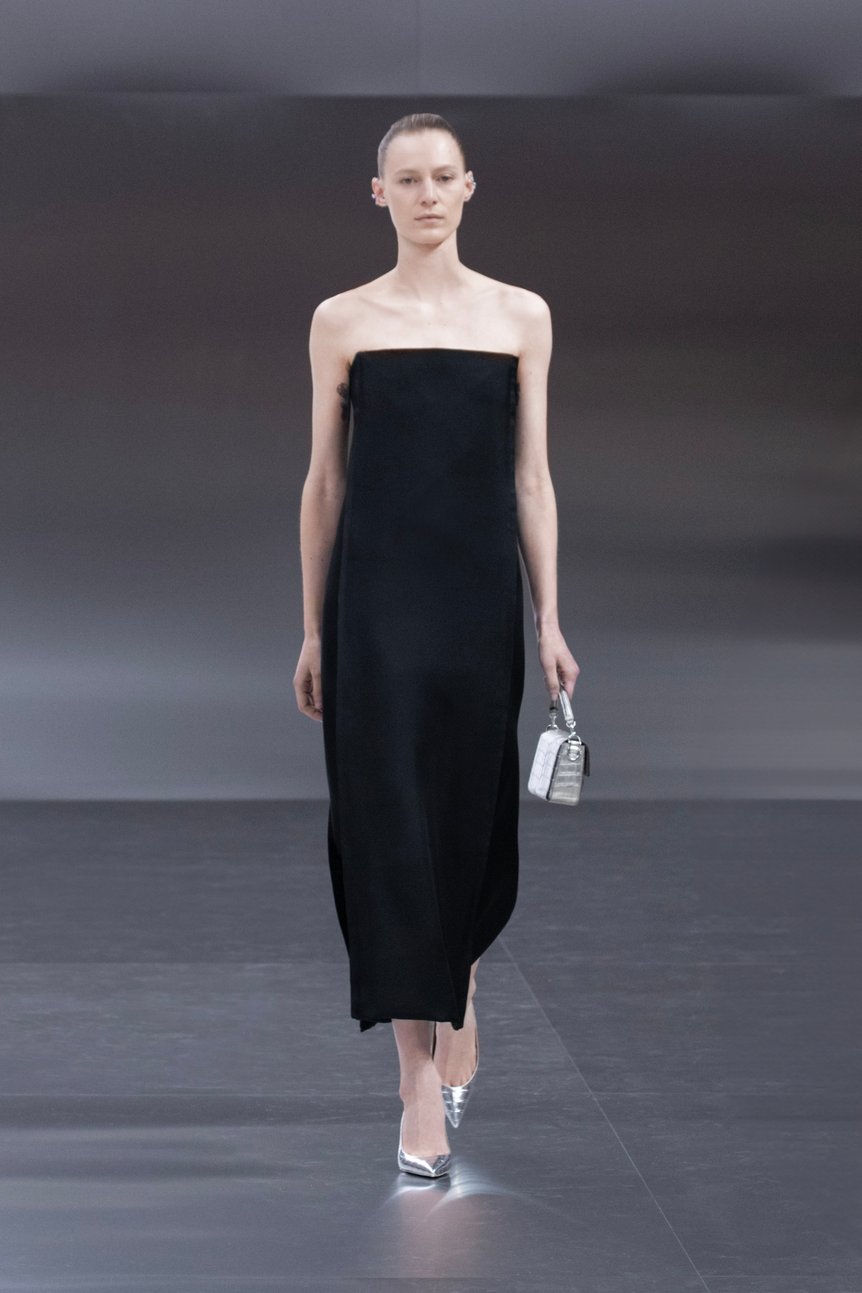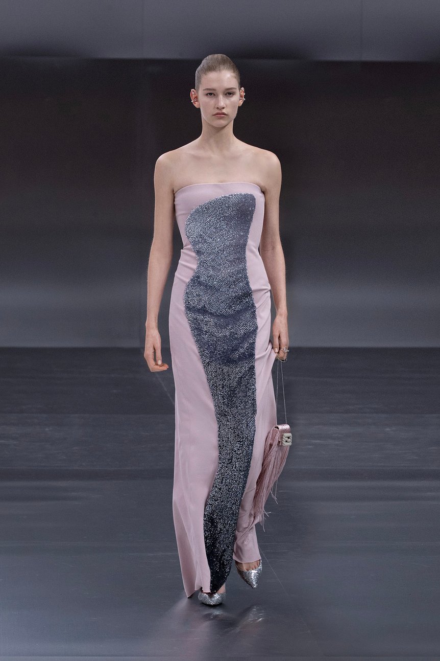 箱を意味する「スカトラ(Scatola)」シルエットのブラックドレスで始まったコレクションでは、フューチャリズムとヒューマニズムに焦点が当てられた。アーティスティック ディレクターのキム・ジョーンズ(Kim Jones)は、構造と装飾の結びつきをテーマに、精密さと情緒を同時に表現することを試みたという。幾何学パターンのミニマルなドレスや女性の身体に沿うテーラードスーツ、そして「シバリ(Shibari)=結び目」が施された上質なリブ編みのドレスなど、人間性を再認識するコレクションが発表された。