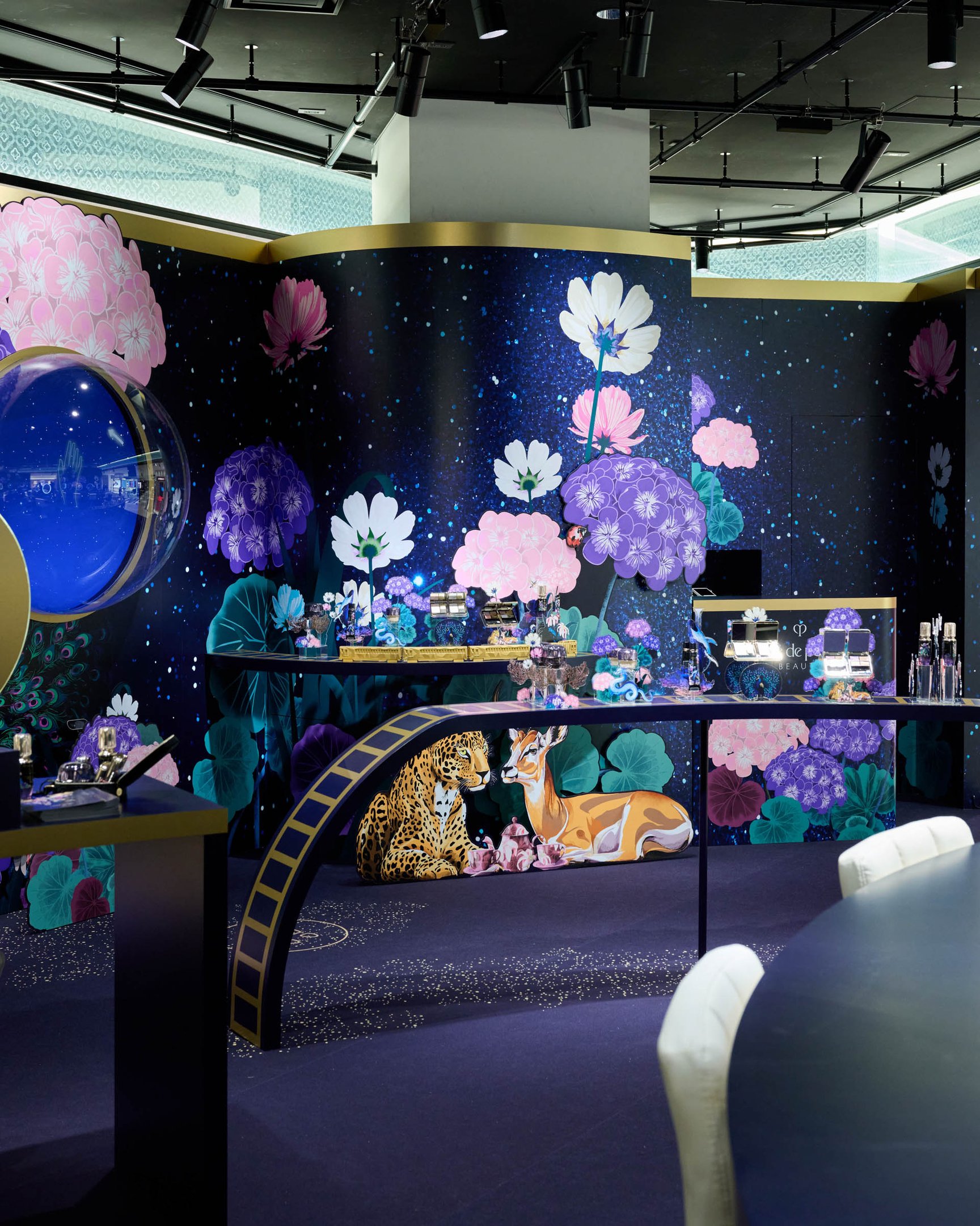 ホリデーコレクションの「列車に乗っていろんな動物に出合う」という世界観が、この空間に広がっていて、幻想的でとっても素敵だと思いました。ネイビーとゴールドが上品で華やかな雰囲気を作り出していて、ホリデーのわくわくしたムードを感じました。