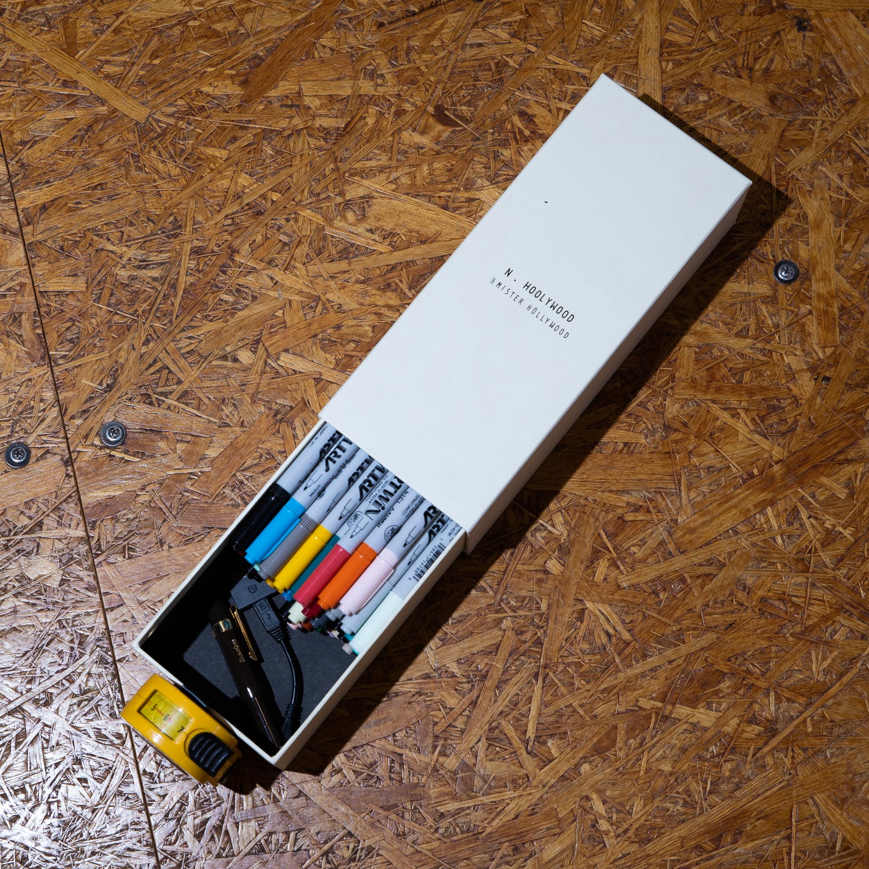 尾花が普段デスクで使用している愛用品。UNDER SUMMIT WEAR初期のボックスにカラーペンなどを収納。メジャーは必需品。「場所の間切りが悪かったり、空間づくりが下手なヤツが嫌い」という尾花の性格が現れている。