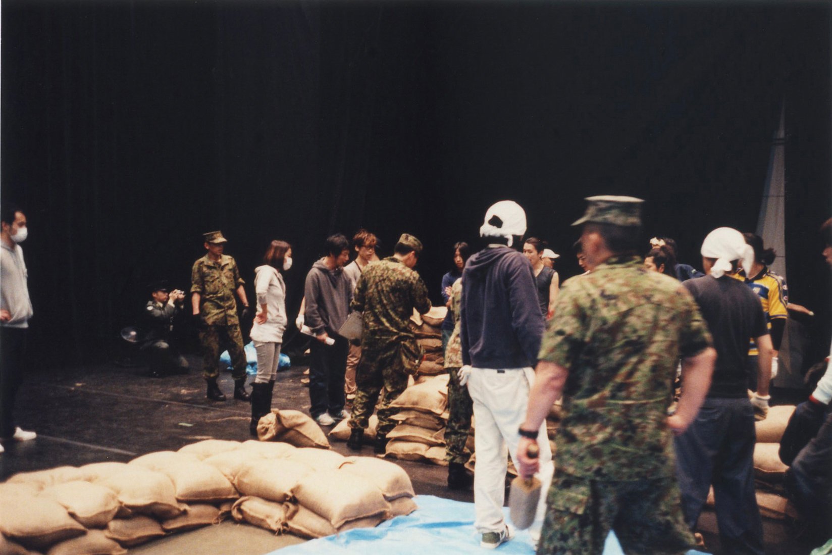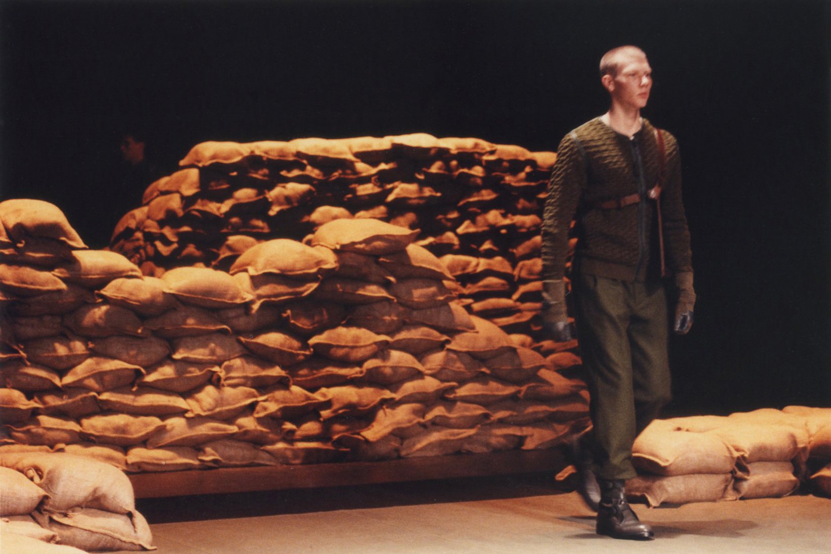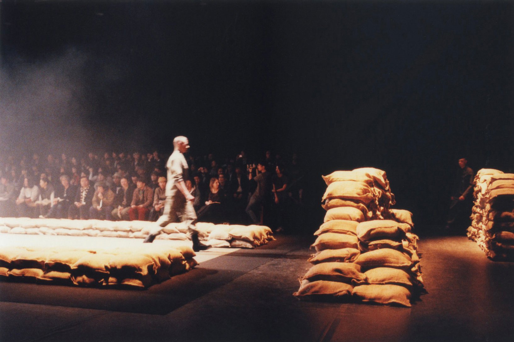 日本でのラストショーとなった2010-11年秋冬「COVERAGE」。自衛隊の協力を得て、軍用の土嚢を実戦仕様に組み上げた。