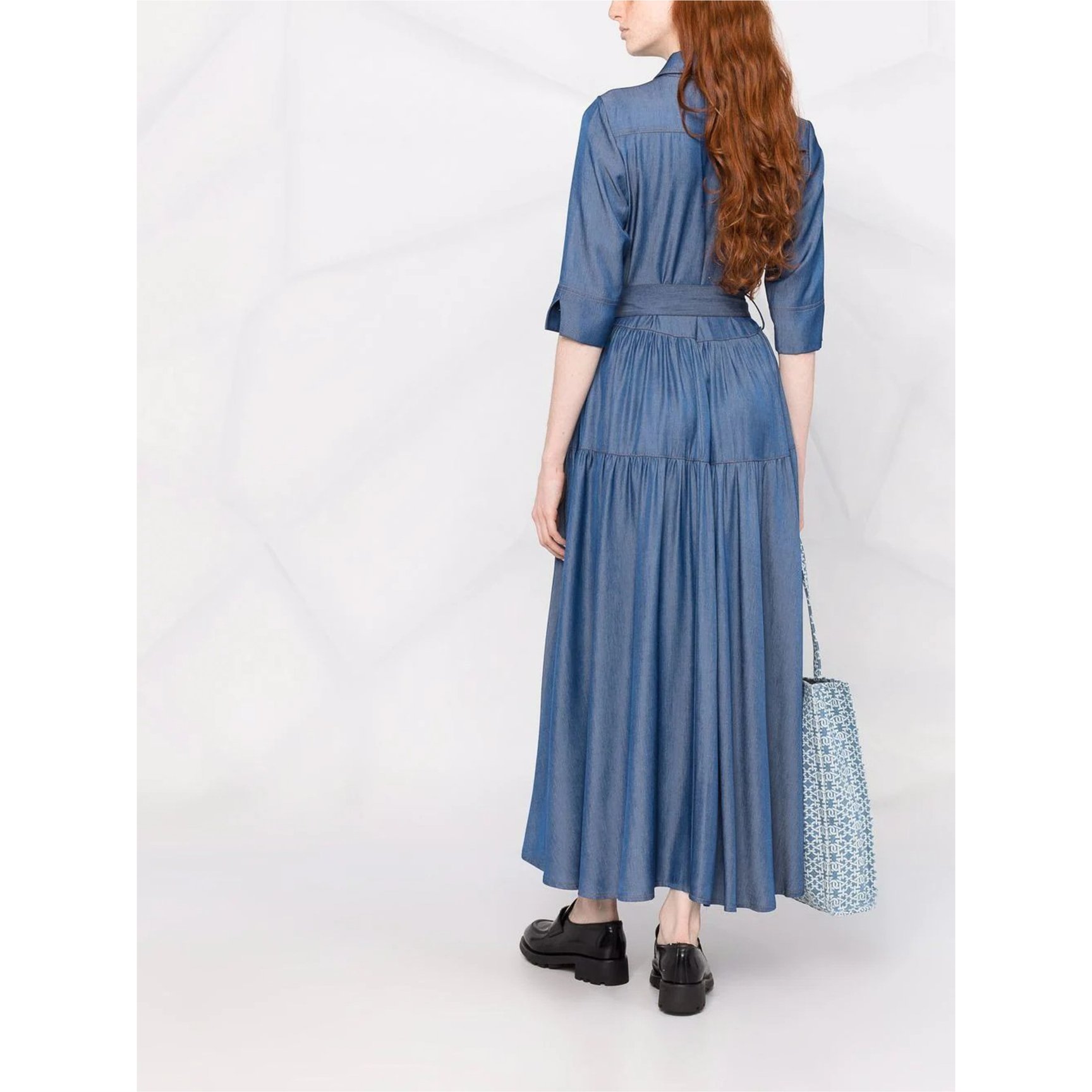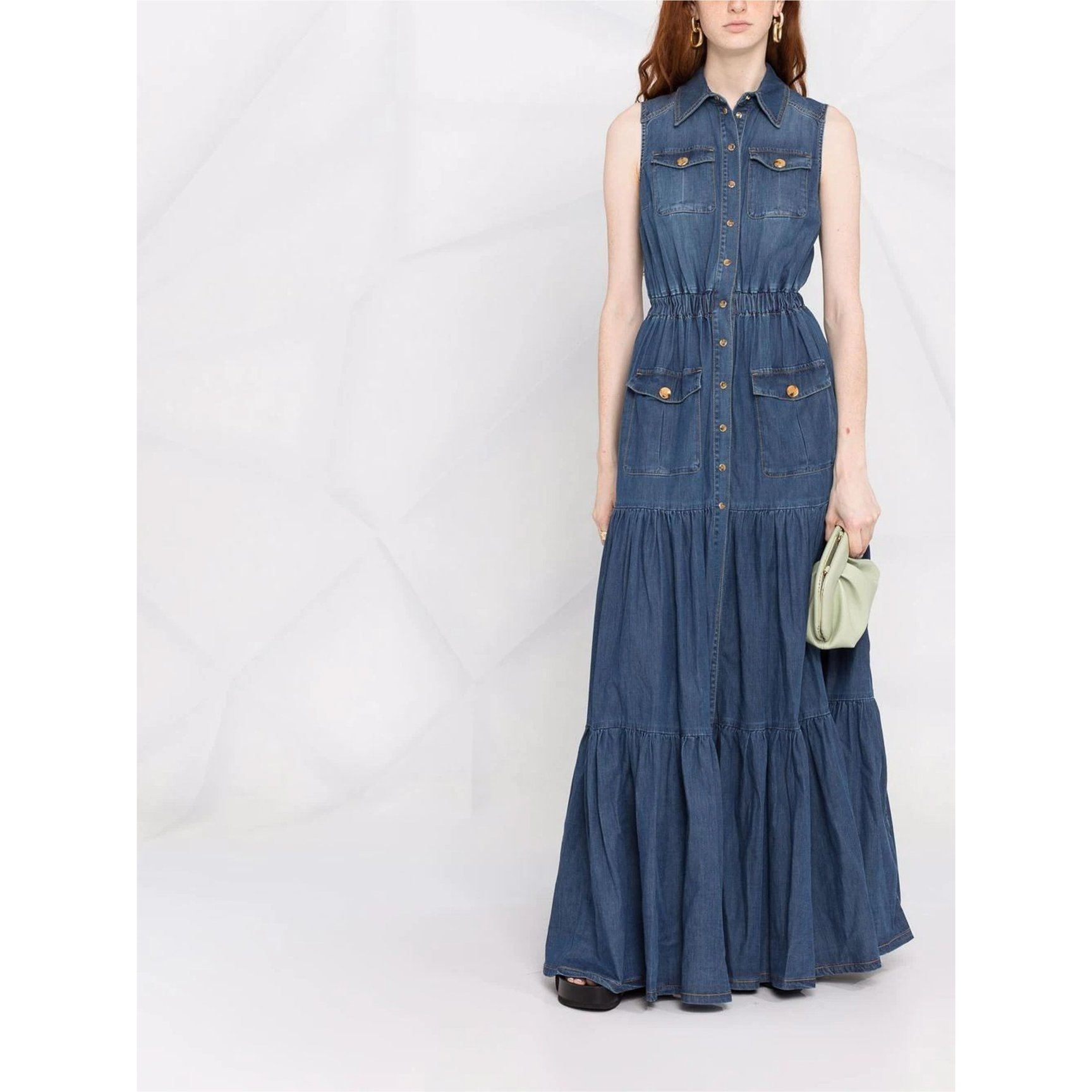まず最初にご紹介するのは、美しいドレープとシルエットに目を見張る「エリザベッタ・フランキ(Elisabetta Franchi)」のノースリーブデニムドレス。計6つも装備されたポケットは実用性とデザイン性を両立し、メイド・イン・イタリーのポリシーが詰まった質の高い一着は、身にまとうたびに心躍ります。