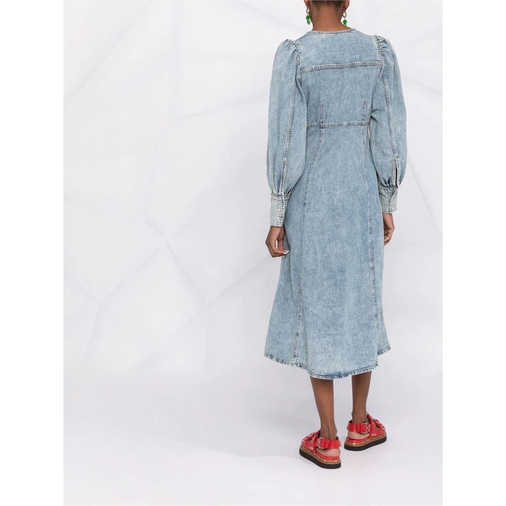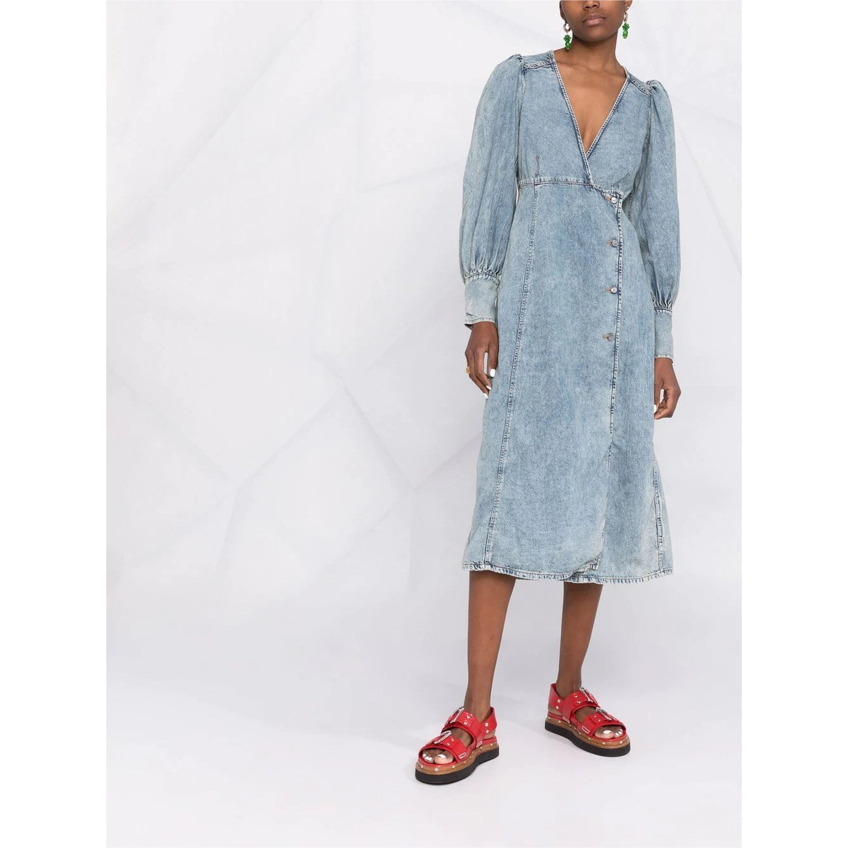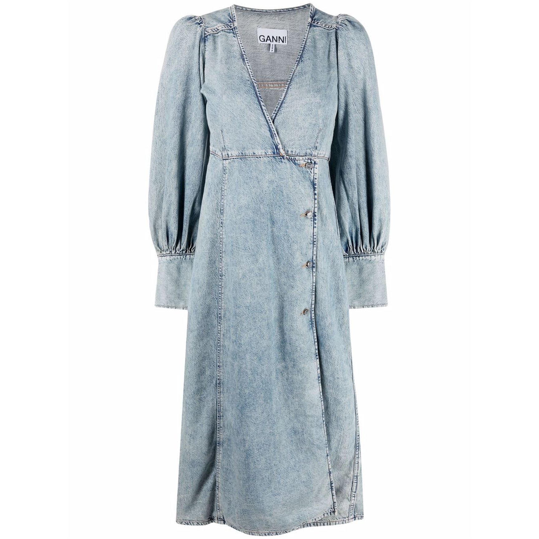 ラフなカラーのデニムワンピースに、レディなVネックとラップスタイルを取り入れた「ガニー(GANNI)」。バルーン袖がアクセントになった、春夏シーズンに映える一着はデイリーにもバカンスにもぴったりなアイテムです。