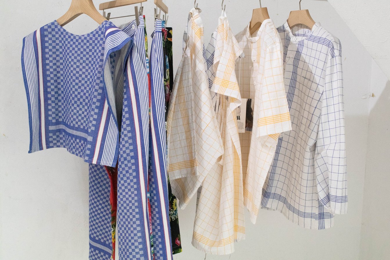 カフェのキッチンでは、お皿や手を拭いたり、商品を包んだり、様々な場面で色々なタオルを使っていました。そういったタオルを着られたら可愛いし便利だなと思い、既製品の新品のキッチンタオルを使ってユニフォームを作ったのが始まりです。ここで思いついた「もともと存在する布製品を使う」というアイデアは今のスタイルにも影響を与えていると思います。