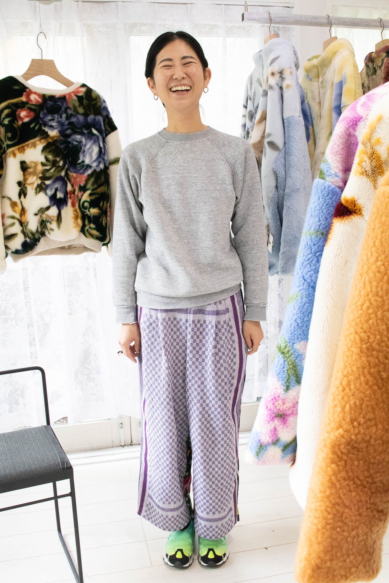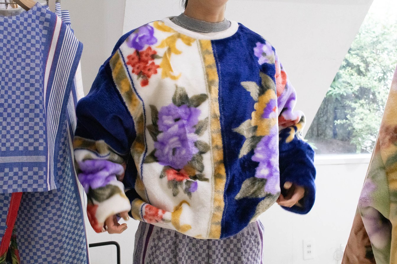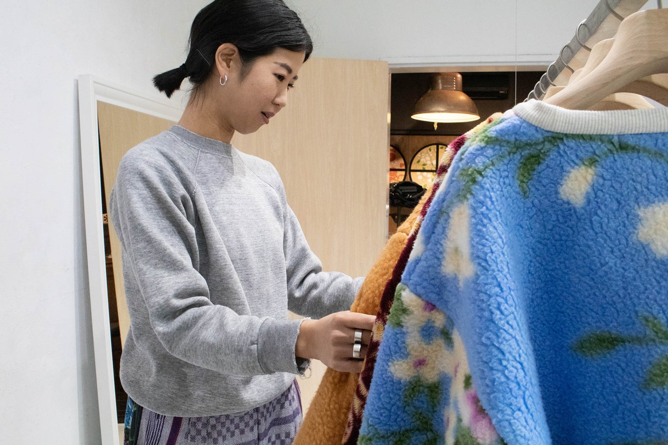 ジモティーで譲ってもらったり、フリマサイトで買ったり、誰かにとって「もういらなくなったもの」を使っています。(熊柄の毛布を使ったプルオーバーを指しながら)この毛布を譲ってくれた人は普段は京都の「平安蚤の市」で古物を出品されている方だったりと、時には過去の持ち主と直接会って受け取ることもあります。
