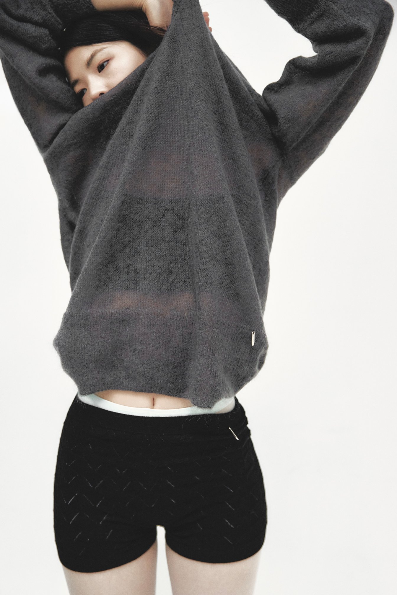 杉田:「隠してない」という印象は特に強かったです。例えばVネックのニットは170cm弱の僕が着てもお尻がすっぽり隠れるくらいの丈感。一般的にこの丈感はお尻のシルエットを隠す機能もあると思いますが、これは大胆なシースールで全然隠れないですね。