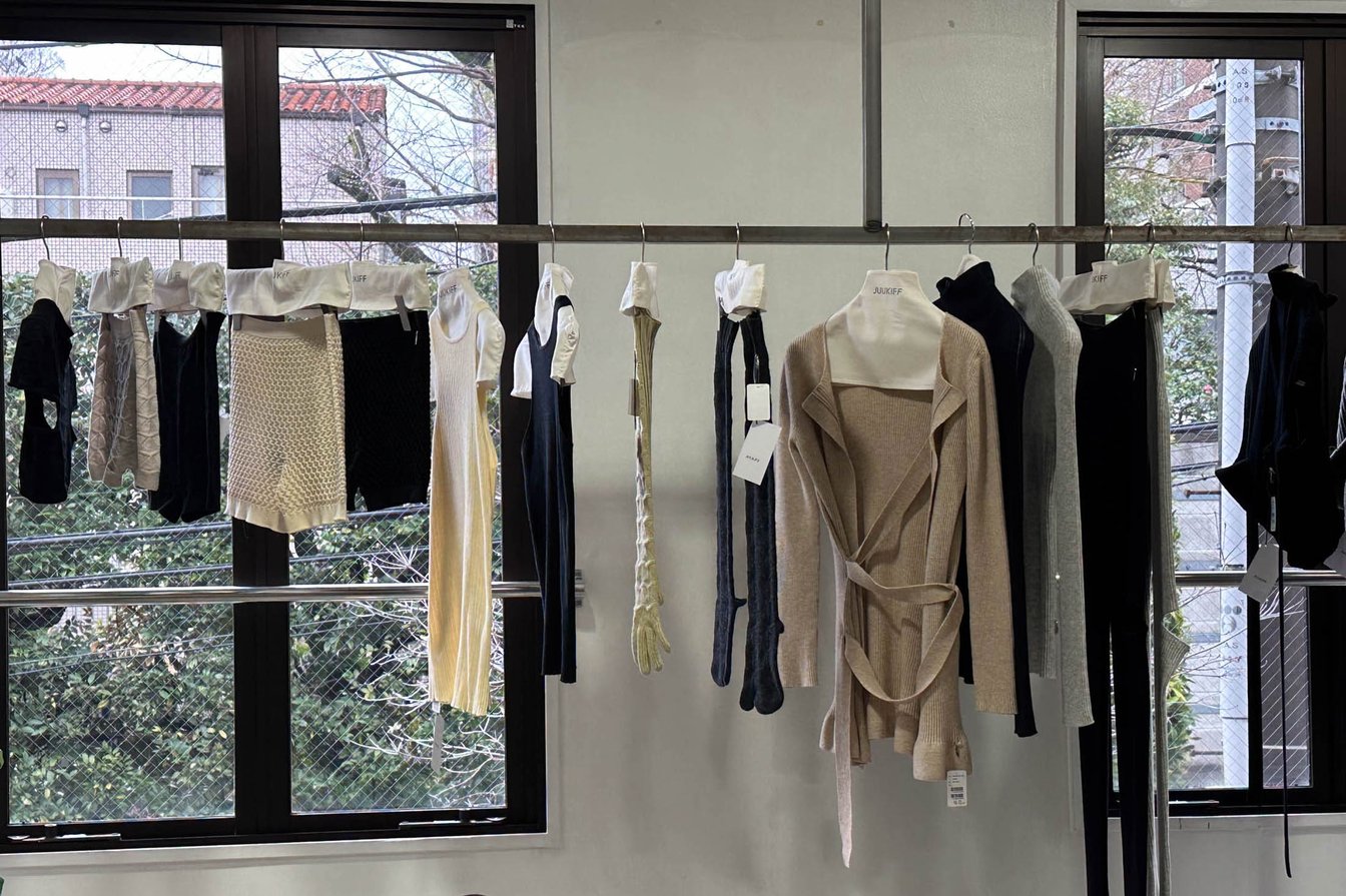 第4回は、「ジューキフ(JUUKIFF)」ディレクターのJOOMI HAとRUKA KAWAIとの鼎談。ジューキフは2021年にHAがアンダーウェアブランドとして立ち上げ、2022年にKAWAIが共同ディレクターとして加入。「ファッションと環境のバランスを追求する」という命題を掲げながら、ニットウェアブランドとして新たなスタートを切っています。今回は、英・セントラル・セント・マーチンズ(以下セントマ)のニット科出身でもある二人が、タッグを組んで2シーズン目となる2024年秋冬シーズンの展示会会場を尋ねました。
