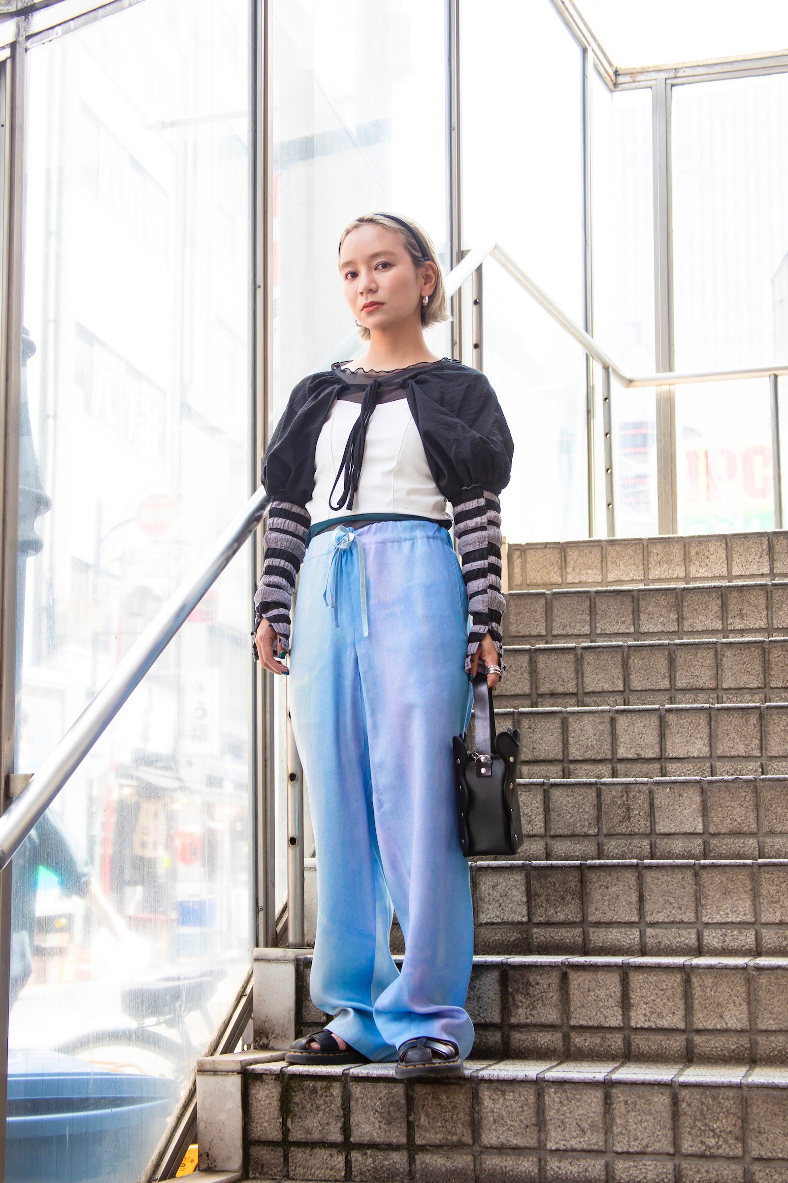 「ウジョー(UJOH)」からは佐々木香菜子さんとのコラボレーションによるプリントパンツをチョイス。光沢のある滑らかな肌触りのサテン生地を使用し、ドレープ感のある上品な印象に仕上がっています。トップスはタイトめにするとトレンド感あるモードなスタイリングに。