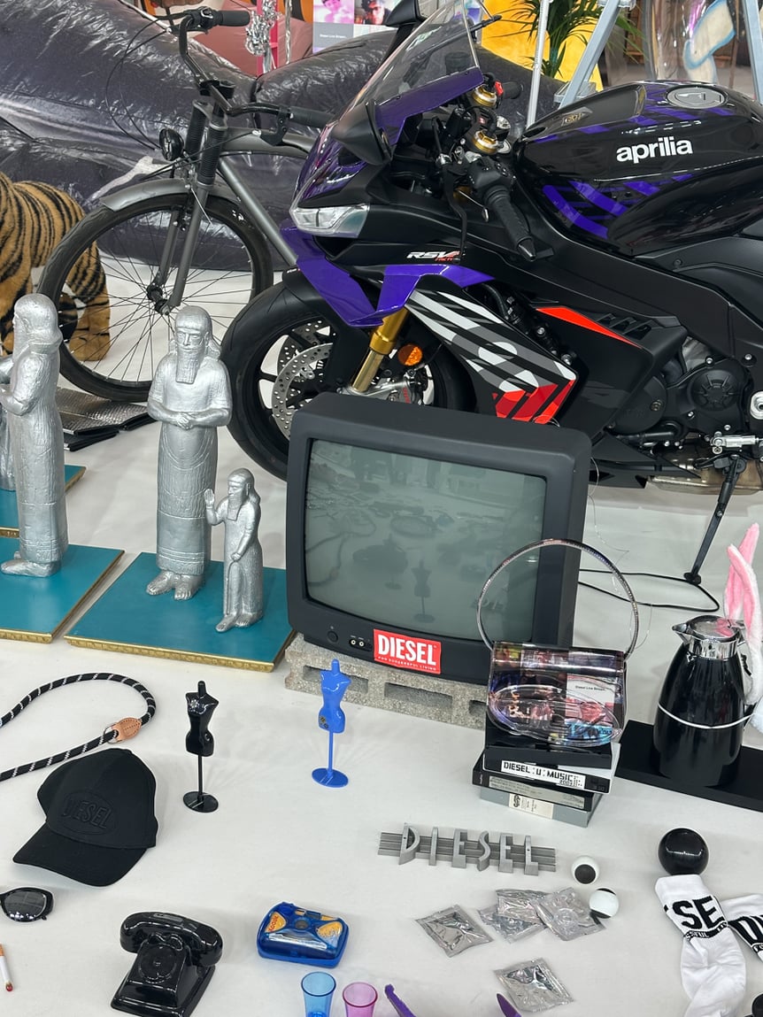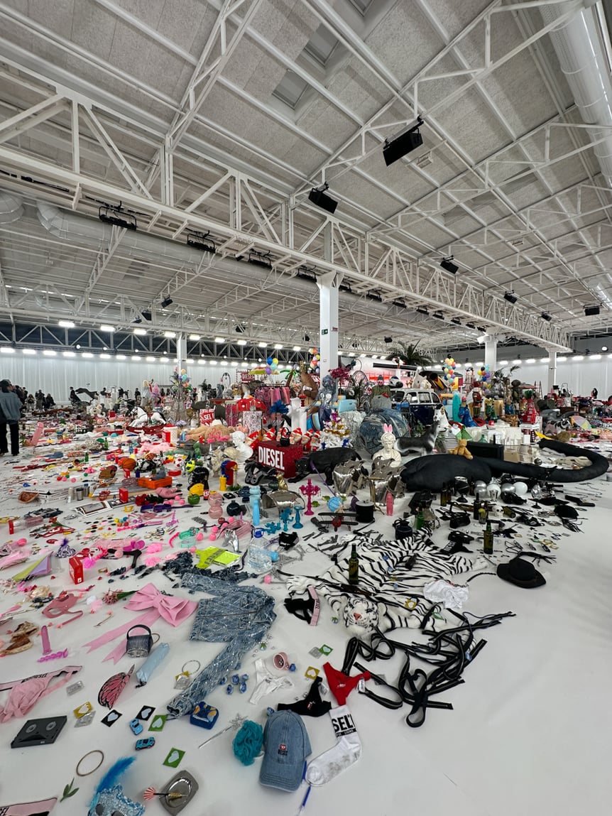 会場内には、大小様々な膨大な数のブランドのアーカイヴ品が集結。1978年以来、ショーやイベント、時にはレイブイベントや体験型コンテンツとして発表してきた際の“小道具”たちだ。ディーゼルを擁するOTBグループ会長のレンツォ・ロッソ(Renzo Rosso)氏が保管し、地下室に眠っていた約5万点の品々は、約50年にわたる、ディーゼルが行ってきた“パーティ”の軌跡でもある。