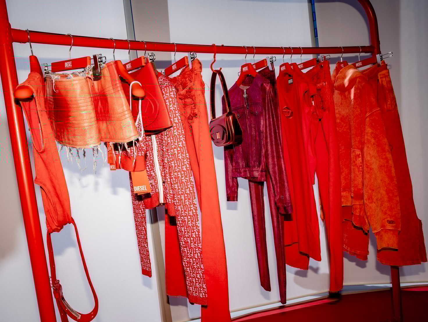 地下1階では、ディーゼルの新アイコンであるヒーロースニーカー「THE PROTOTYPE」やコレクションピースなどメンズアイテムをラインナップ。赤の樹脂でコーティングされたファニチャーや、椅子からカーテンまで赤一色で構成されたフィッティングルームなど、随所にグレン・マーティンスのこだわりを感じさせる内装に仕上がっている。