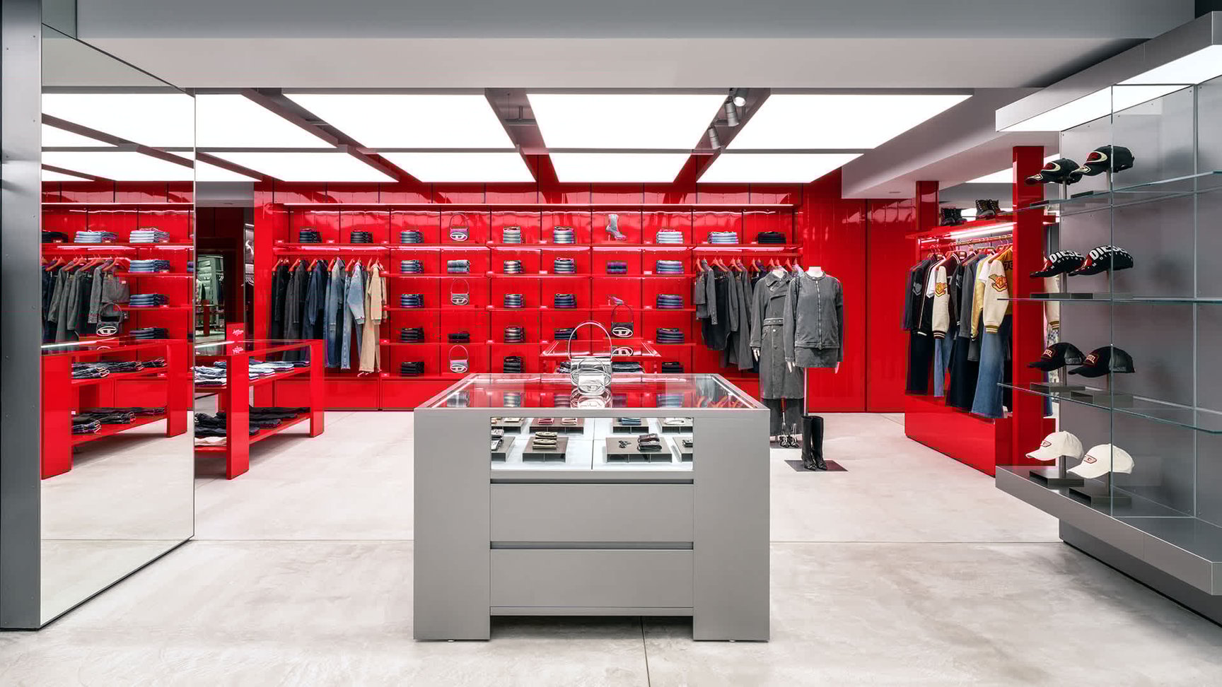 常に人で賑わう若者に人気のエリア・大名の一角に路面店としてオープンした〈DIESEL FUKUOKA〉。ディーゼルを象徴するレッドとインダストリアルなメタルシルバーを基調にした近未来的な外観と内装が印象的で、ウィメンズとメンズ、ユニセックスを2フロアで展開する。