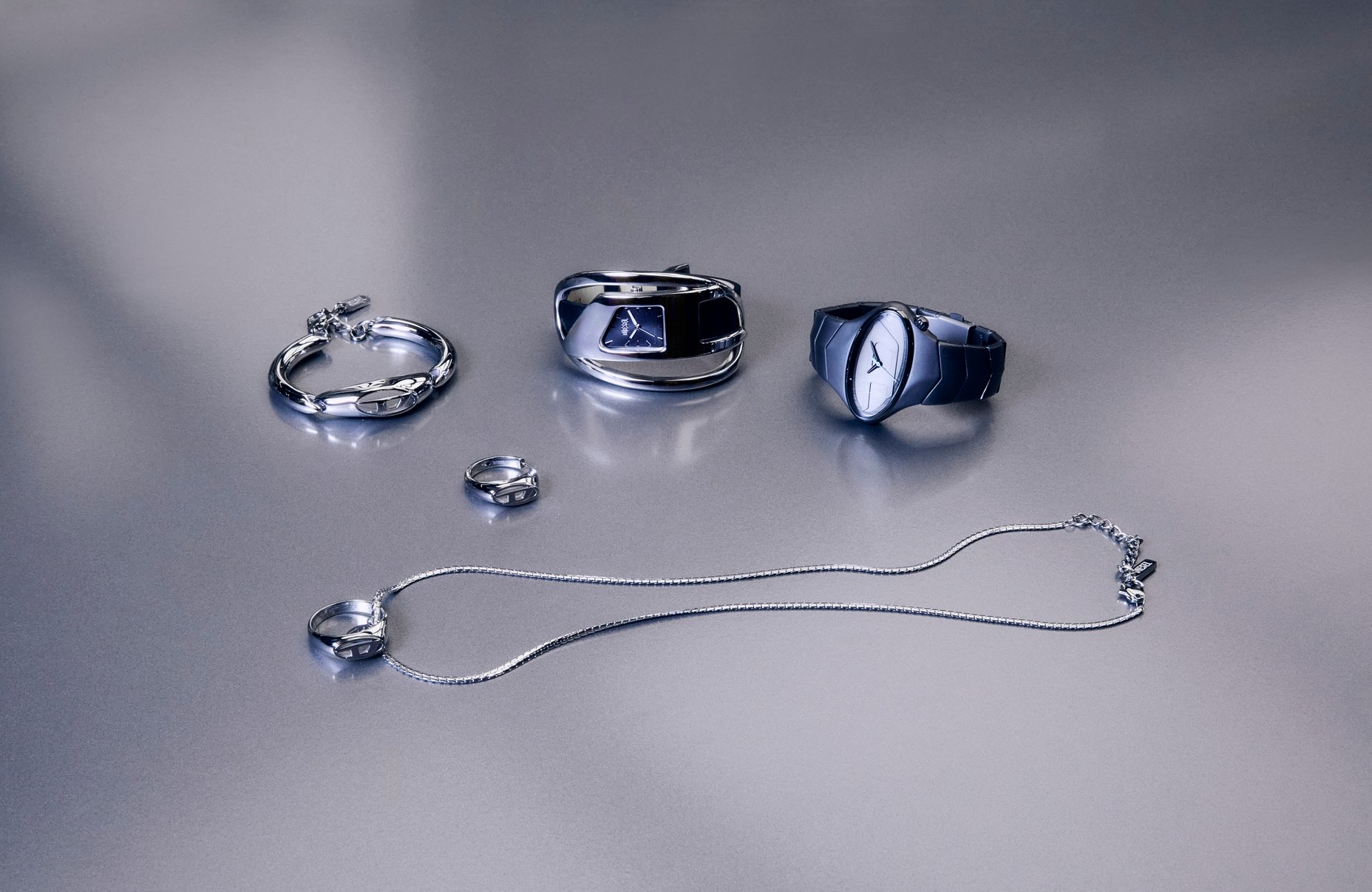 オーバルDロゴがさりげなくも存在感を放つユニセックスのシルバートーンのアクセサリーはブレスレット、ピアス、リングモチーフのネックレスとセットで身につけたい3点。(RURI着用)オーバルの文字盤にターコイズカラーの秒針とマットな質感のステンレスベルトのウォッチはネオフューチャー感漂うアイテム。(SAYAKA着用)レザーバンドとバングルが融合したハイブリッドなデザインのウォッチはそのままでも、袖口に重ねても映える。(MIYUU着用)